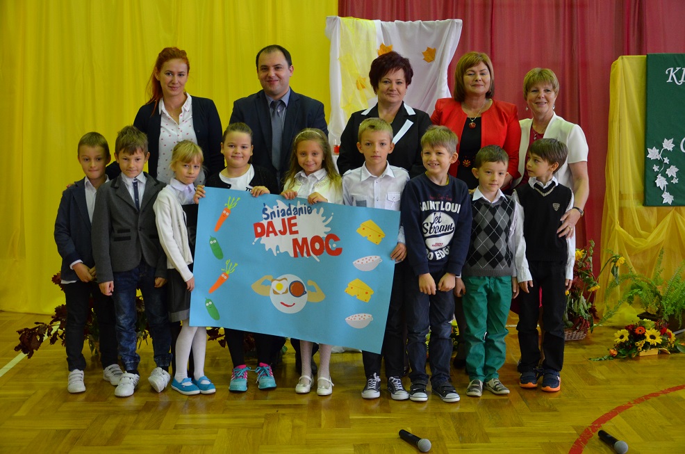 W dniu 14.10.2016 r. podczas akademii z okazji Dnia Edukacji Narodowej, dzieci z klasy II wręczyły na ręce Pana Łukasza Palarskiego – Wójta Gminy Zembrzyce oraz Pani Elżbiety Palecznej – kierownika Gminnego Zespołu Obsługi Finansowej Szkół plakat informujący o roli zdrowego śniadania.