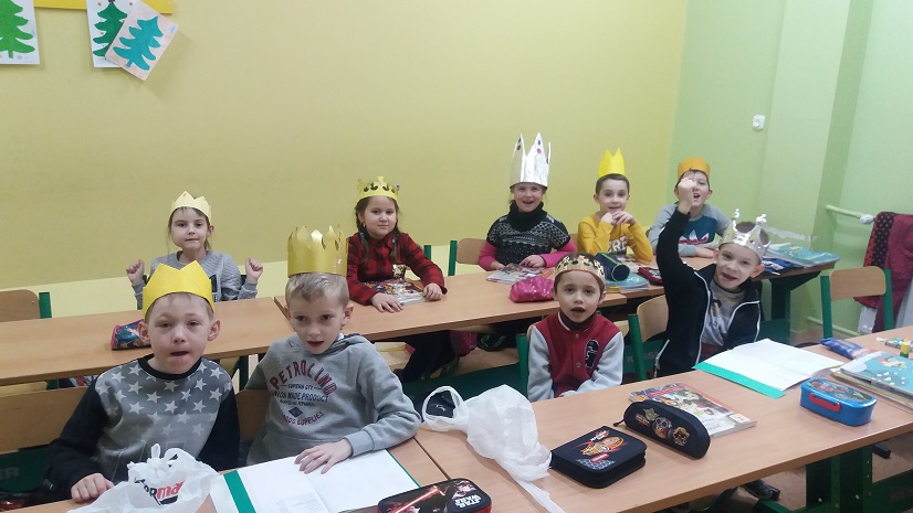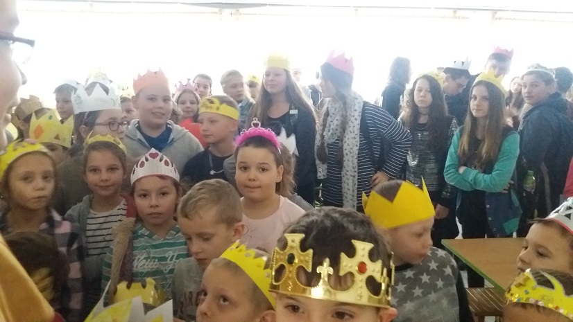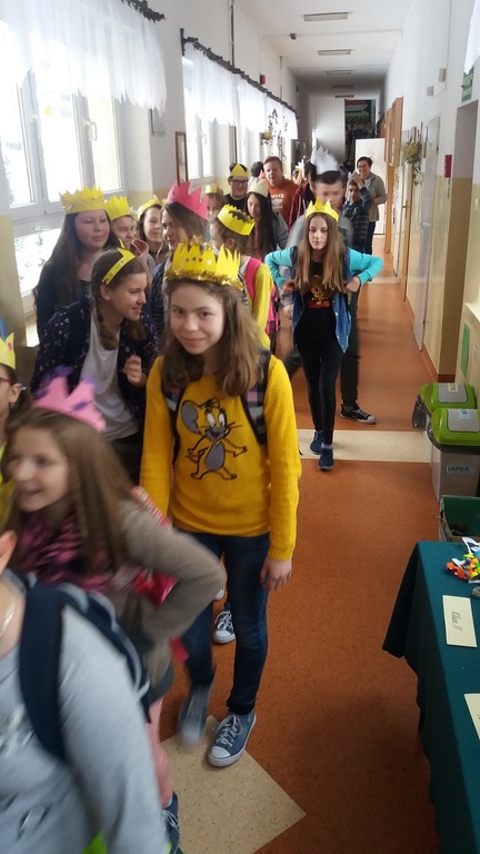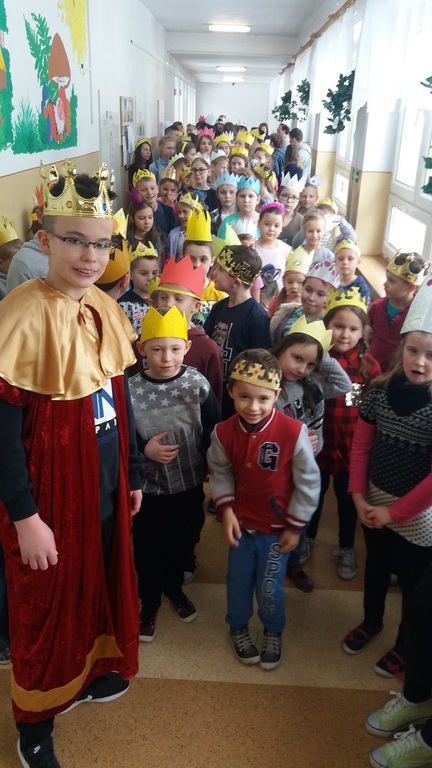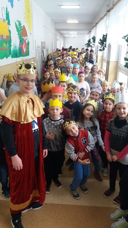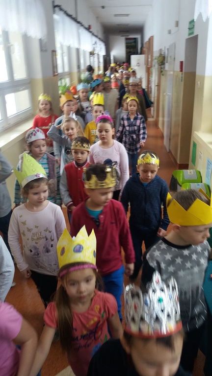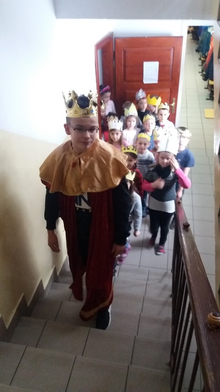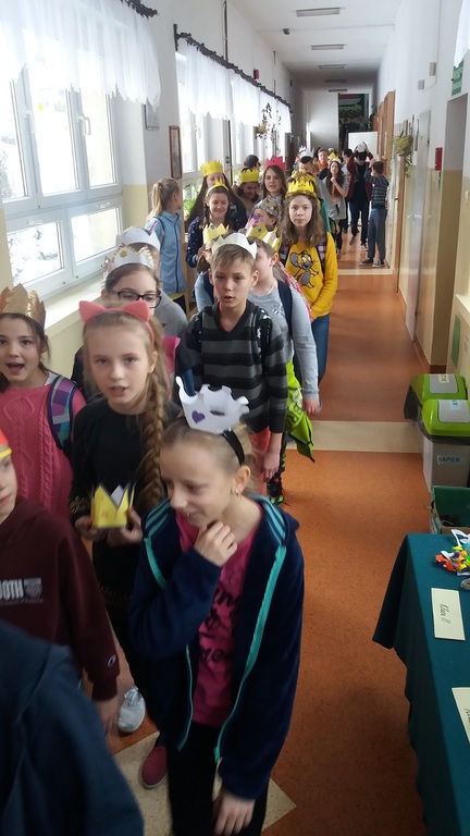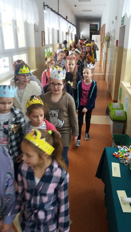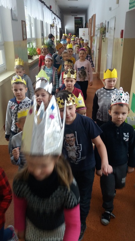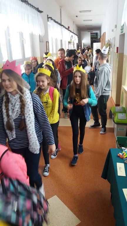 Uczniowie szkoły podstawowej i gimnazjum przystrojeni iście królewskimi koronami, przemaszerowali przez szkołę śpiewając głośno "Mędrcy świata.."