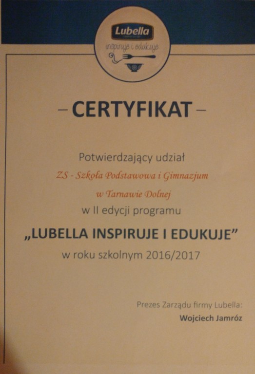 Uczniowie gimnazjum wzięli w II edycji programu „Lubella inspiruje i edukuje” w roku szkolnym 2016/2017. Projekt skierowany był do wszystkich uczniów i nauczycieli szkół gimnazjalnych w Polsce. Jego misją jest uświadomienie młodzieży jak ważną rolę w codziennej diecie odgrywają produkty zbożowe. Celem programu było pokazanie gimnazjalistom, jak powinien wyglądać prawidłowo skomponowany posiłek oraz jak właściwe odżywianie wpływa na ich zdrowie i sprawność fizyczną, zarówno obecnie jak i w przyszłości. We współpracy z dyplomowanym dietetykiem powstały materiały edukujące o tym, jak powinna wyglądać prawidłowo zbilansowana dieta i jak istotne miejsce w naszym codziennym jadłospisie zajmują produkty zbożowe. Cel akcji „Lubella inspiruje i edukuje” spotkały się z uznaniem prestiżowych instytucji. Została ona objęta patronatem kuratoriów oświaty, Koła Naukowego Dietetyków Uniwersytetu Jagiellońskiego oraz Wydziału Nauk o Żywności i Biotechnologii Uniwersytetu Przyrodniczego w Lublinie.