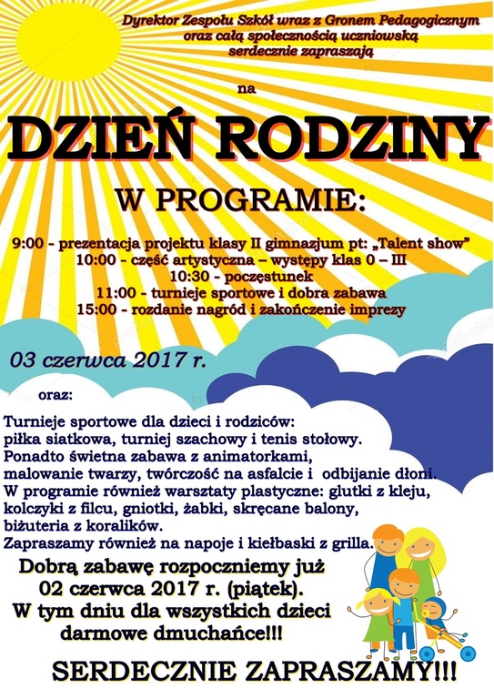 Dyrektor Zespołu Szkół wraz z Gronem Pedagogicznym oraz całą społecznością uczniowską mają zaszczyt zaprosić na DZIEŃ RODZINY w ramach obchodów XIII DNIA ZIEMI TARNAWSKIEJ który odbędzie się 03 czerwca 2017 r. w Zespole Szkół w Tarnawie Dolnej.