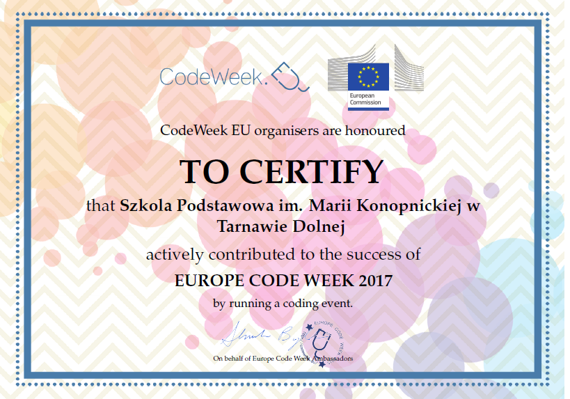 W dniach od 5 do 22 października w całej Europie wspólnie świętowaliśmy CodeWeek czyli Tydzień Kodowania. Również nasza szkoła dołączyła się do akcji i podczas zajęć z programowania, a także na innych lekcjach działaliśmy w ramach tego eventu. Warto dodać, iż CodeWeek wspierany w Polsce jest między innymi przez Ministerstwo Cyfryzacji oraz inne ważne organizacje. Za nasze działania otrzymaliśmy oczywiście certyfikat uczestnictwa :)