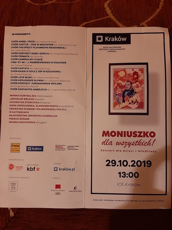 W dniu 29.10.2019r. uczniowie naszej szkoły wzięli udział w koncercie zamykającym oficjalne obchody roku Moniuszkowskiego w Krakowie. Koncert „Moniuszko dla wszystkich„ skierowany był do najmłodszych wykonawców i odbiorców. Ukazując w nowym świetle najbardziej znane i popularne kompozycje Stanisława Moniuszki. Koncert był świetna okazją do przybliżenia uczniom sylwetki Stanisława Moniuszki. W trakcie koncertu wystąpili soliści Opery Krakowskiej oraz ponad 400 członków chórów dziecięcych i młodzieżowych, którym towarzyszyła orkiestra młodych muzyków. Gościnnie udział w koncercie wzięła również Orkiestra Komendy Wojewódzkiej Policji w Katowicach.