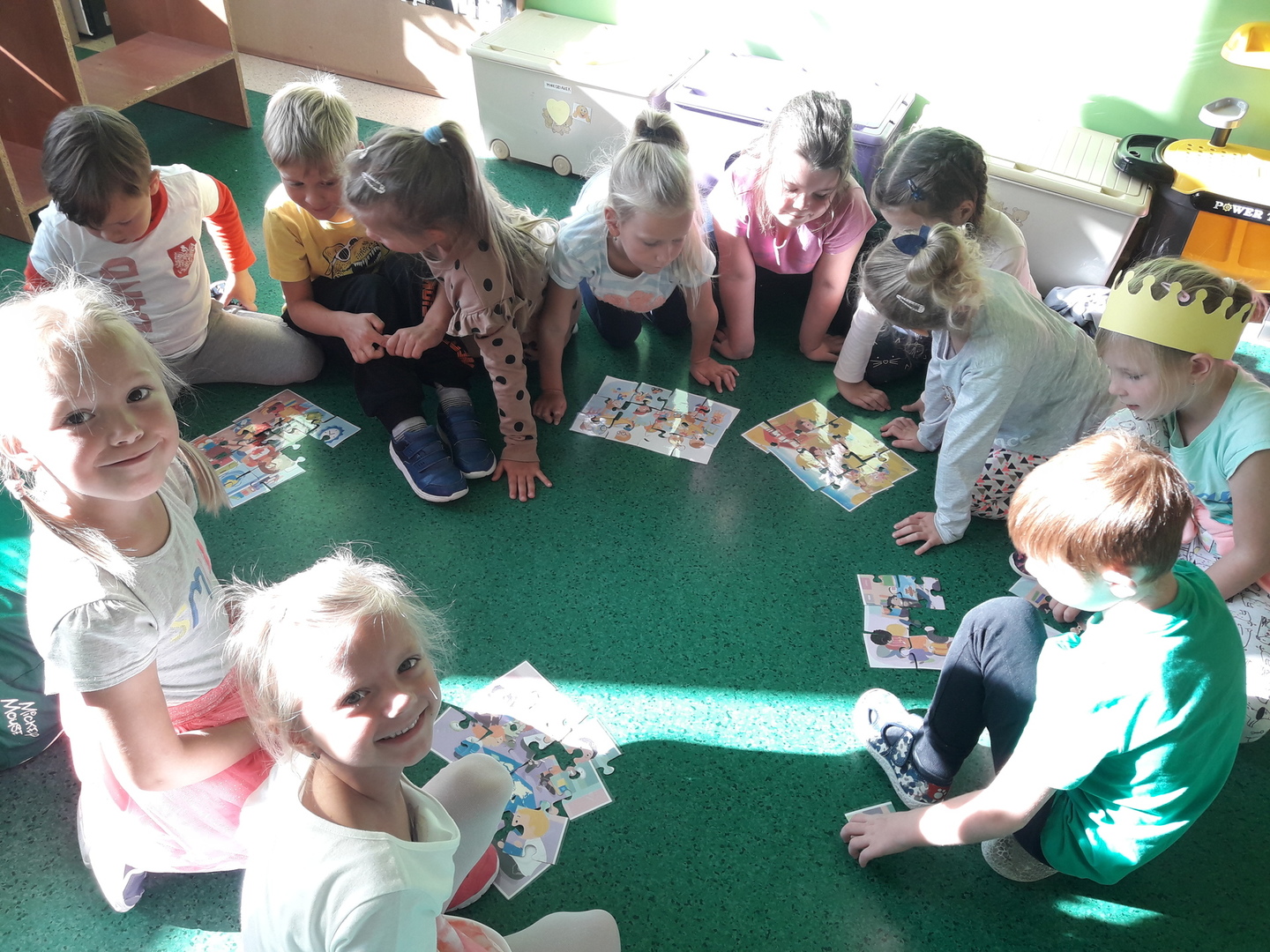 W tym dniu przedszkolaki brały udział w różnego rodzaju grach i zabawach. Dzieci z klasy 0 wzięły udział w „Quizie wiedzy o naszym przedszkolu”, nagrodą dla zwycięzcy była korona. Wspólnie staraliśmy się odpowiedzieć na pytanie: „Jaki powinien być przedszkolak?”. Zerówkowicze bardzo chętnie wymieniali ciekawe cechy. Wykazały się przy tym dużą kreatywnością. Układały również puzzle przedstawiające scenki z życia przedszkolnego.