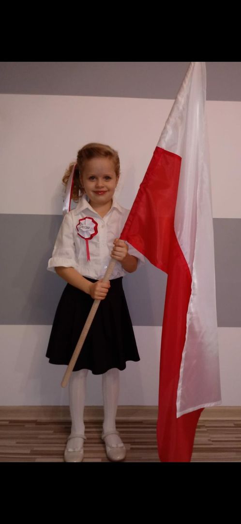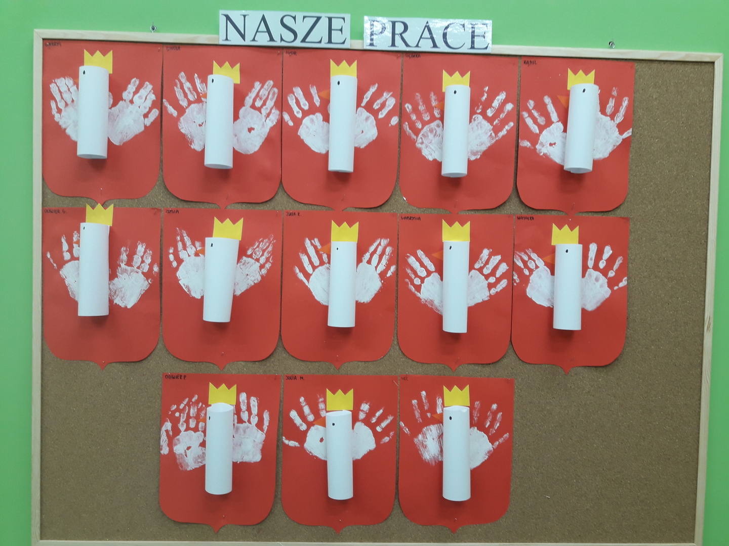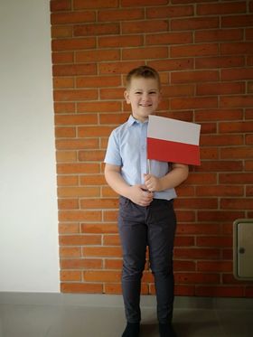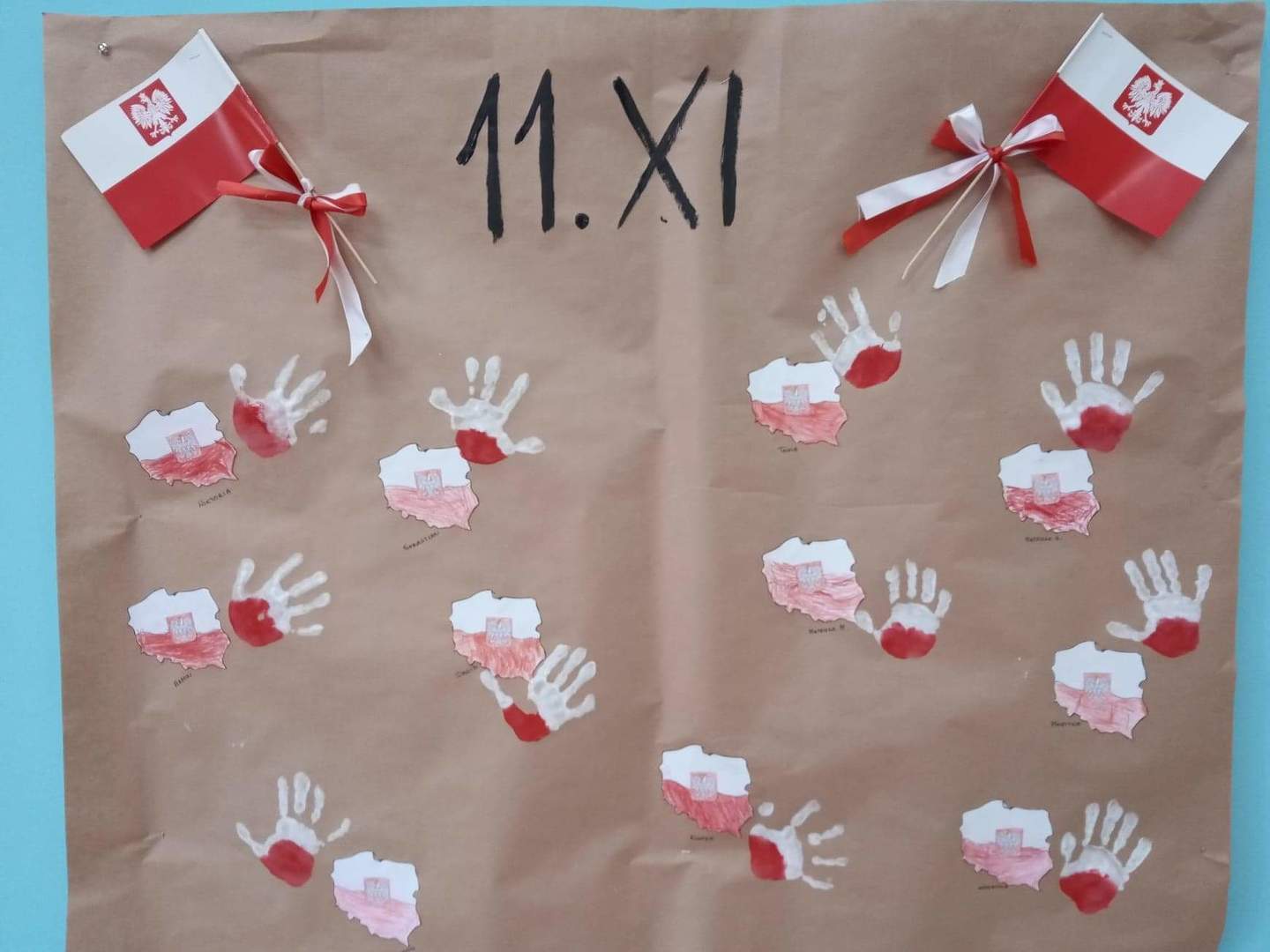 Najmłodsze dzieci przyszły ubrane do szkoły na galowo. W tym dniu poznawały narodowe barwy i symbole Polski. Wykonały również wspólną pracę plastyczną. Każde dziecko pokolorowało na biało-czerwono kontur Polski, wewnątrz którego umieszczone zostało godło. Obok mapki, każdy przedszkolak złożył swój unikatowy podpis - biało-czerwone odbicie rączki. W tym wyjątkowym dniu maluszki uczyły się również wierszyków i piosenek o Polsce.