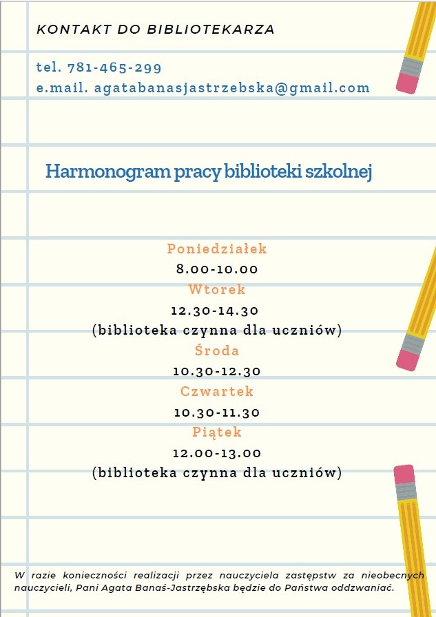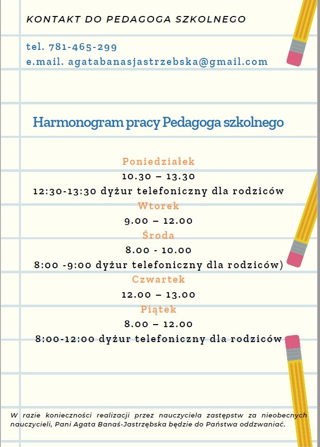 Poniżej znajduje się harmonogram pracy pedagoga szkolnego oraz bibliotekarza w okresie nauczania zdalnego, zachęcamy do zapoznania się z tą informacją.