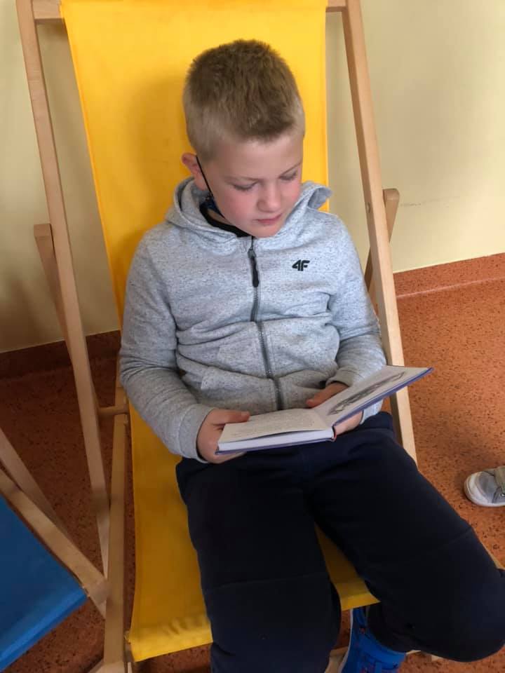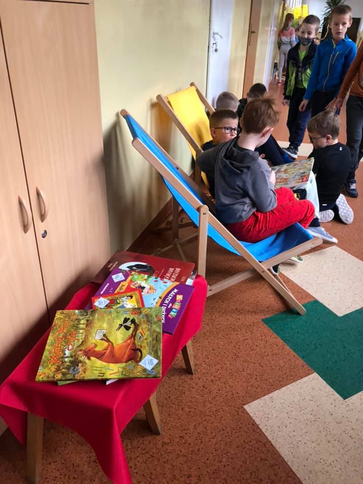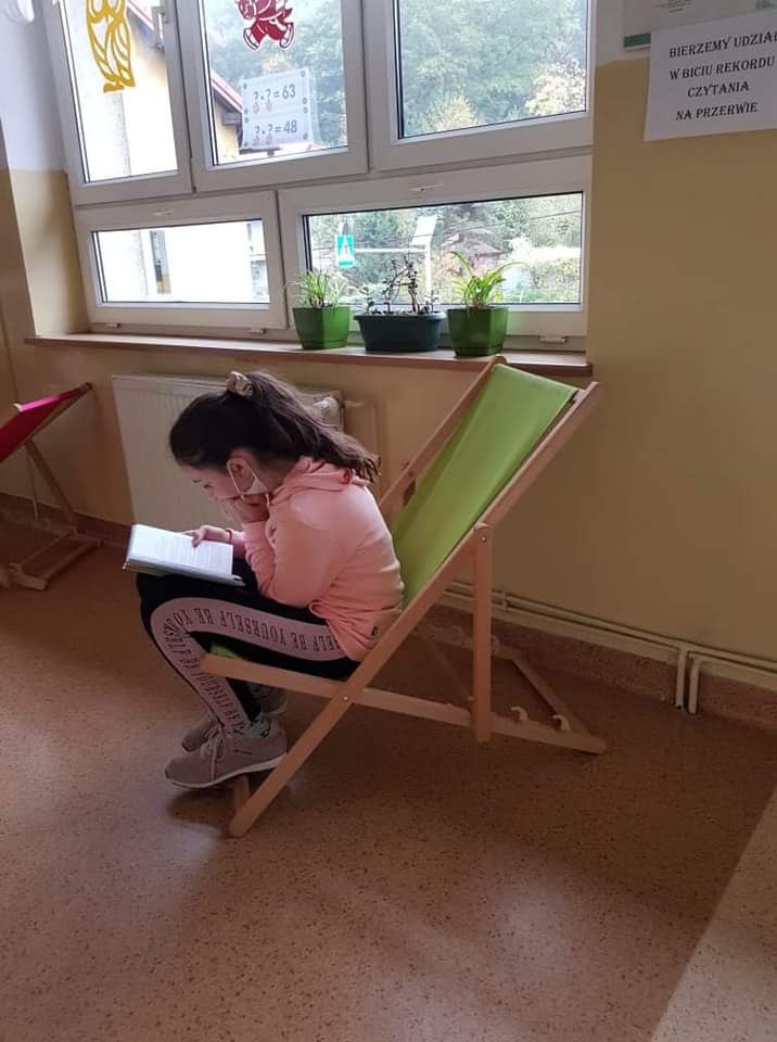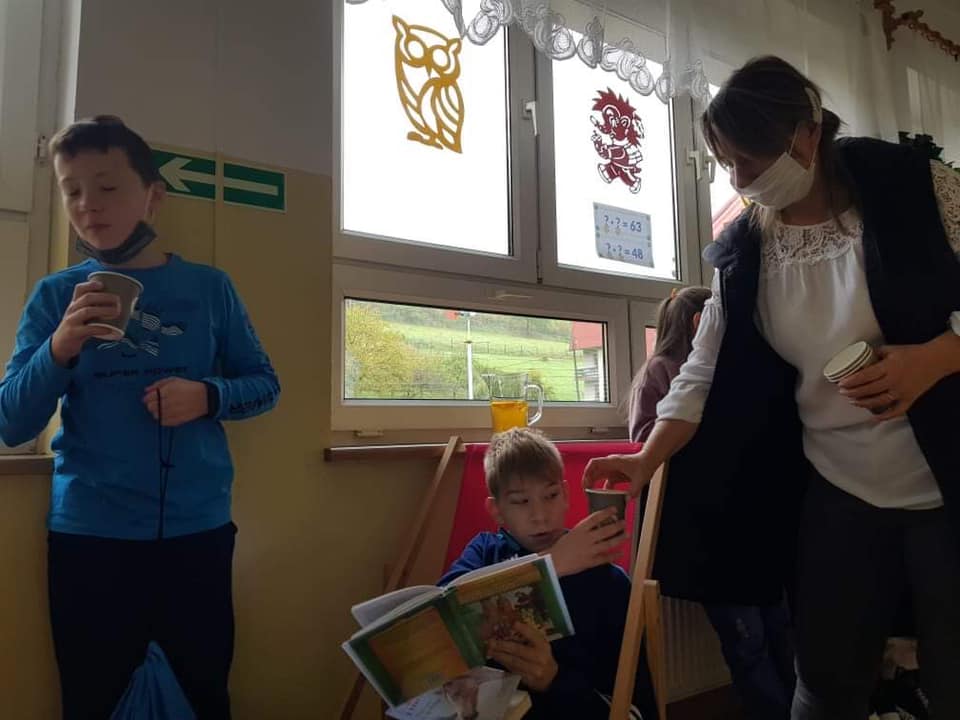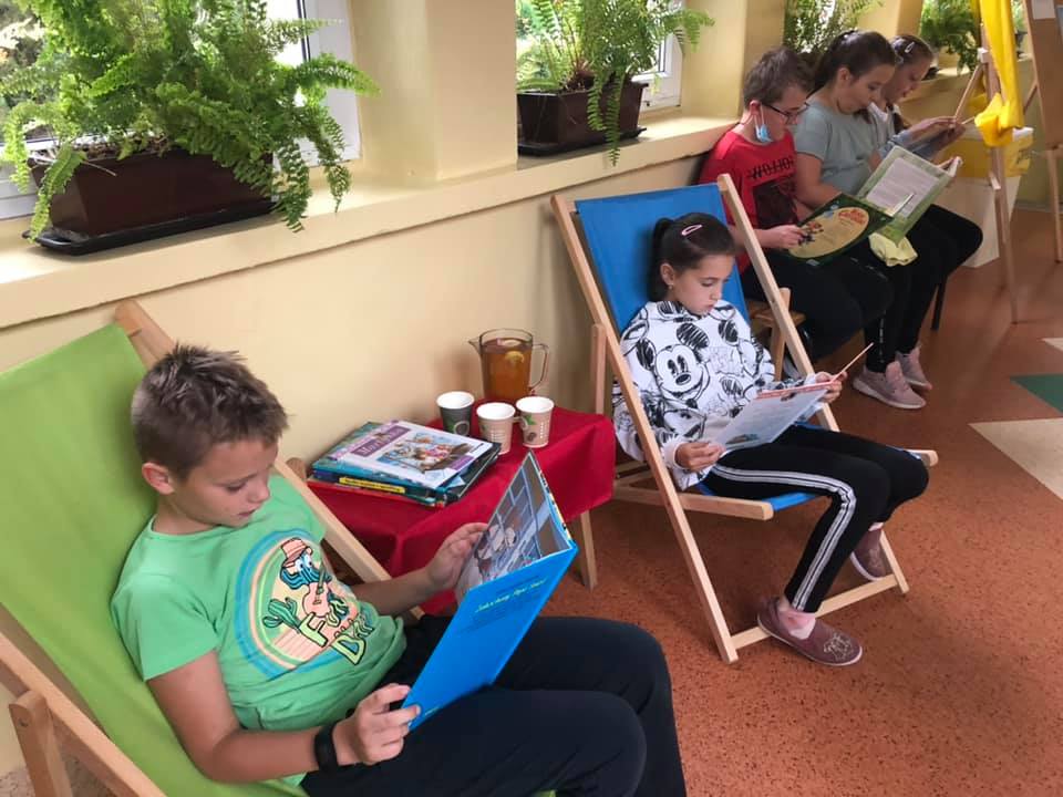 uczniowie wygodnie rozsiedli się na leżakach, popijali pyszną, jesienną herbatę z imbirem i oddawali się ciekawej lekturze.
