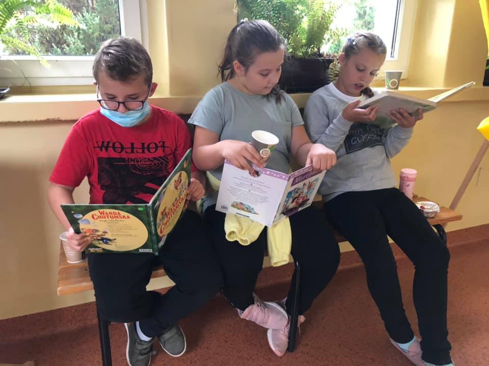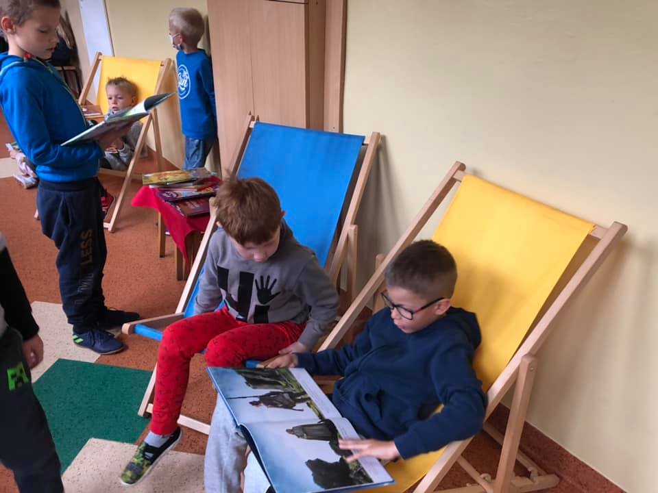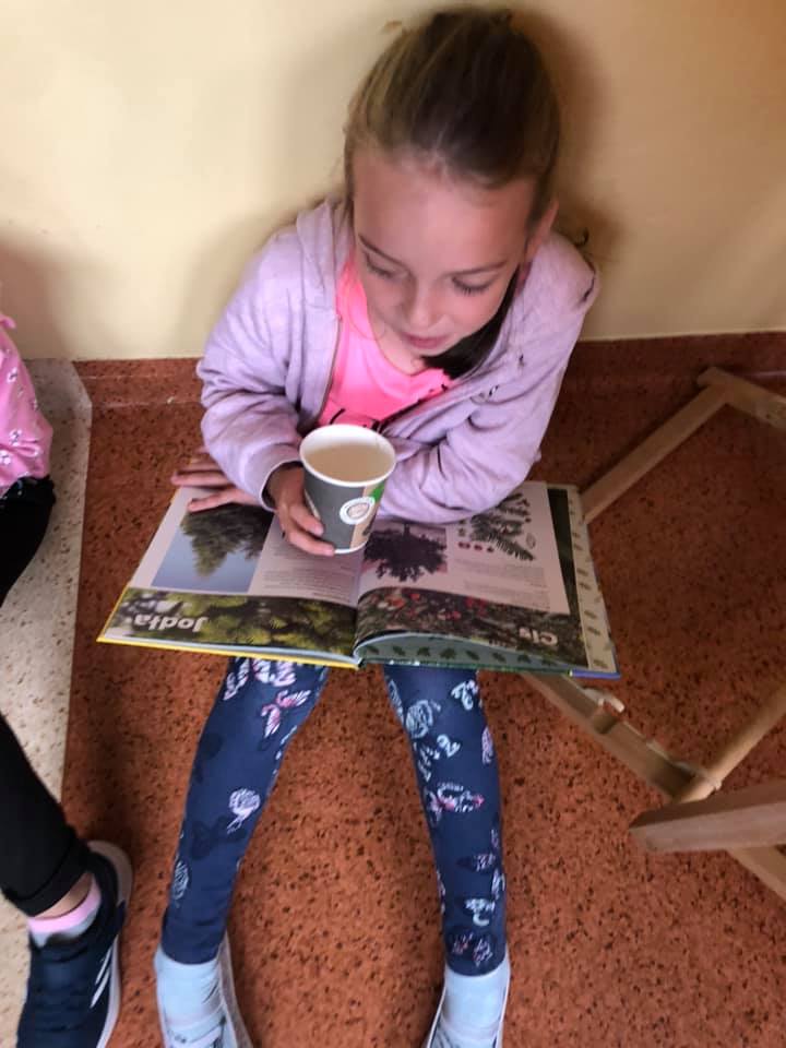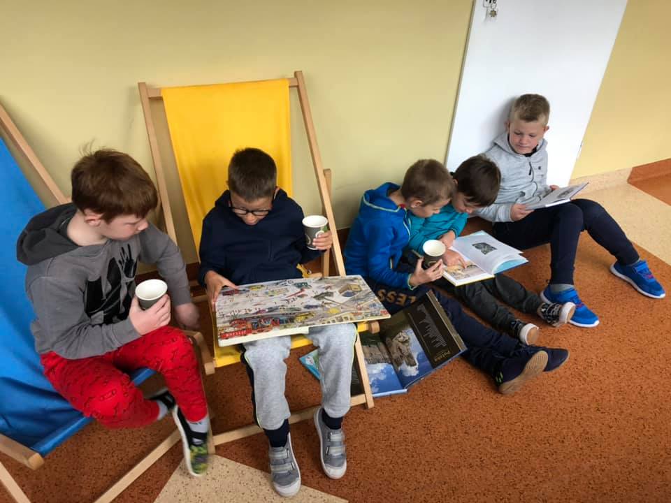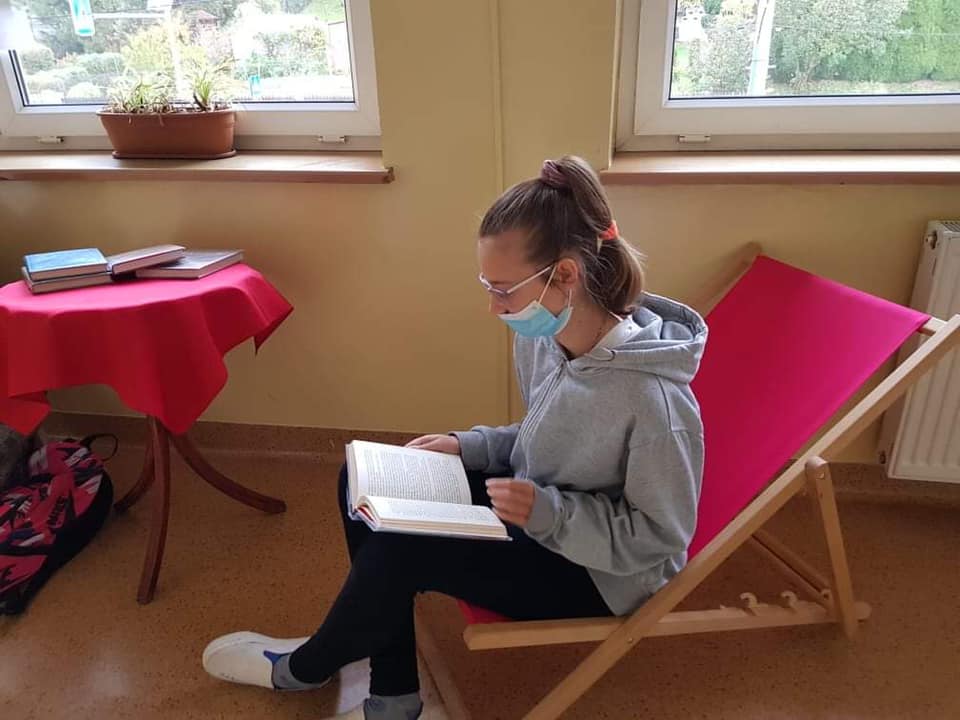 uczniowie wygodnie rozsiedli się na leżakach, popijali pyszną, jesienną herbatę z imbirem i oddawali się ciekawej lekturze.