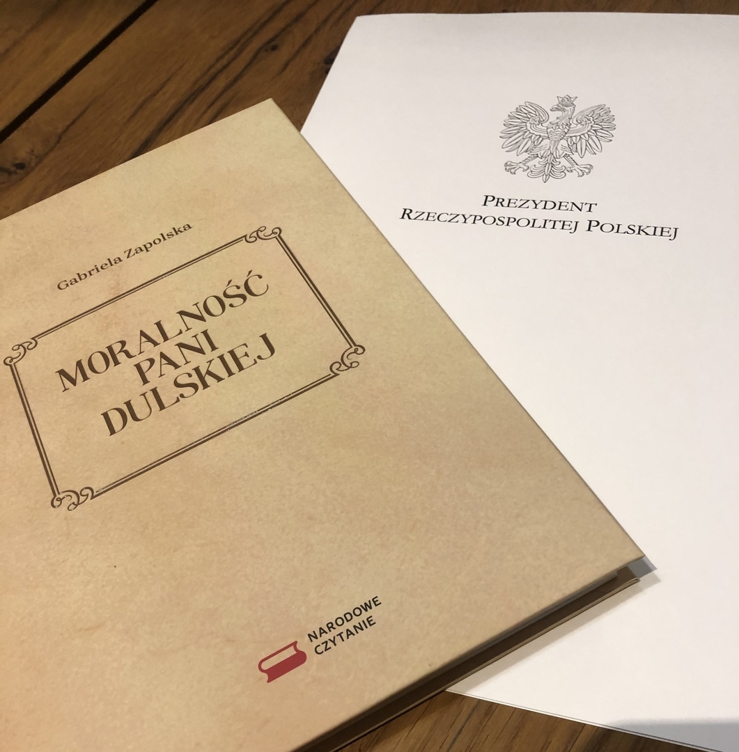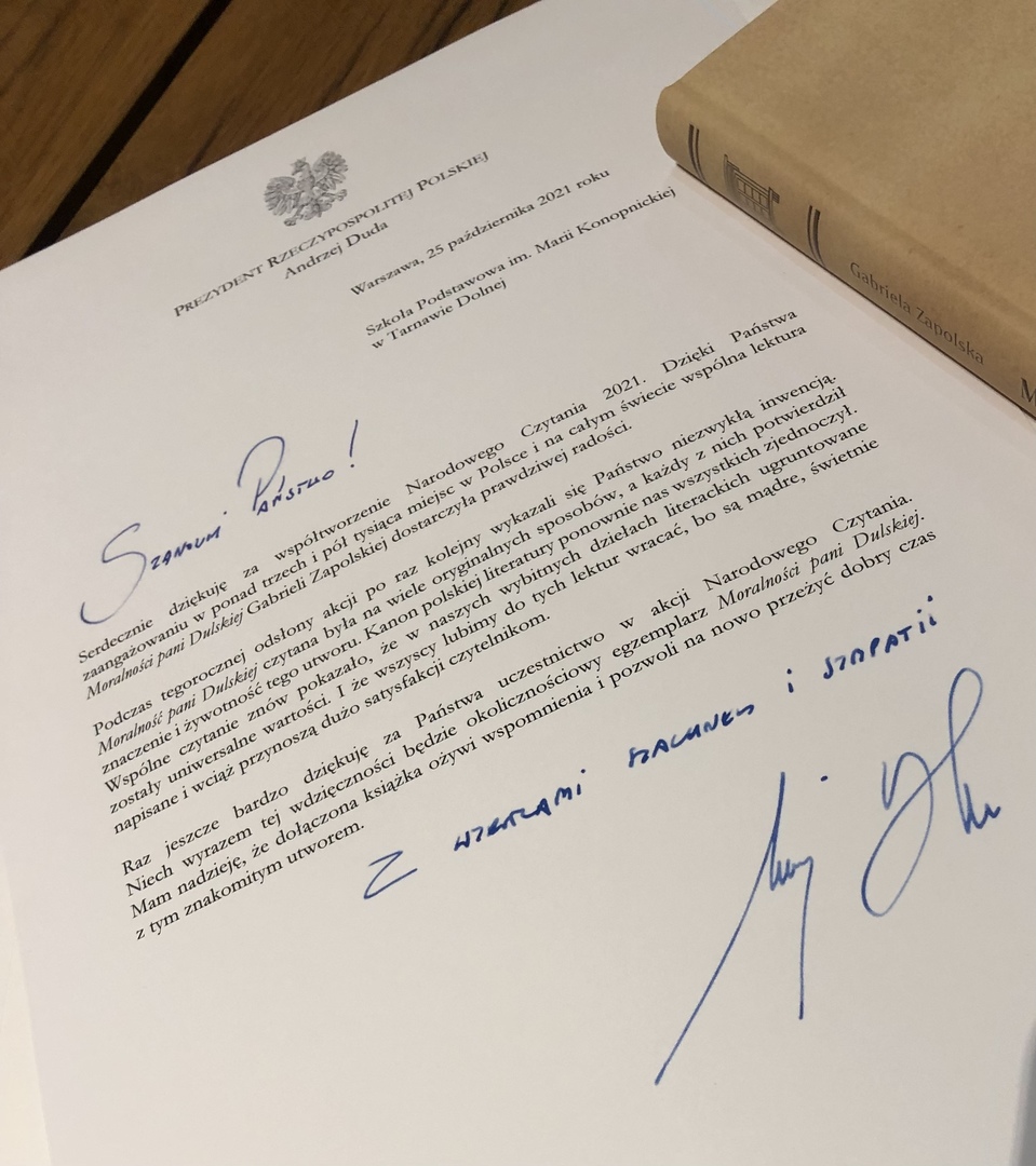 Nasza szkoła w dniu dzisiejszym otrzymała specjalną przesyłkę z Kancelarii Prezydenta Rzeczypospolitej Polskiej - podziękowanie za udział w Narodowym Czytaniu oraz wyjątkowe wydanie „Moralności Pani Dulskiej”, której fragmenty czytane były w tym roku. Dziękujemy!