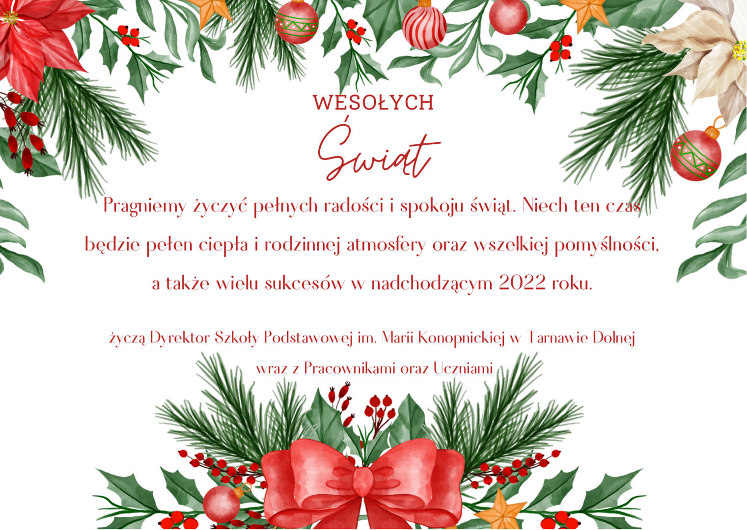 Pragniemy życzyć pełnych radości i spokoju świąt. Niech ten czas będzie pełen ciepła i rodzinnej atmosfery oraz wszelkiej pomyślności, a także wielu sukcesów w nadchodzącym 2022 roku.