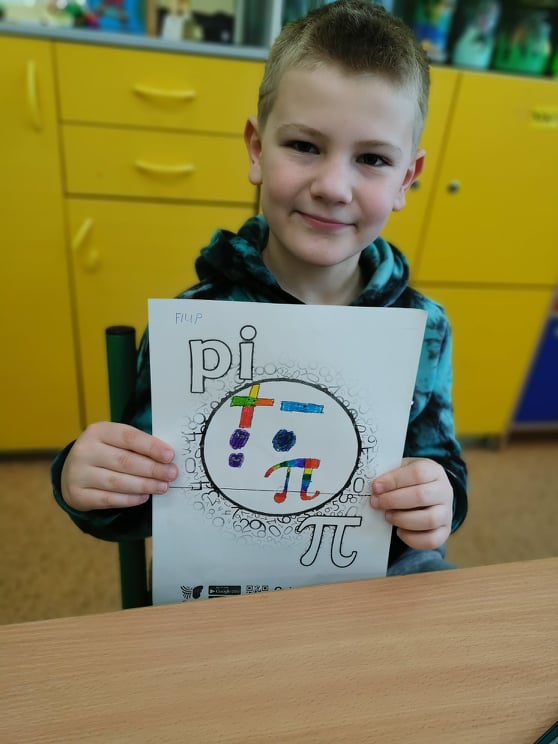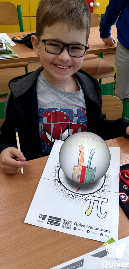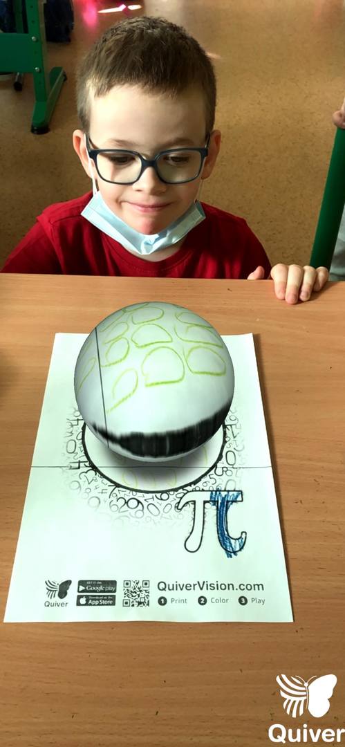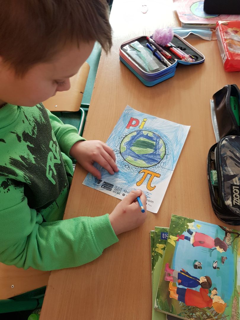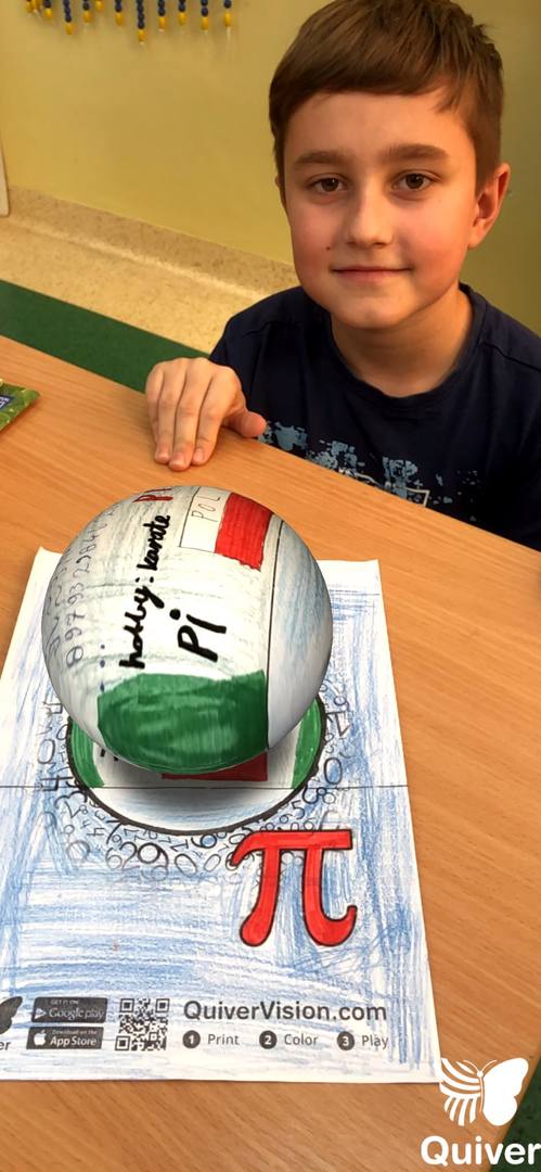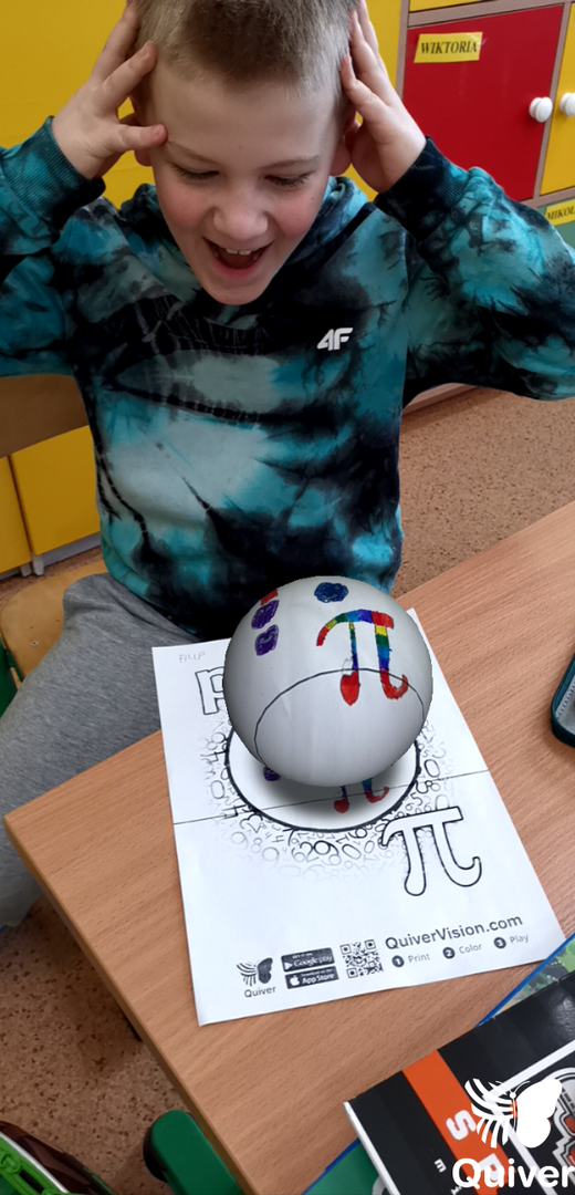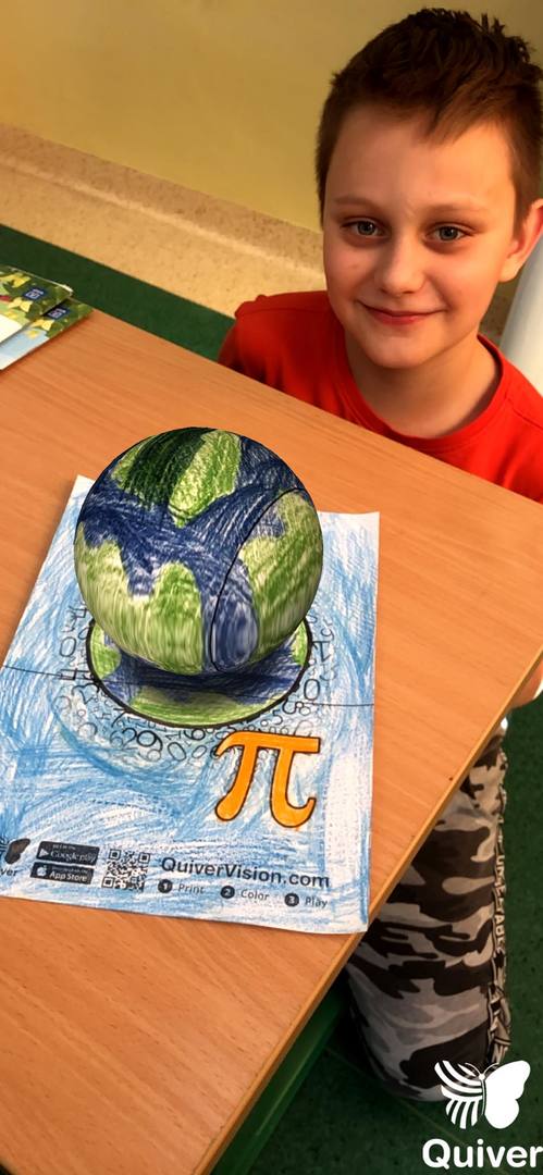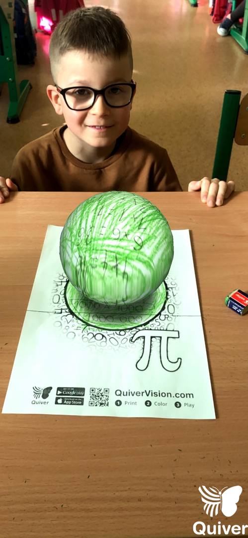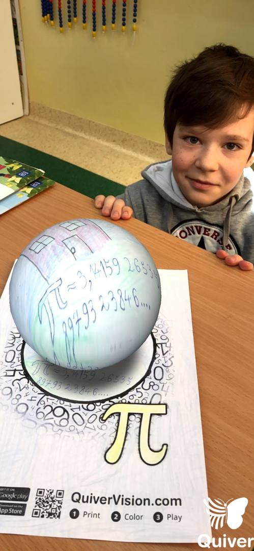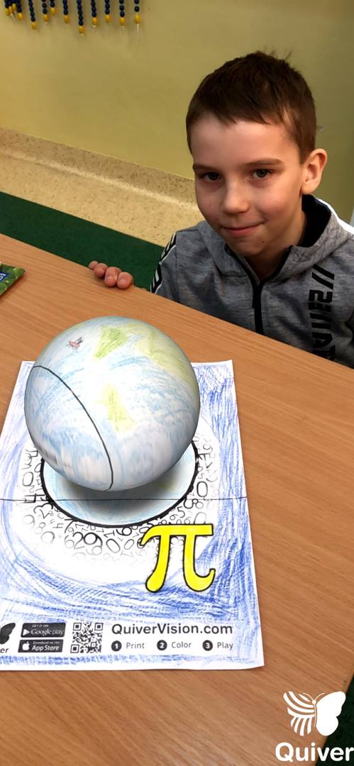 Uczniowie kolorowali także specjalne karty pracy, które za pomocą rozszerzonej rzeczywistości "ożyły" :) Chociaż sama liczba Pi i jej zrozumienie sprawia najmłodszym uczniom trudności, to podczas jej poznawania świetnie się bawili. Sprawdzaliśmy między innymi, czy w pierwszym milionie po przecinku ukryta jest nasza data urodzin. Dzieci dowiedziały się również, ile wynosi rekord zapamiętanych cyfr liczby Pi - to aż ponad 70,000! A rekordzista recytował je ponad 17 godzin!