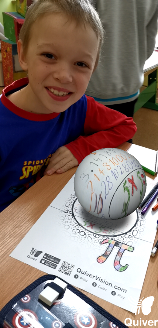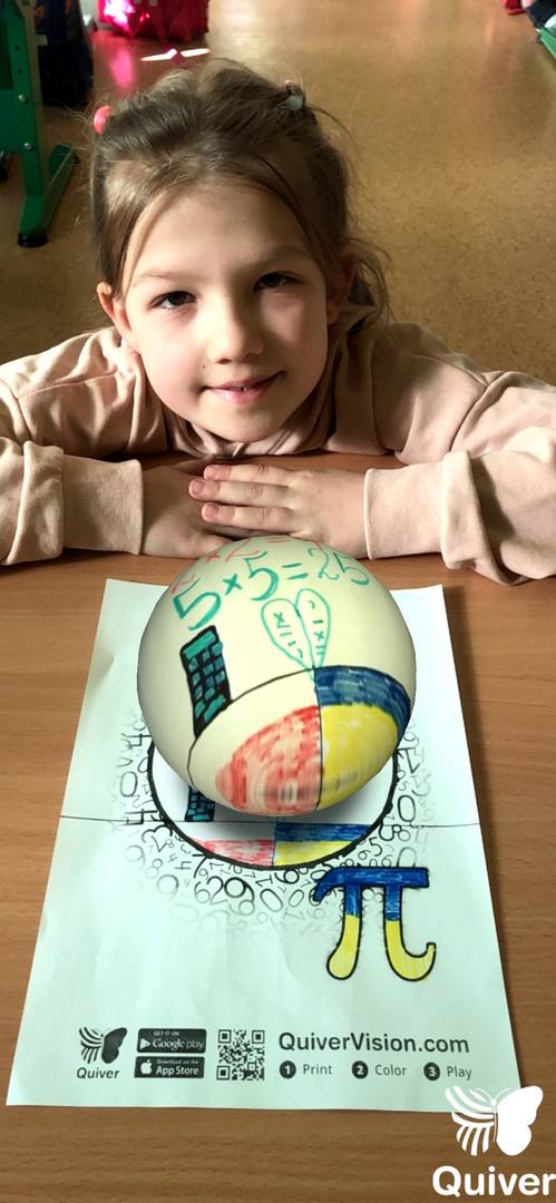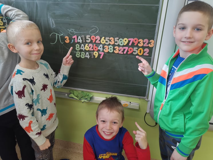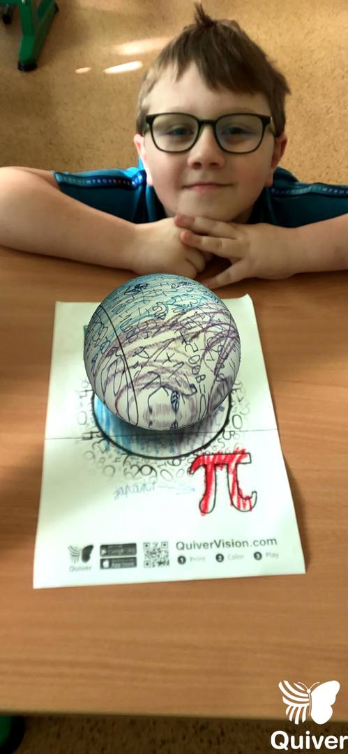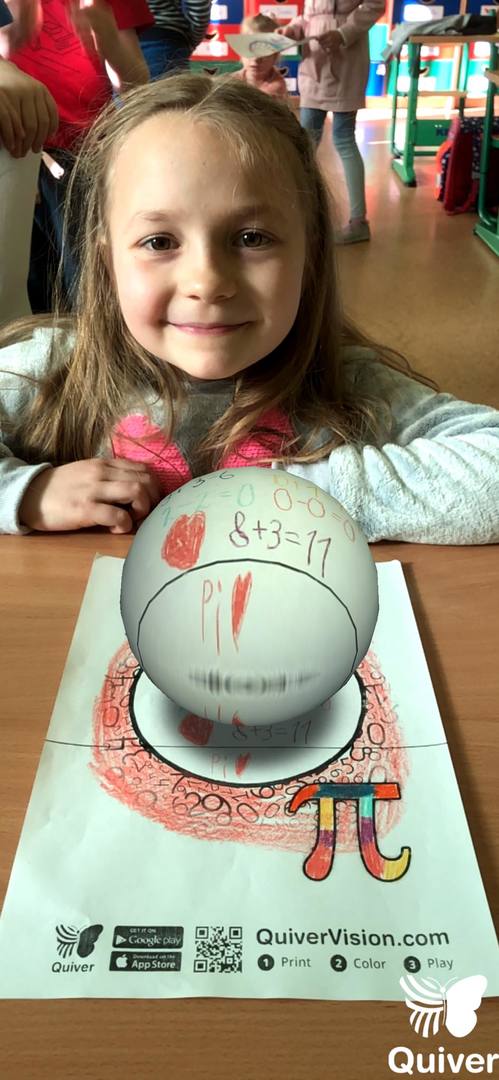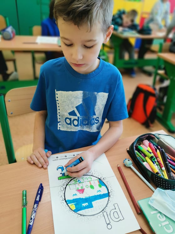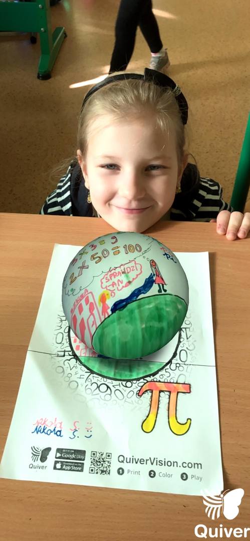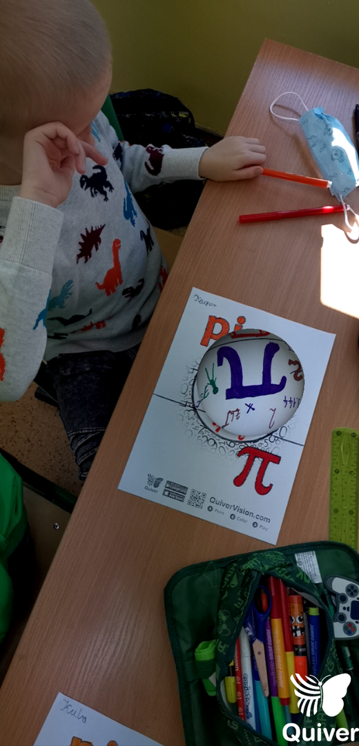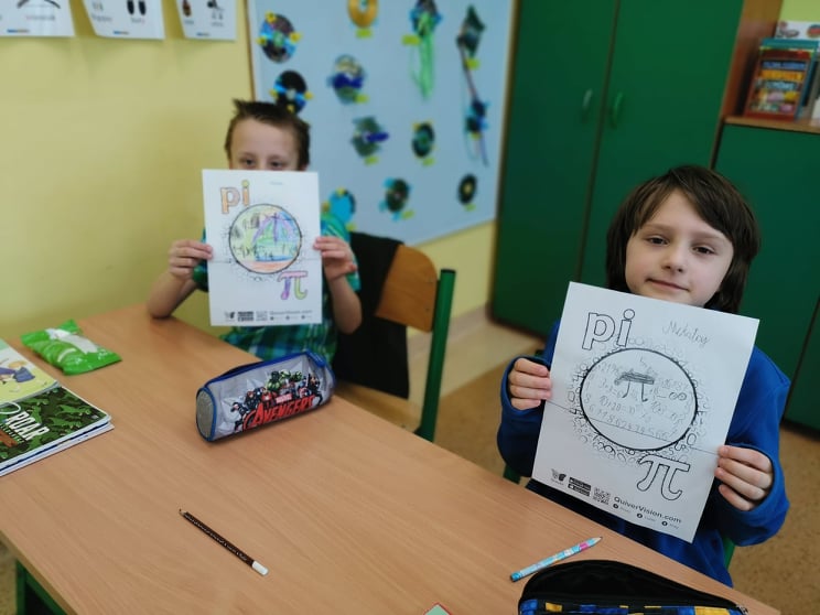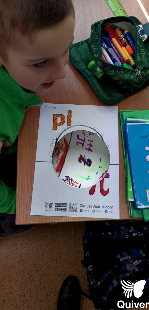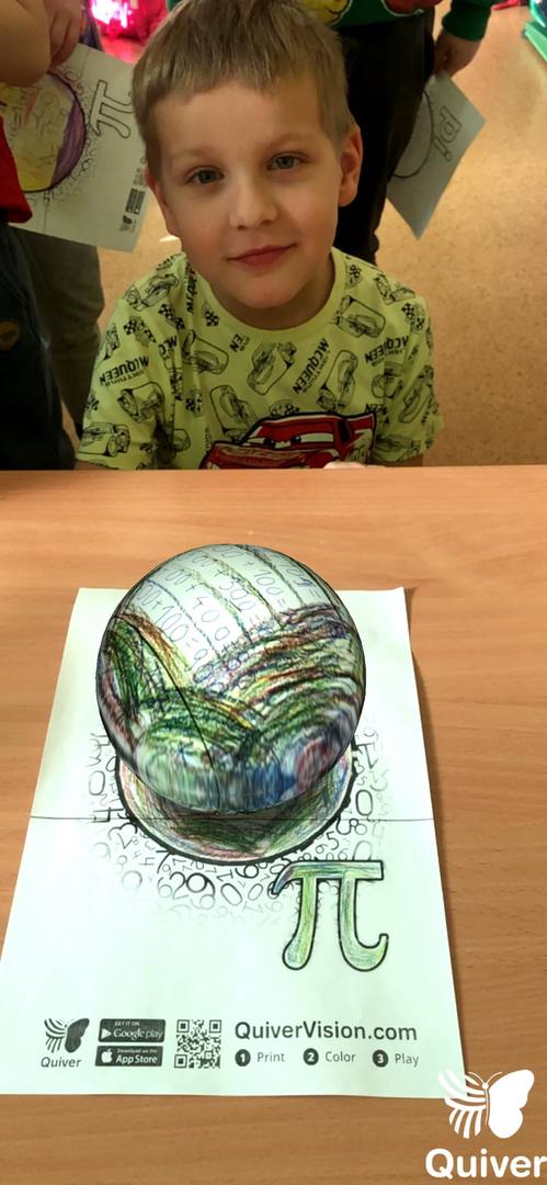 Uczniowie kolorowali także specjalne karty pracy, które za pomocą rozszerzonej rzeczywistości "ożyły" :) Chociaż sama liczba Pi i jej zrozumienie sprawia najmłodszym uczniom trudności, to podczas jej poznawania świetnie się bawili. Sprawdzaliśmy między innymi, czy w pierwszym milionie po przecinku ukryta jest nasza data urodzin. Dzieci dowiedziały się również, ile wynosi rekord zapamiętanych cyfr liczby Pi - to aż ponad 70,000! A rekordzista recytował je ponad 17 godzin!