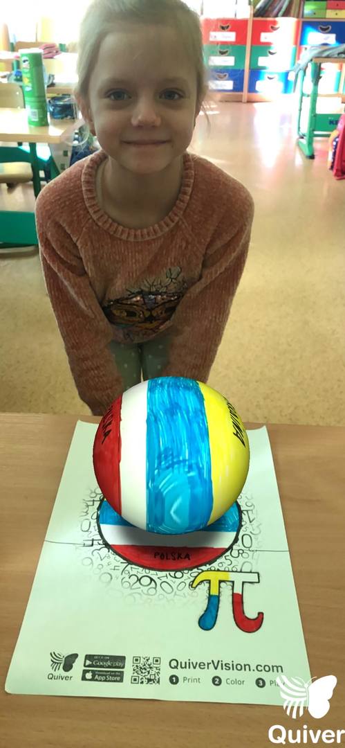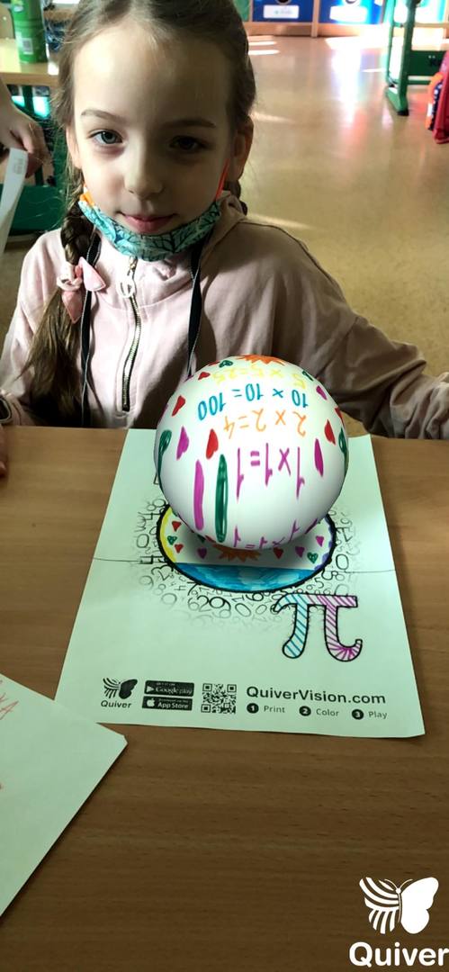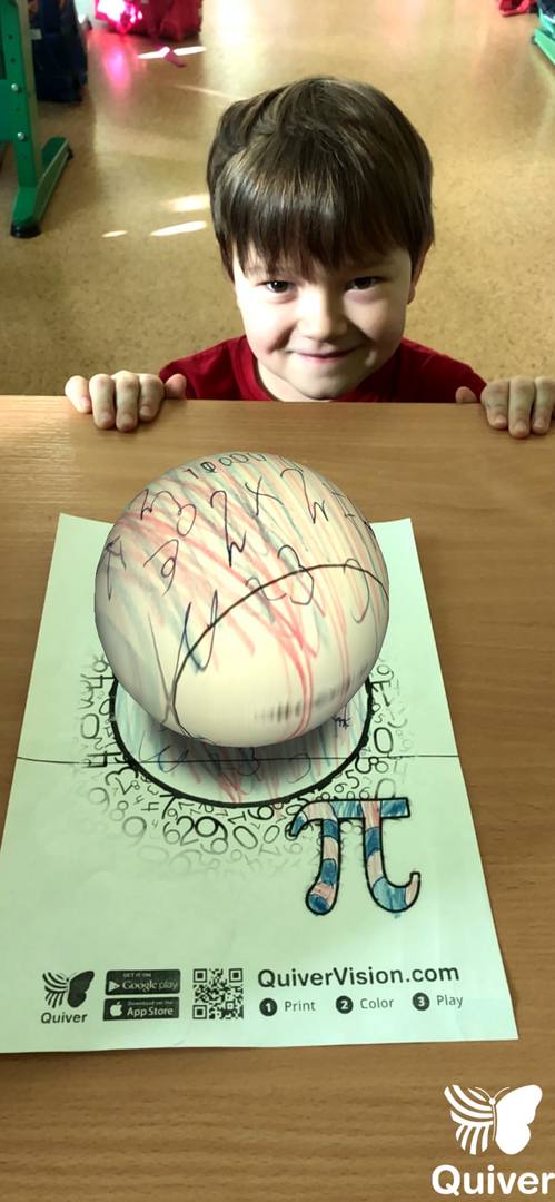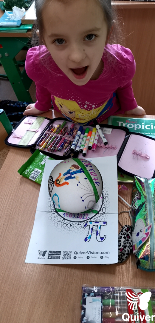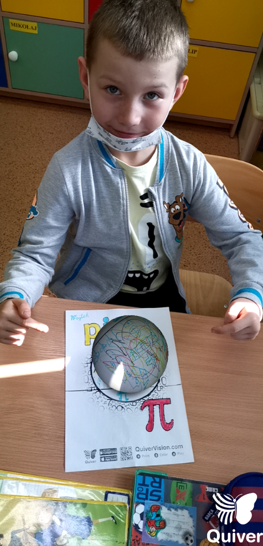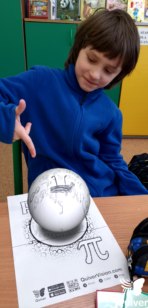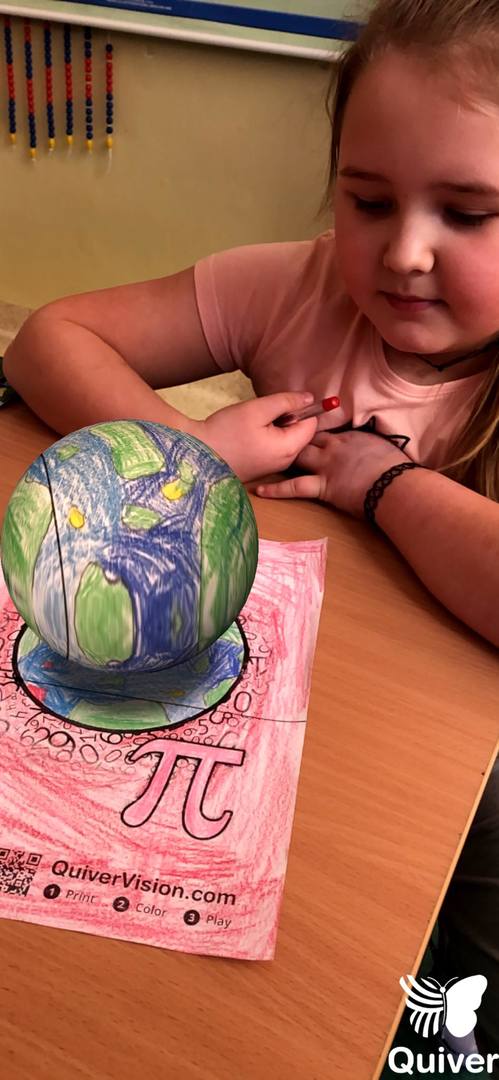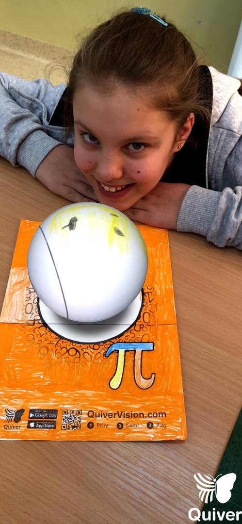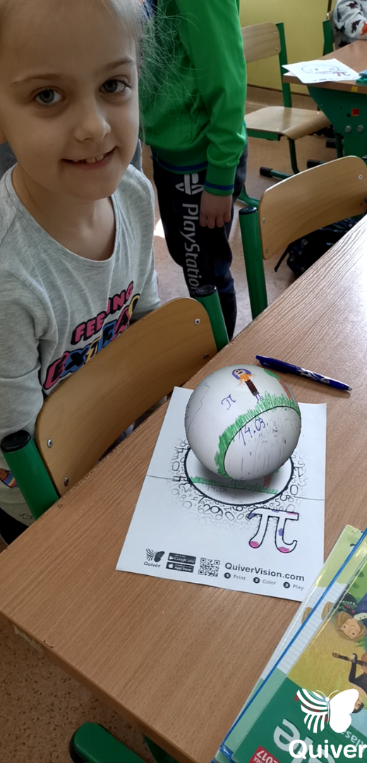 Uczniowie kolorowali także specjalne karty pracy, które za pomocą rozszerzonej rzeczywistości "ożyły" :) Chociaż sama liczba Pi i jej zrozumienie sprawia najmłodszym uczniom trudności, to podczas jej poznawania świetnie się bawili. Sprawdzaliśmy między innymi, czy w pierwszym milionie po przecinku ukryta jest nasza data urodzin. Dzieci dowiedziały się również, ile wynosi rekord zapamiętanych cyfr liczby Pi - to aż ponad 70,000! A rekordzista recytował je ponad 17 godzin!