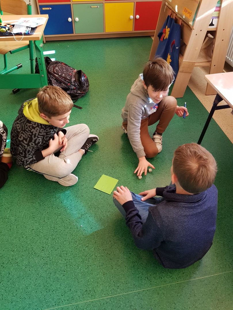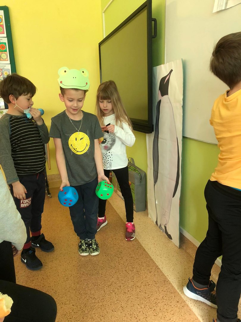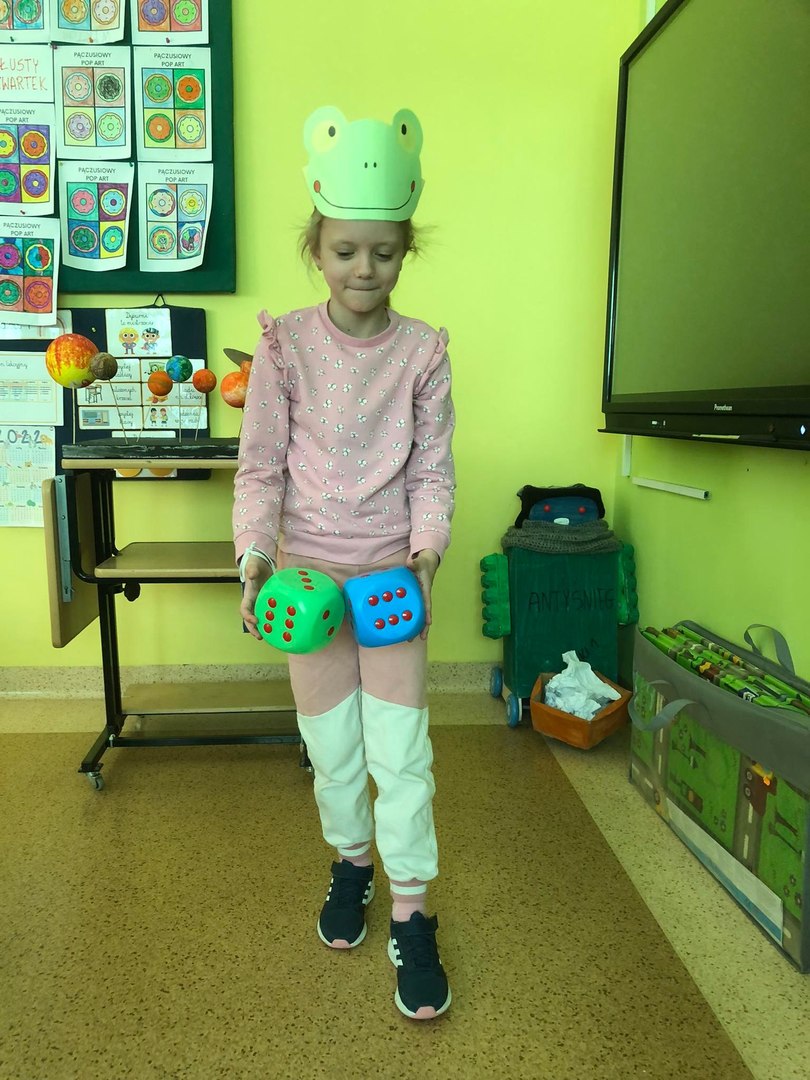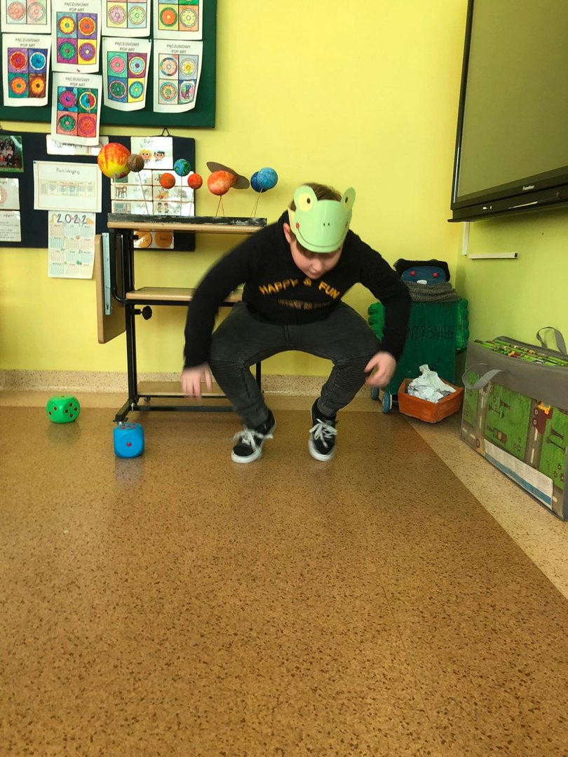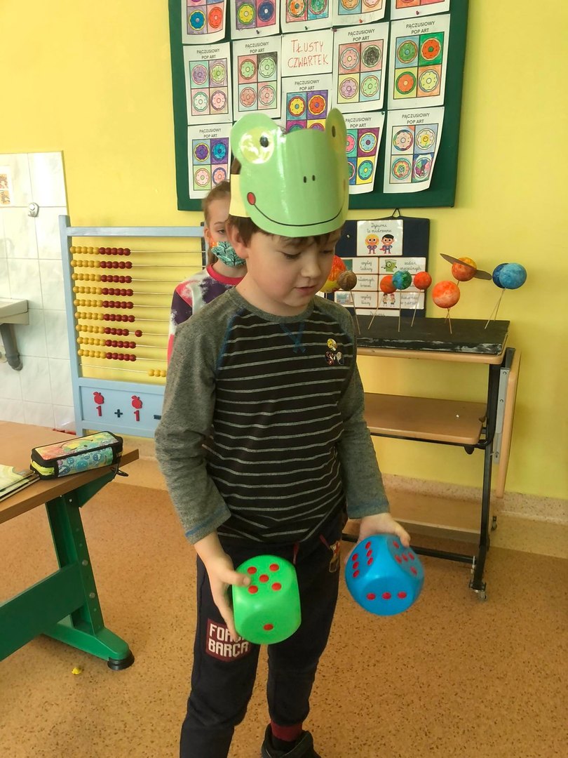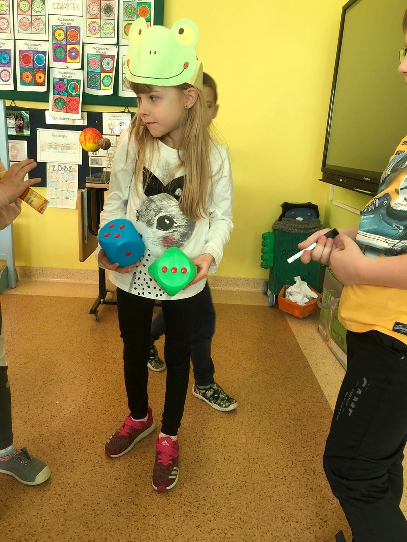 Na koniec uczniowie klas 1-3 brali udział w różnych zabawach matematycznych - klasa 1 wyłaniała mistrza matematycznego licząc w zakresie 10 na czas bawiąc się w matematyczne żabki, klasa 2 układała działania na tablicy oraz liczbę Pi z magnatycznych cyferek, natomiast klasa 3 do matematycznych zmagań użyła kości do gry.