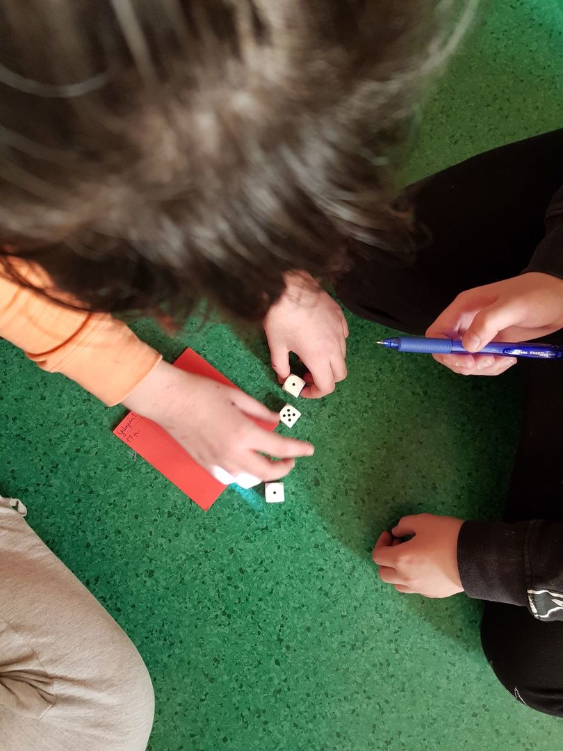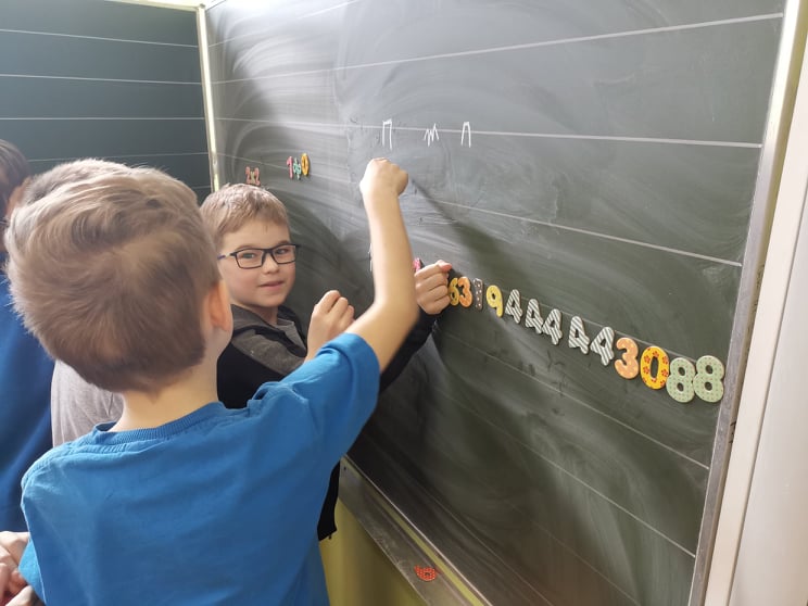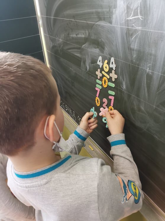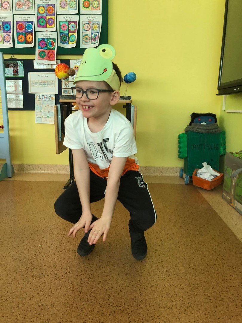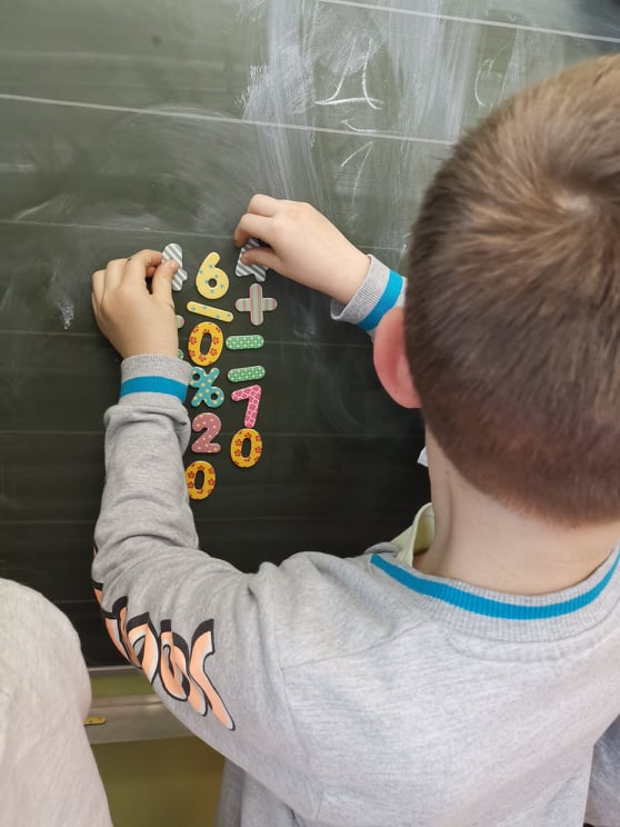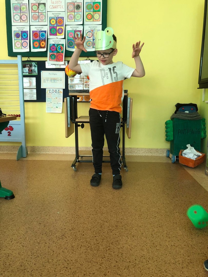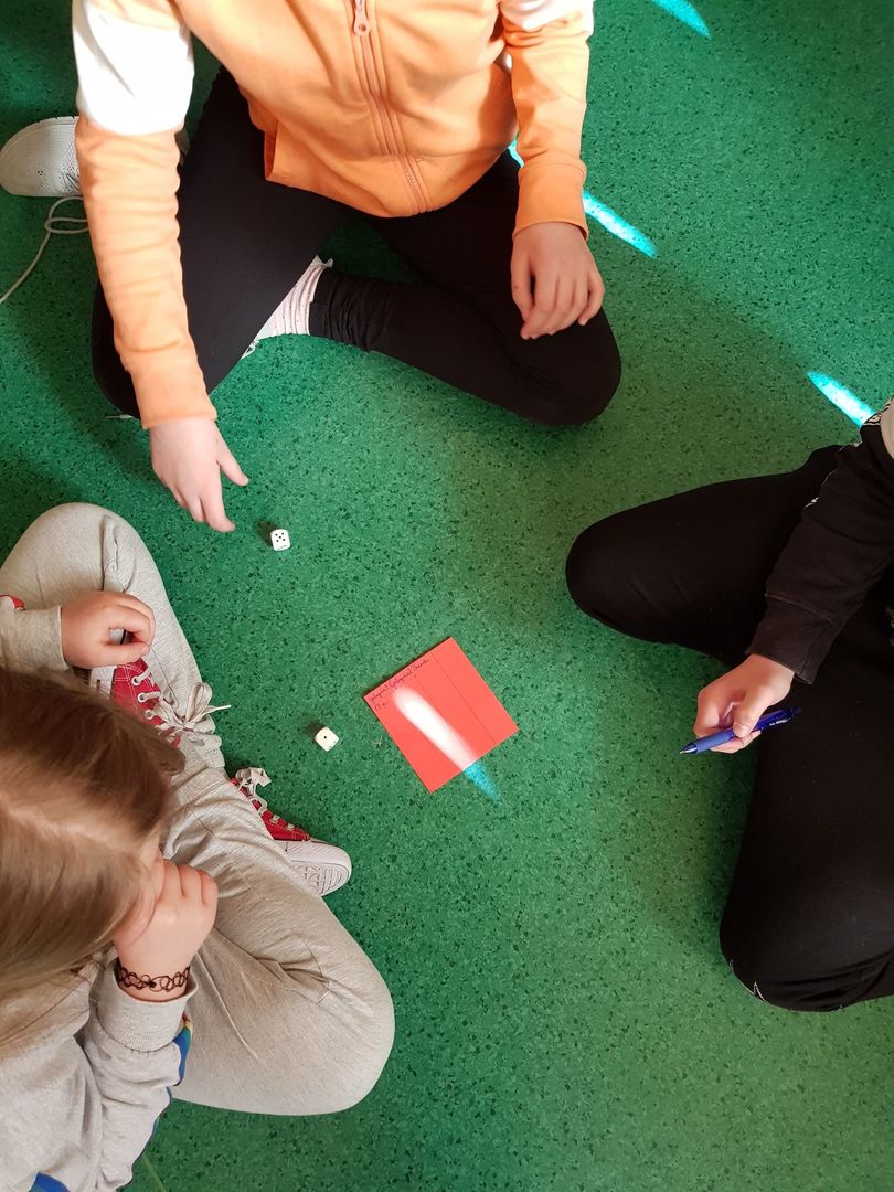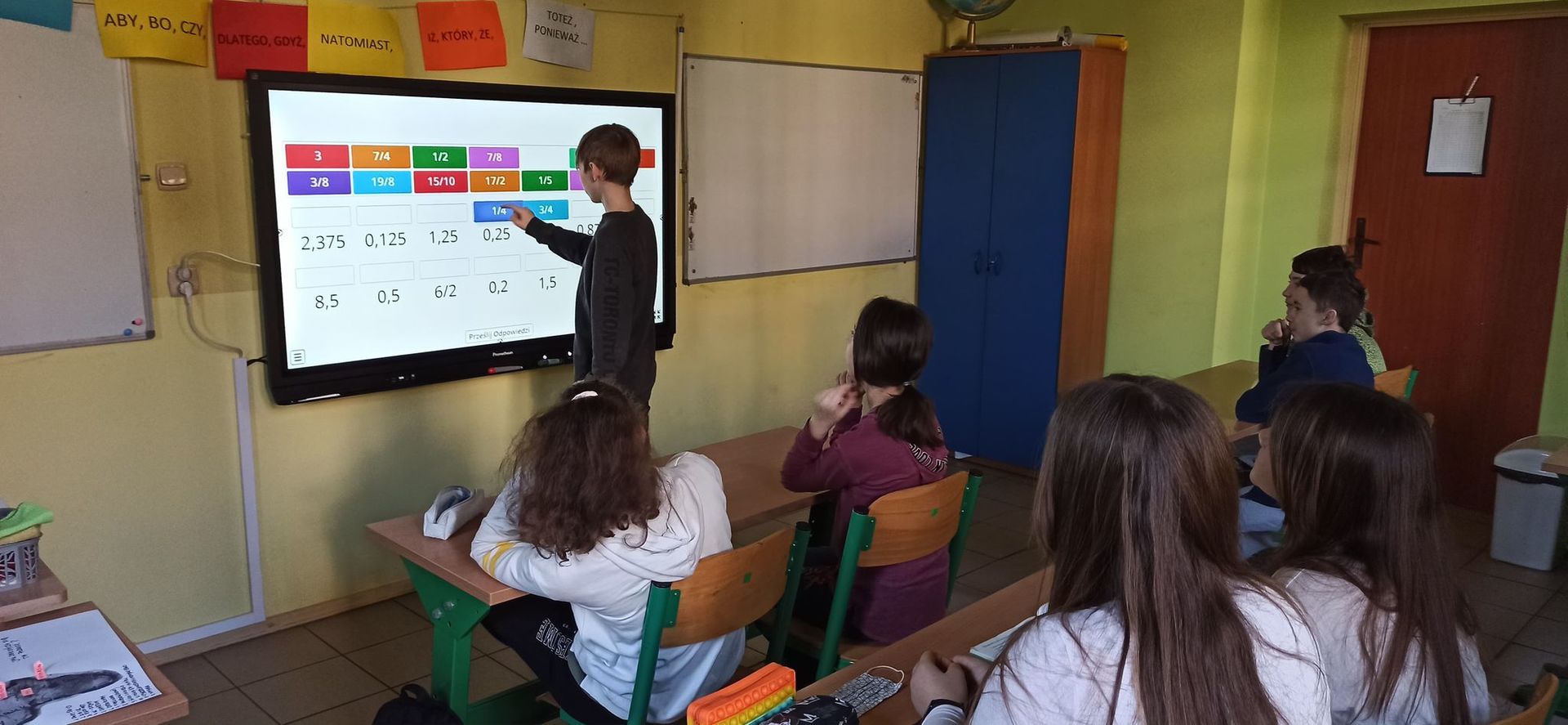 Na koniec uczniowie klas 1-3 brali udział w różnych zabawach matematycznych - klasa 1 wyłaniała mistrza matematycznego licząc w zakresie 10 na czas bawiąc się w matematyczne żabki, klasa 2 układała działania na tablicy oraz liczbę Pi z magnatycznych cyferek, natomiast klasa 3 do matematycznych zmagań użyła kości do gry.