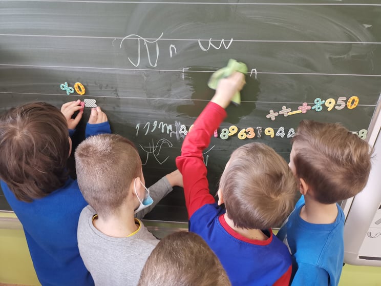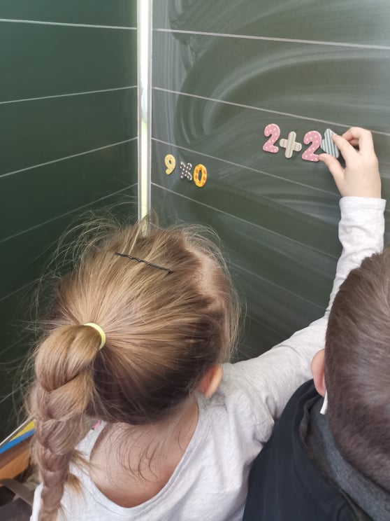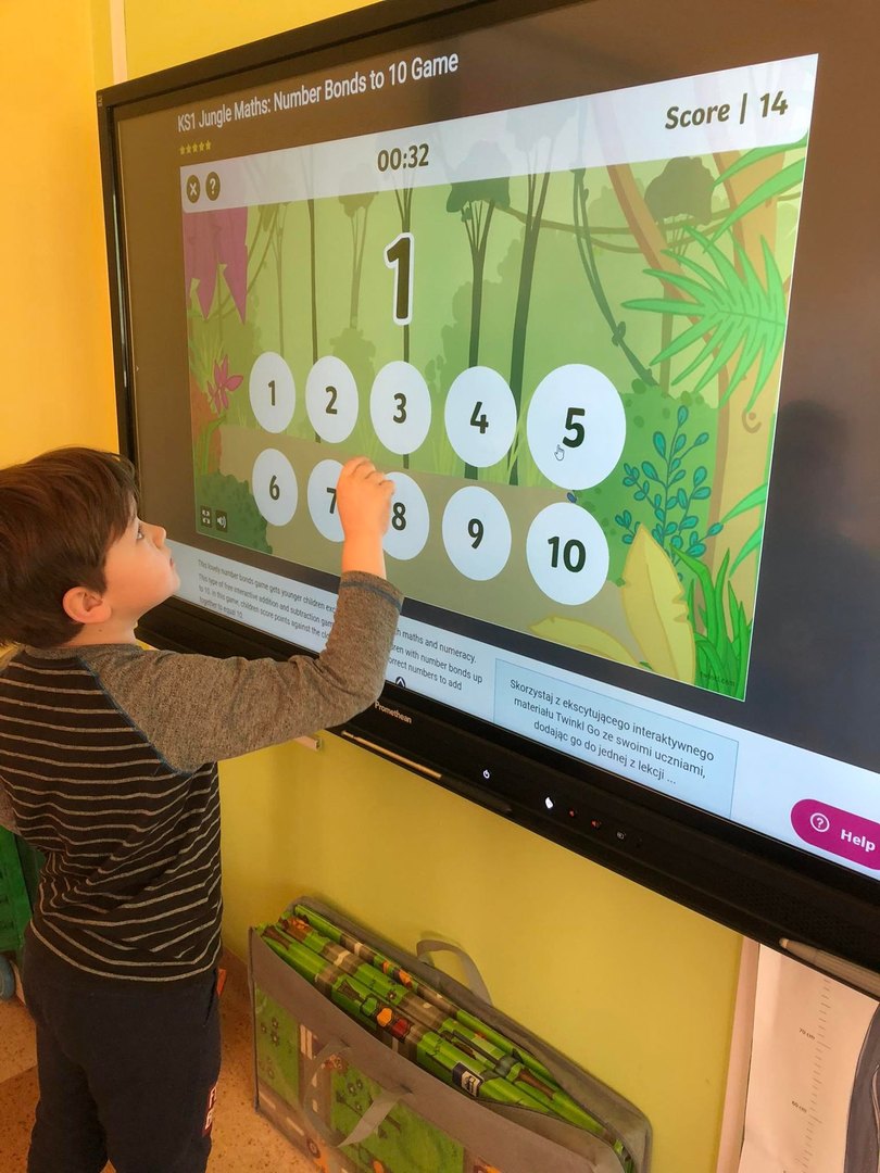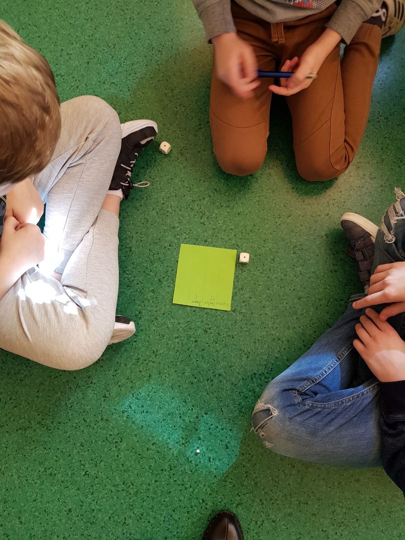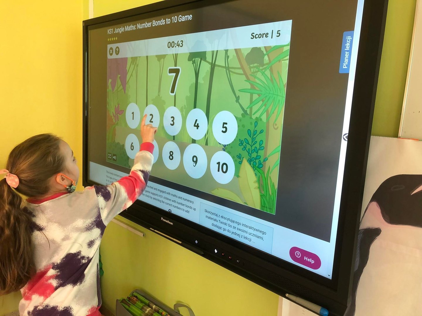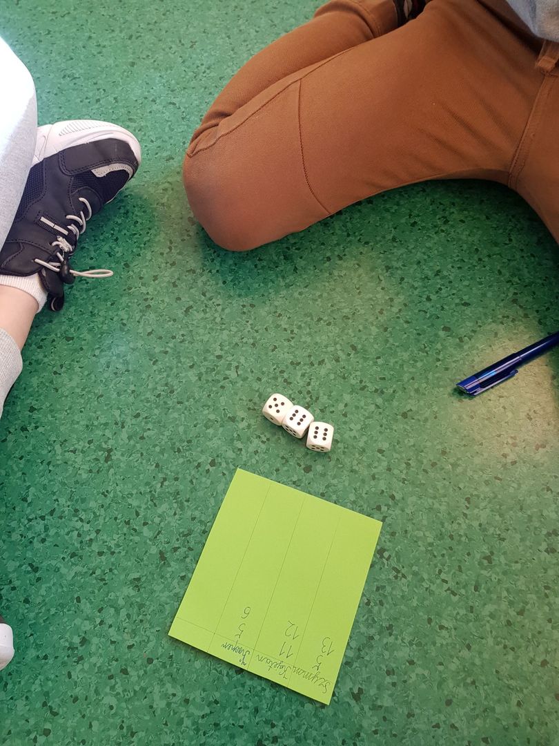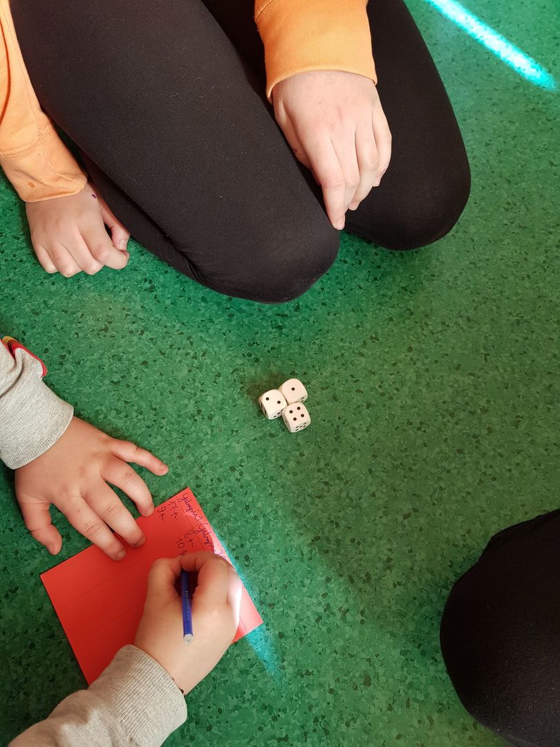 Na koniec uczniowie klas 1-3 brali udział w różnych zabawach matematycznych - klasa 1 wyłaniała mistrza matematycznego licząc w zakresie 10 na czas bawiąc się w matematyczne żabki, klasa 2 układała działania na tablicy oraz liczbę Pi z magnatycznych cyferek, natomiast klasa 3 do matematycznych zmagań użyła kości do gry.