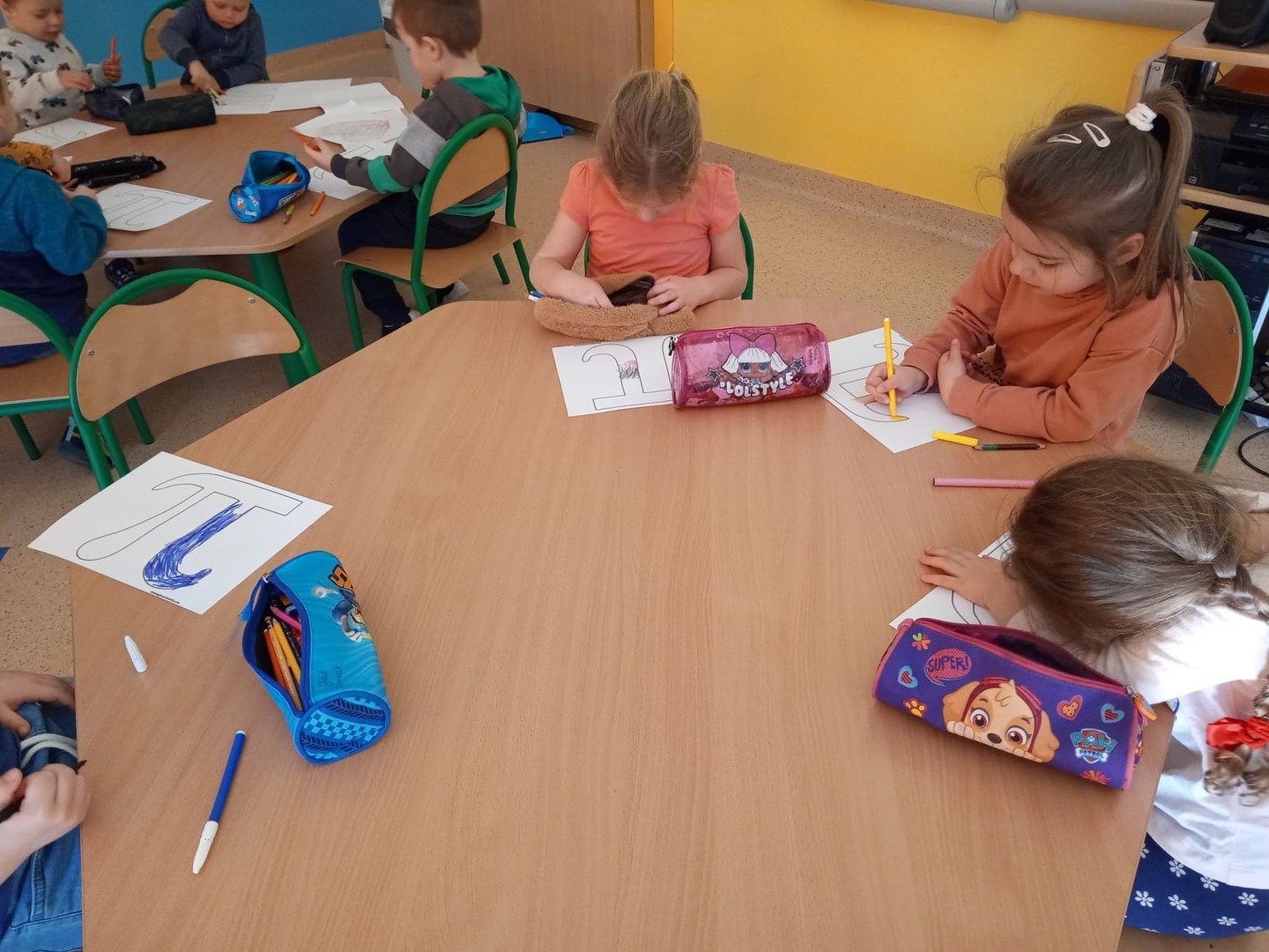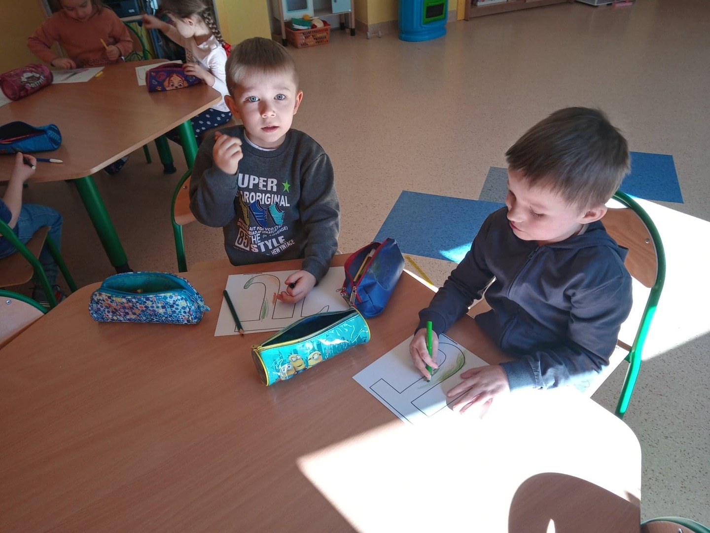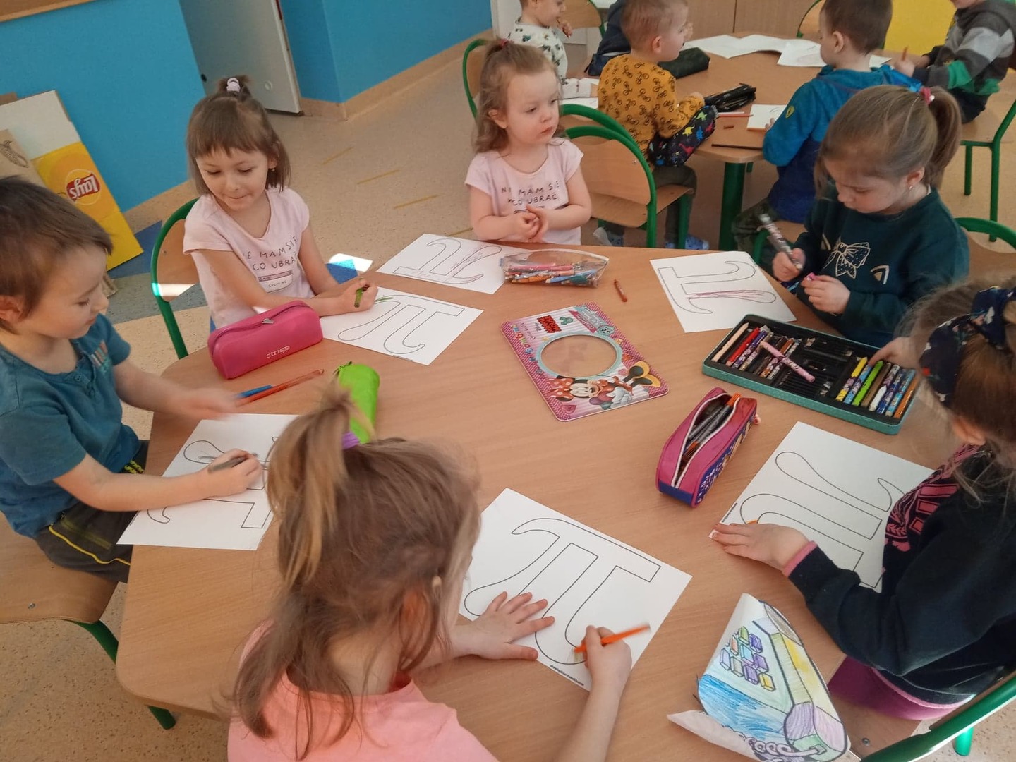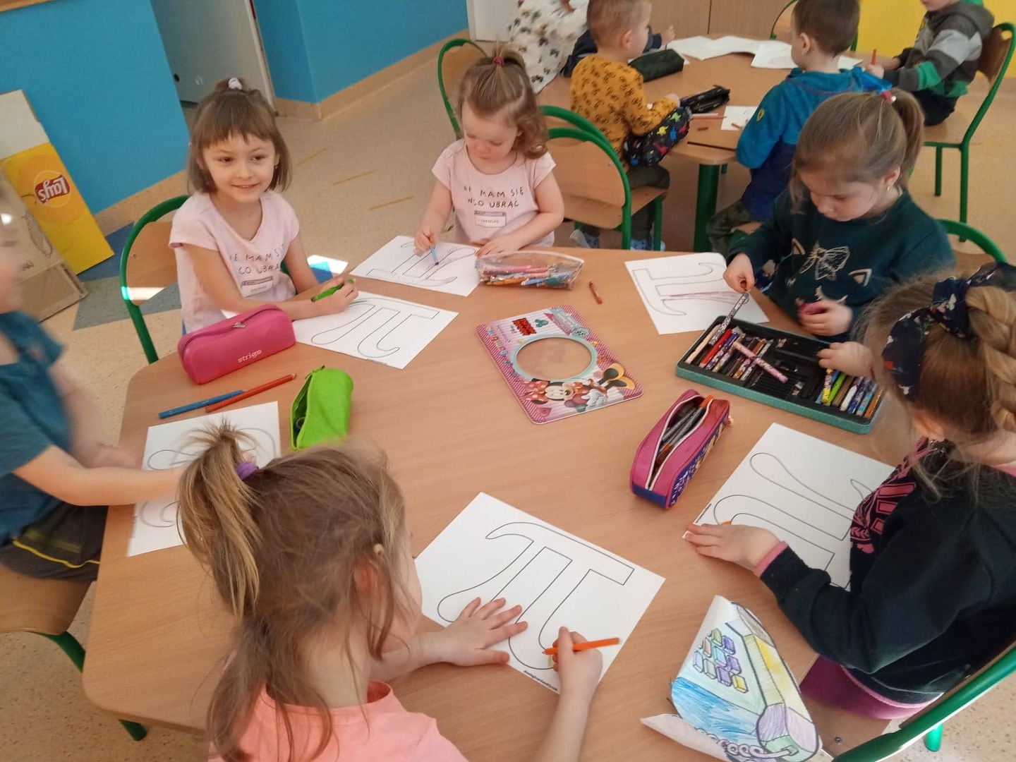 Przedszkolaki na zajęciach plastycznych zaznajomili się z symbolem liczby Pi, który pięknie ozdabiali.