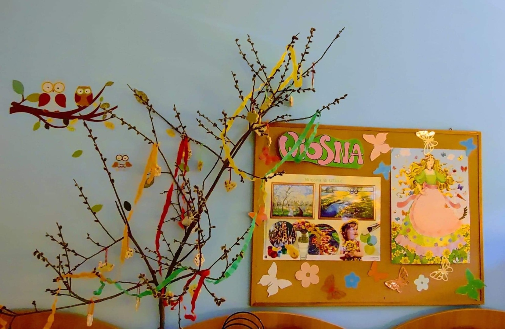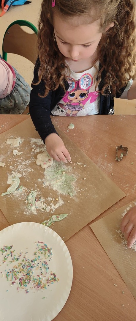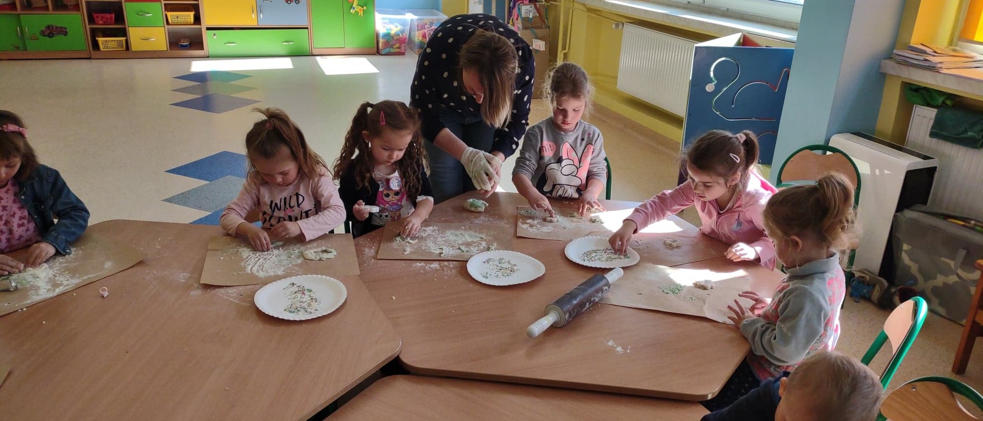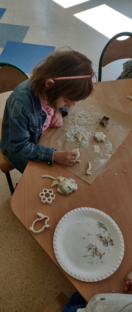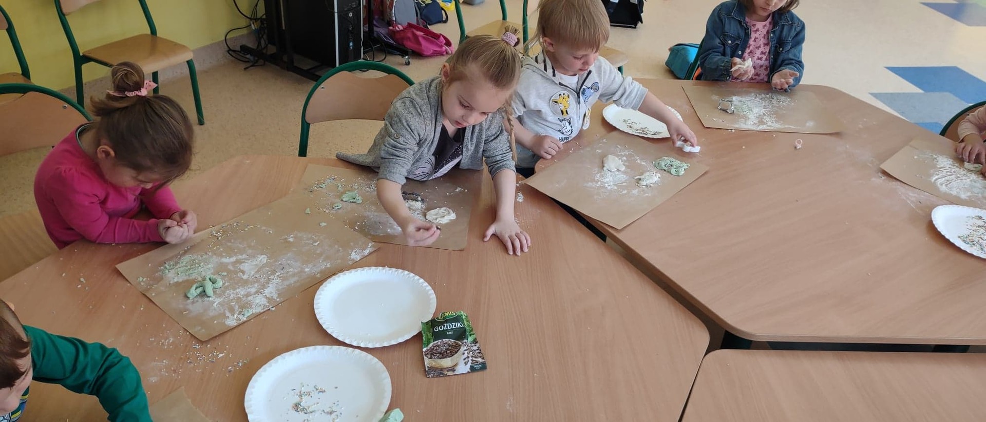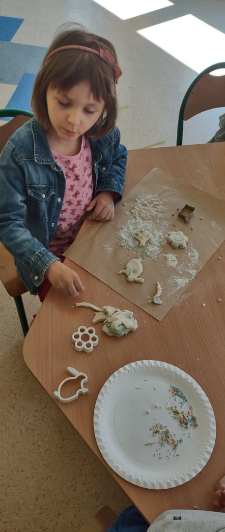 Tymczasem grupa 0a świetnie bawiła się na wiosennych warsztatch bibliotecznych. Dzieci pracowały z książeczkami z serii "Ulica Czereśniowa", poznając poszczególne pory roku. Dodatkowo z masy solnej ulepiły piękne, wiosenne ozdoby, które zawiesiły na drzewku w sali.