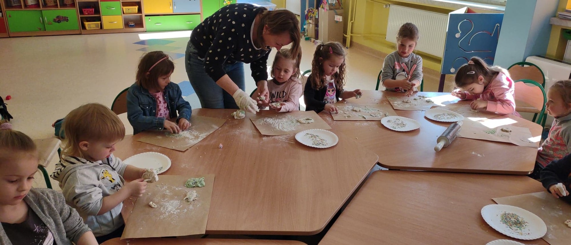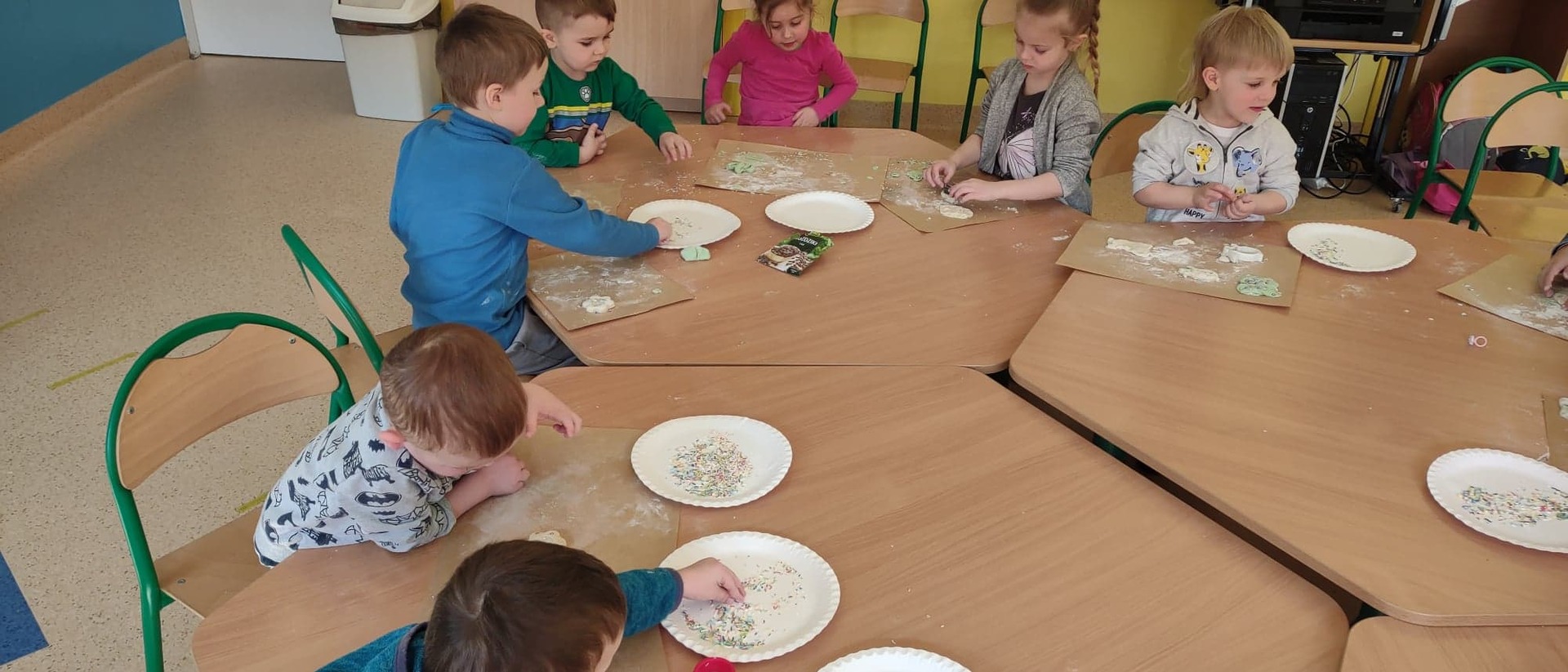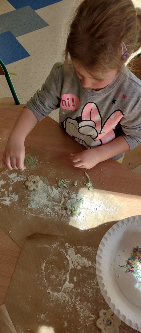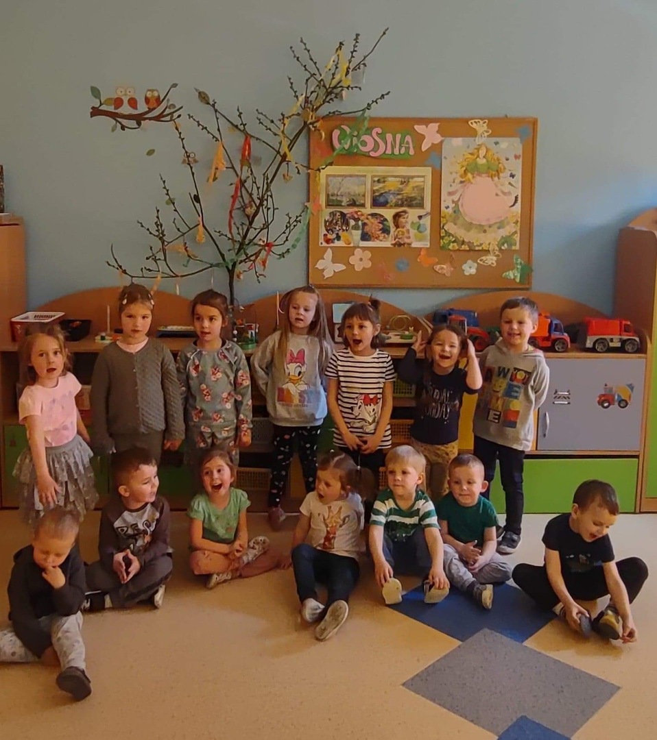 Tymczasem grupa 0a świetnie bawiła się na wiosennych warsztatch bibliotecznych. Dzieci pracowały z książeczkami z serii "Ulica Czereśniowa", poznając poszczególne pory roku. Dodatkowo z masy solnej ulepiły piękne, wiosenne ozdoby, które zawiesiły na drzewku w sali.