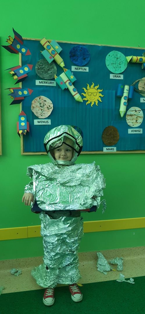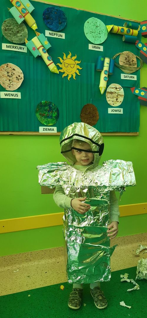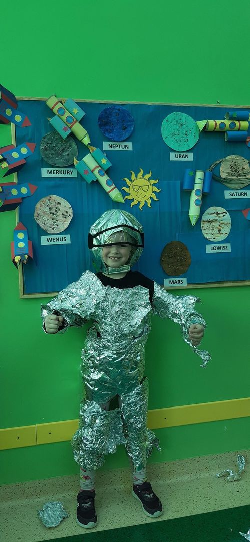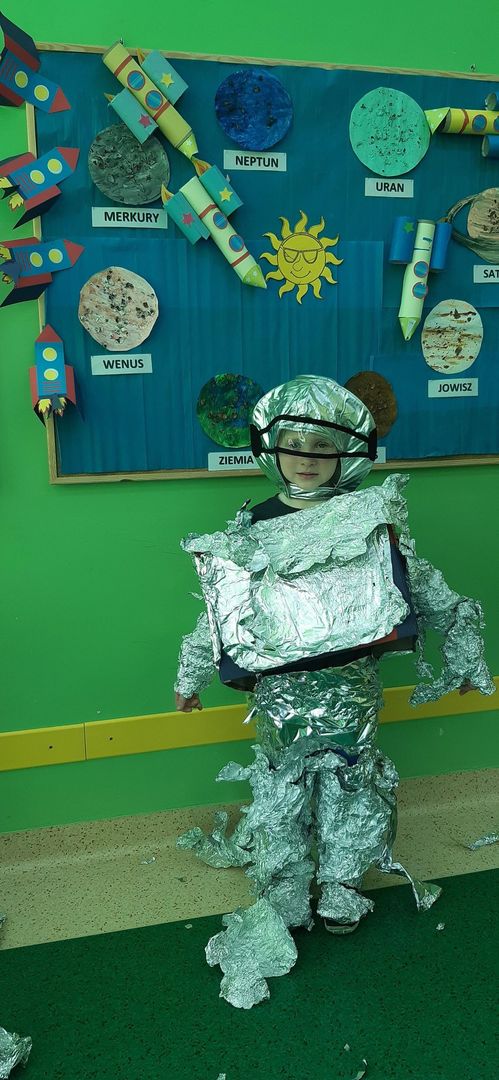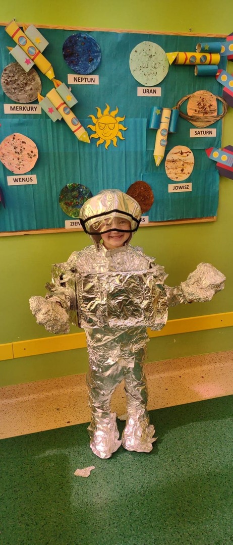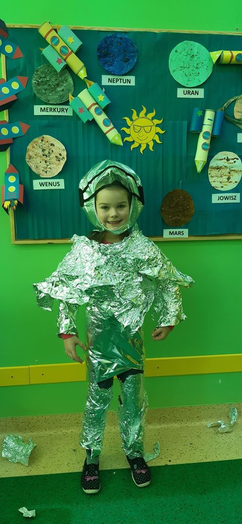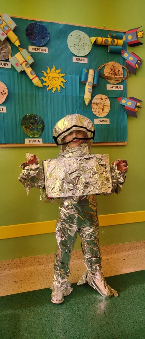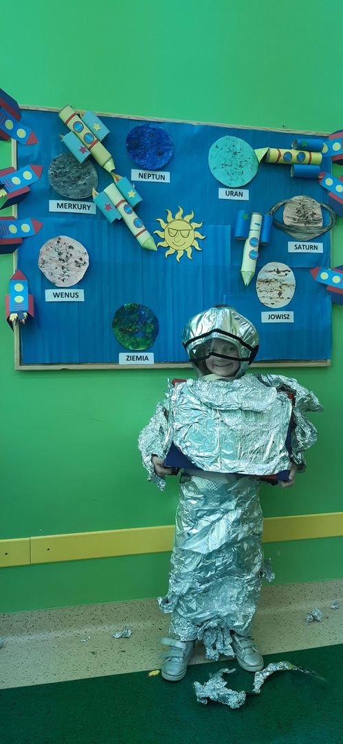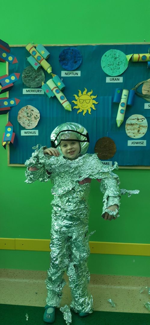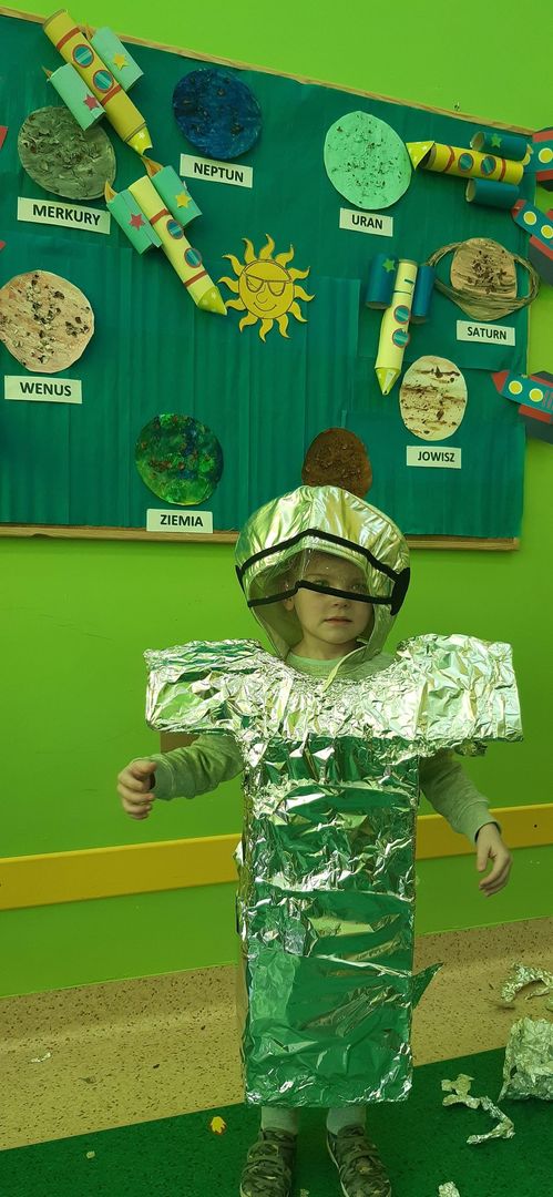 Podczas zajęć o kosmosie dzieci nie tylko dowiedziały się różnych ciekawych informacji o Układzie Słonecznym, ale również mogły poczuć się jak prawdziwi astronauci! Zobaczcie na te cudowne skafandry! Podobno już członkowie NASA dzwonili w ich sprawie ;)