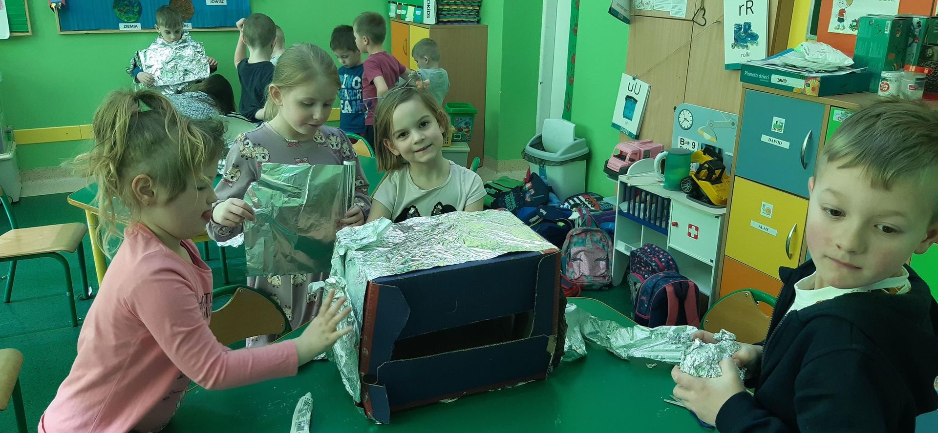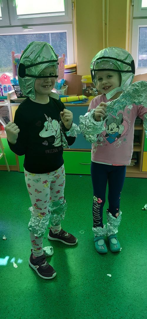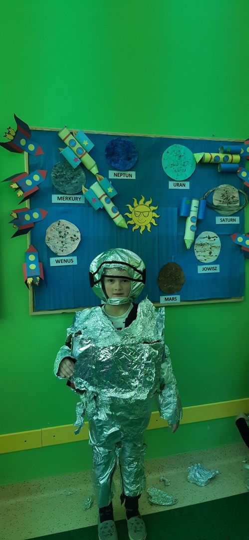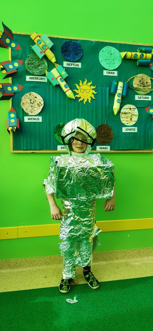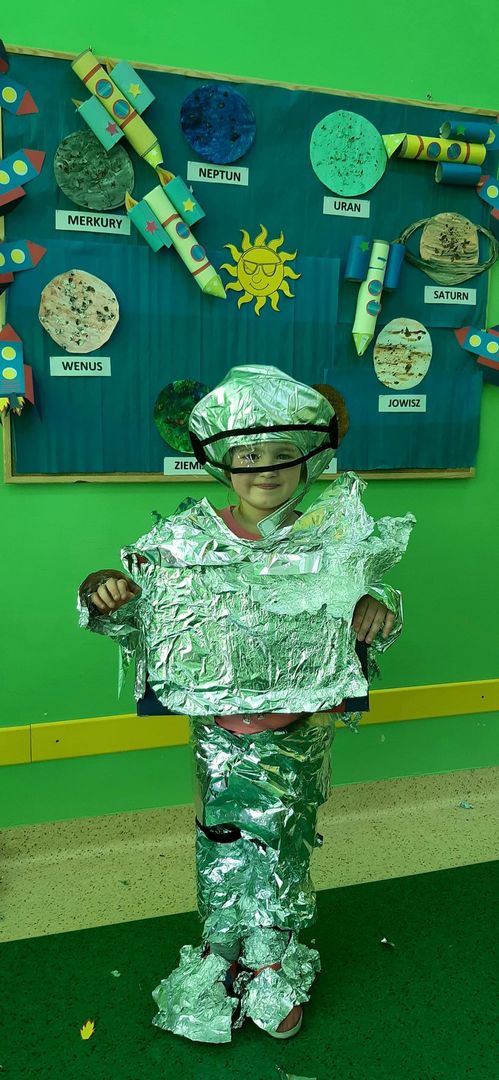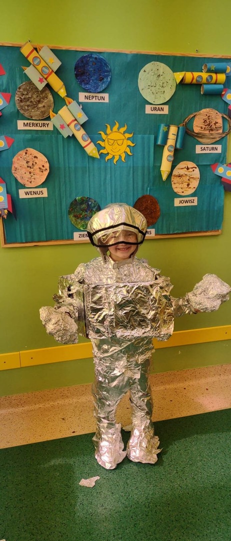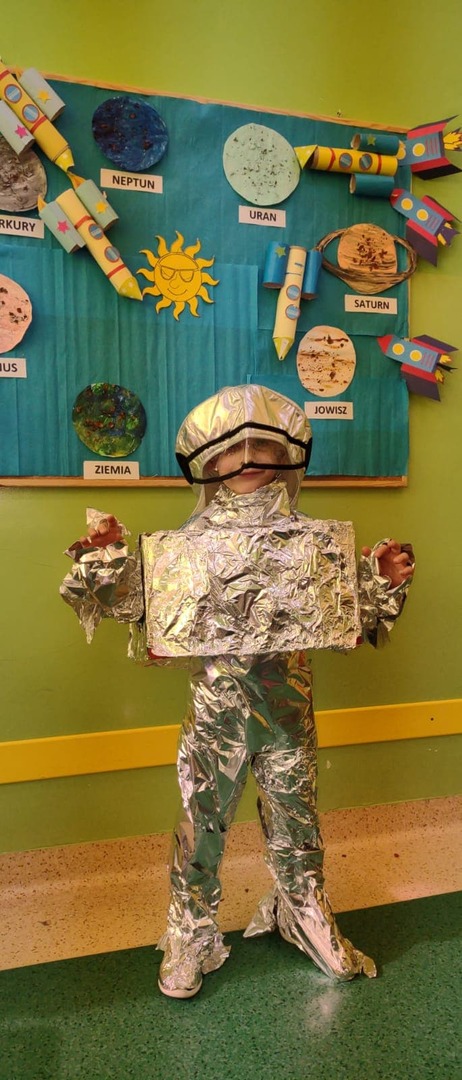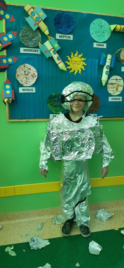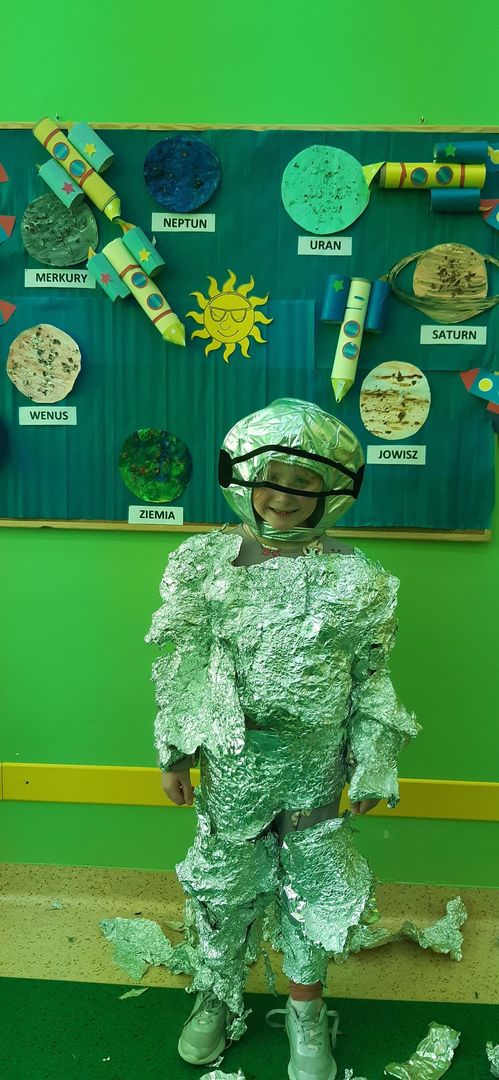 Podczas zajęć o kosmosie dzieci nie tylko dowiedziały się różnych ciekawych informacji o Układzie Słonecznym, ale również mogły poczuć się jak prawdziwi astronauci! Zobaczcie na te cudowne skafandry! Podobno już członkowie NASA dzwonili w ich sprawie ;)