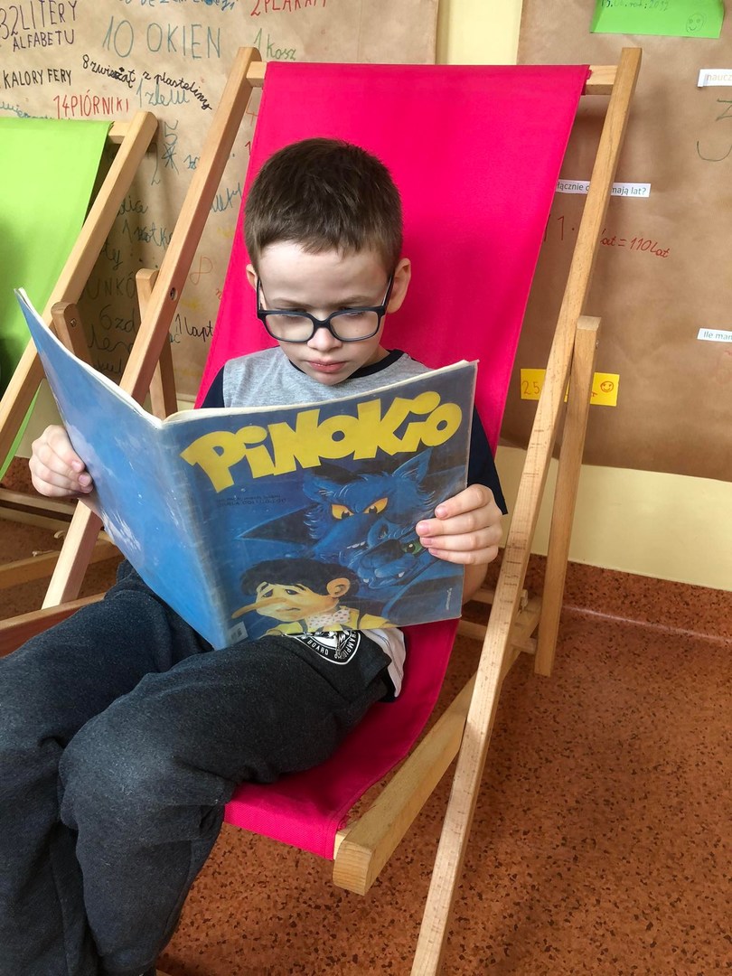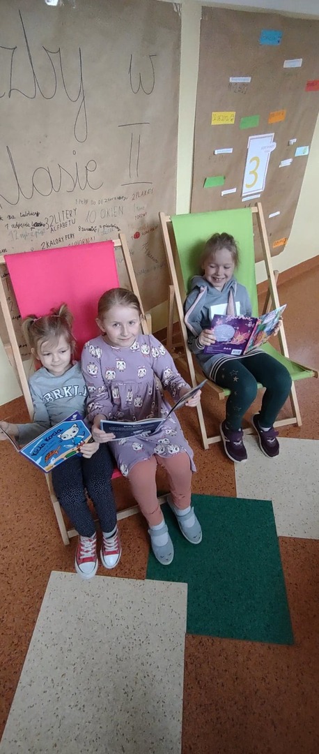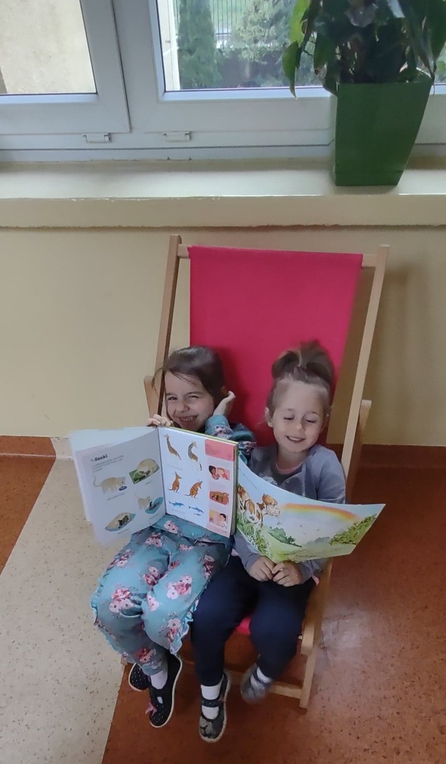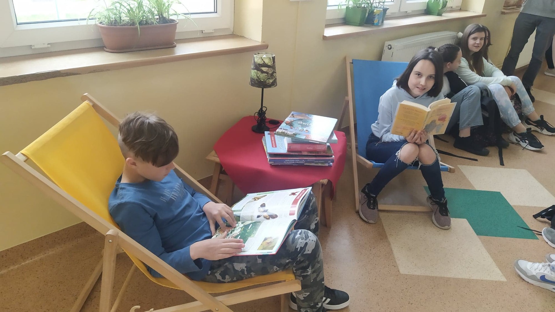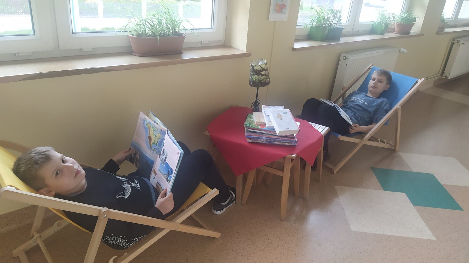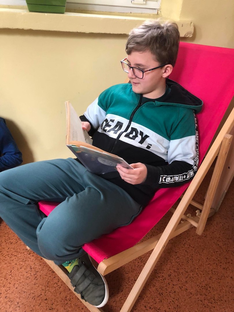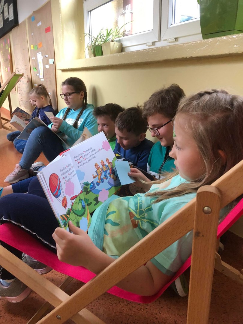 W poniedziałek 23 kwietnia świętowaliśmy Dzień Książki. Z tej okazji książki z naszej biblioteki w magiczny sposób przywędorwały na nasze szkolne korytarze. Ponieważ wygodna pozycja przy czytaniu jest bardzo ważna, razem z książkami pojawiły się nasze kolorowe leżaczki :)