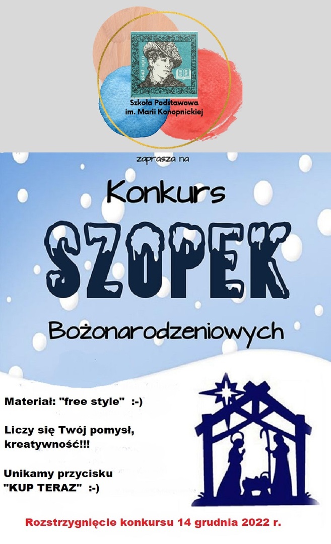 Serdecznie zapraszamy wszystkich chętnych Uczniów do udziały w konkursach - kolęd i pastorałek oraz na szopkę bożonarodzeniową.