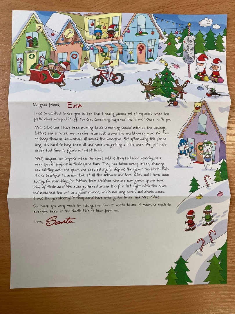 Mikołaj odpisał! 🥳 w listopadzie uczniowie klas 1-3 na lekcjach języka angielskiego stworzyli wspólnie list do Mikołaja, pani Ewa zmieniła się w elfa i wysłała go a dzisiaj doczekaliśmy się na odpowiedź! Byliśmy bardzo podekscytowani otwierając i czytając list ❤️ cieszymy się, że udało się otrzymać odpowiedź przed świętami 🎄 Mikołaj podziękował za list i nasze rysunki, które mu wysłaliśmy oraz życzył nam Wesołych Świąt!