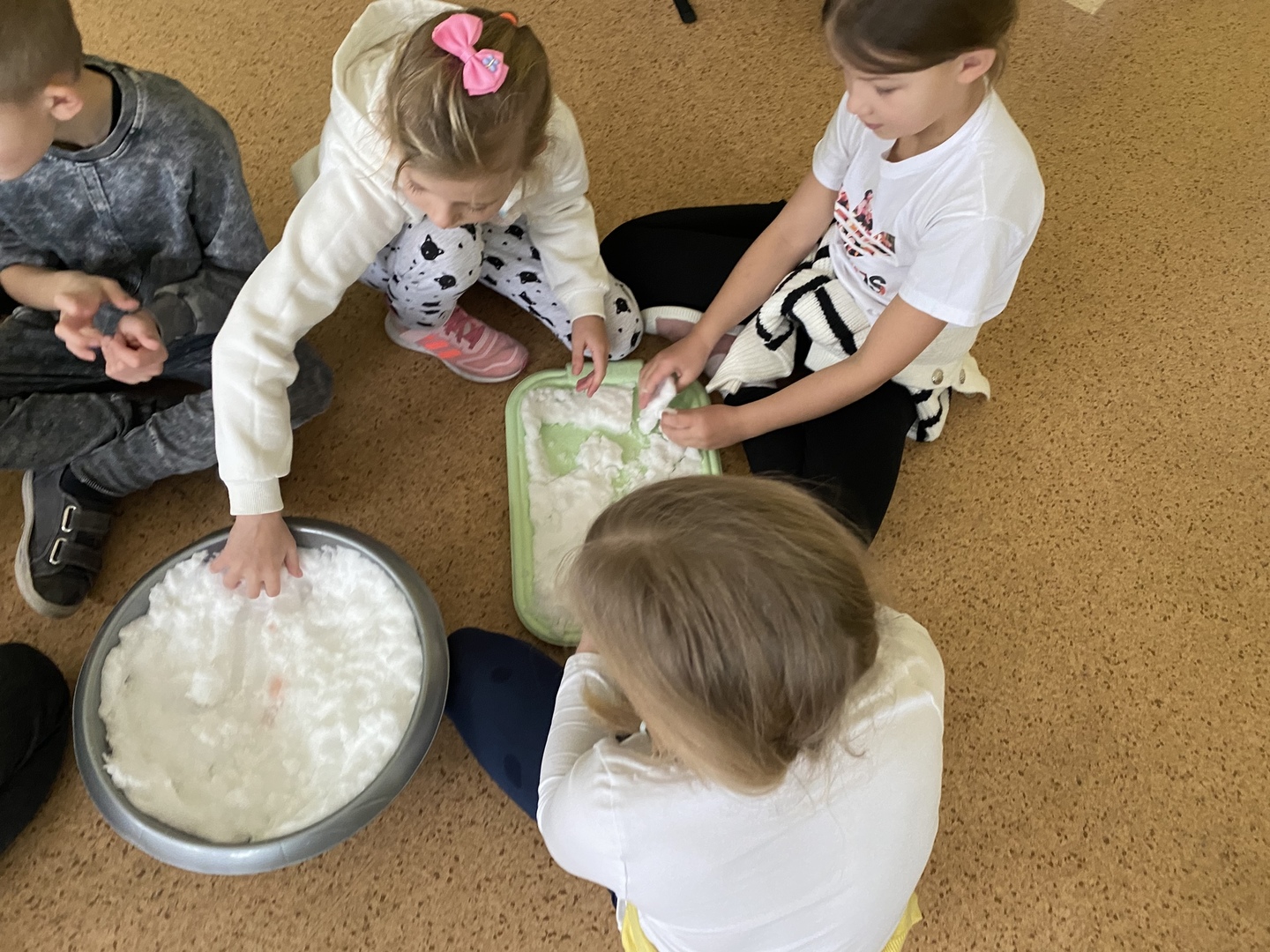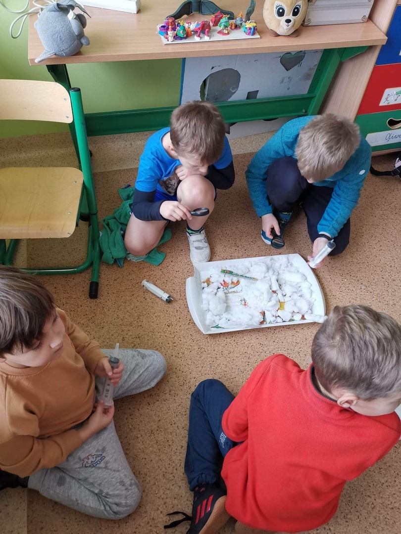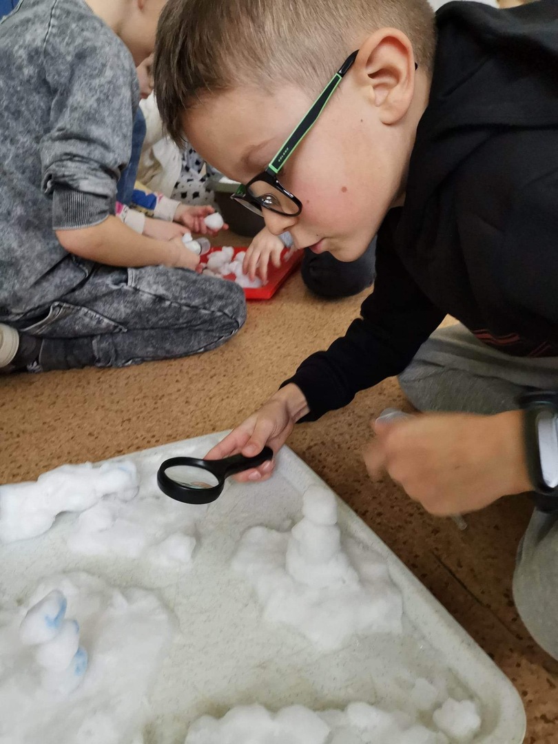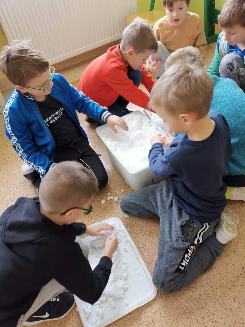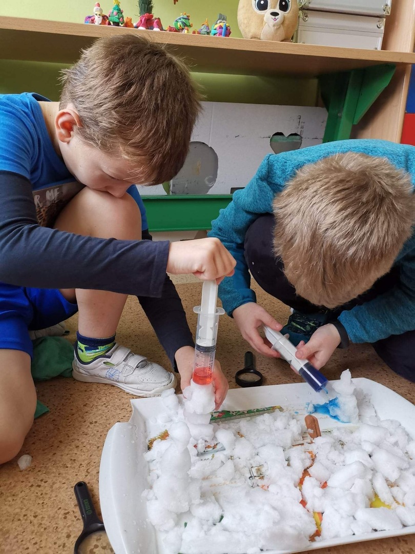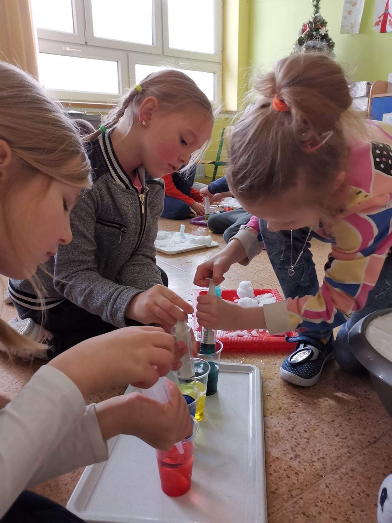 W pojemnikach zabrali ze sobą śnieg, na którym przeprowadzali kolorowe eksperymenty, lepili małe bałwany oraz śniegowe tory dla szklanych kulek.