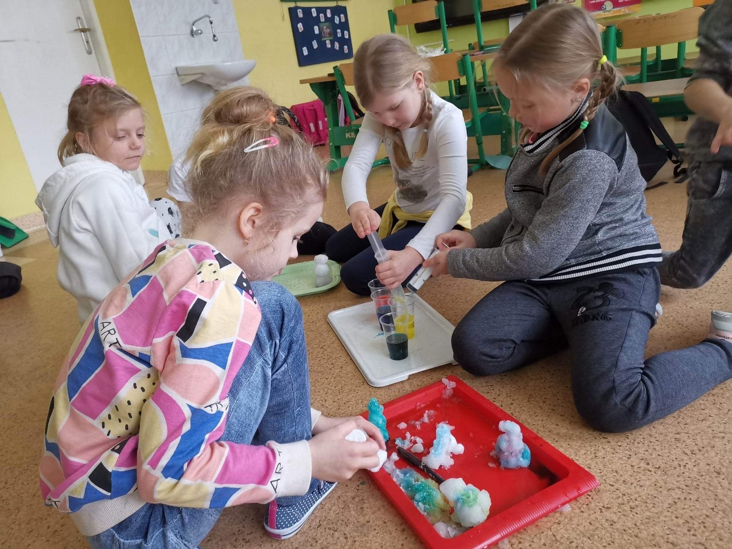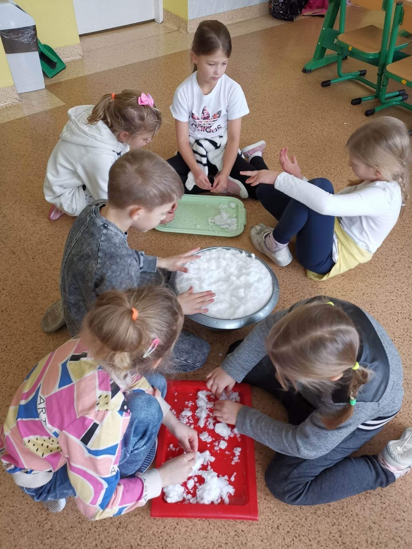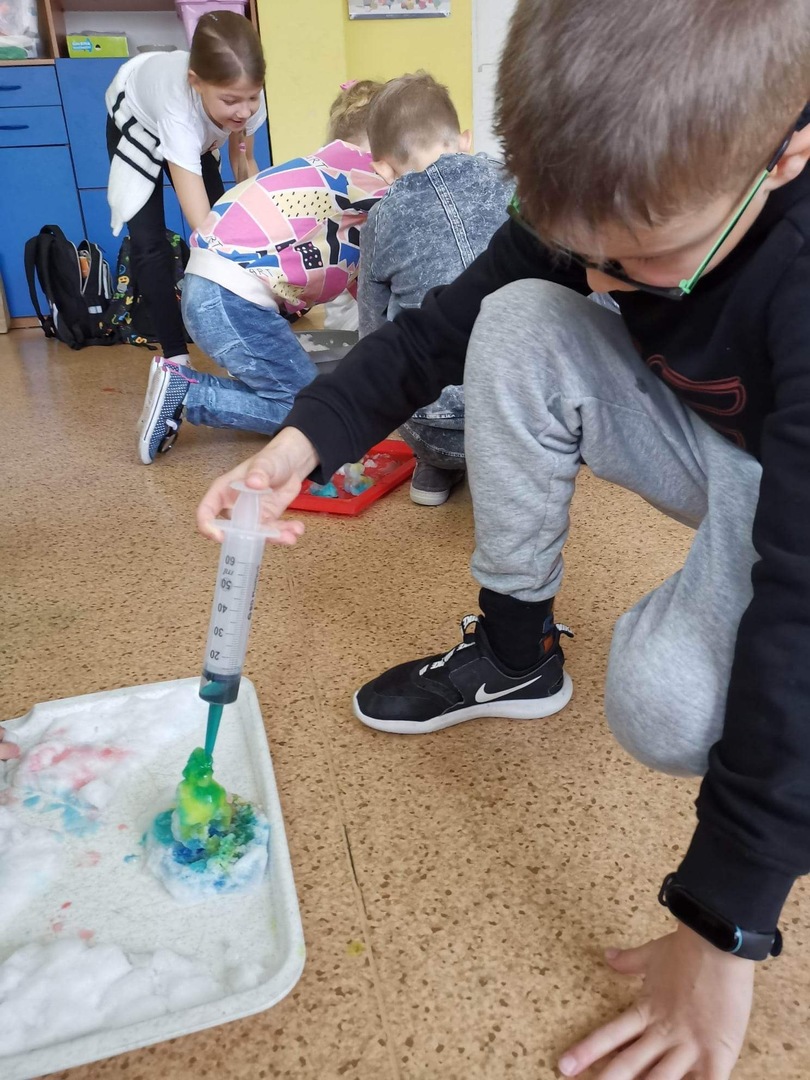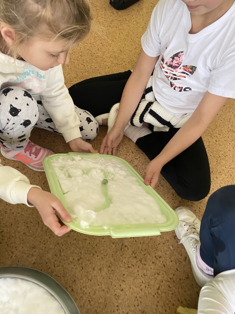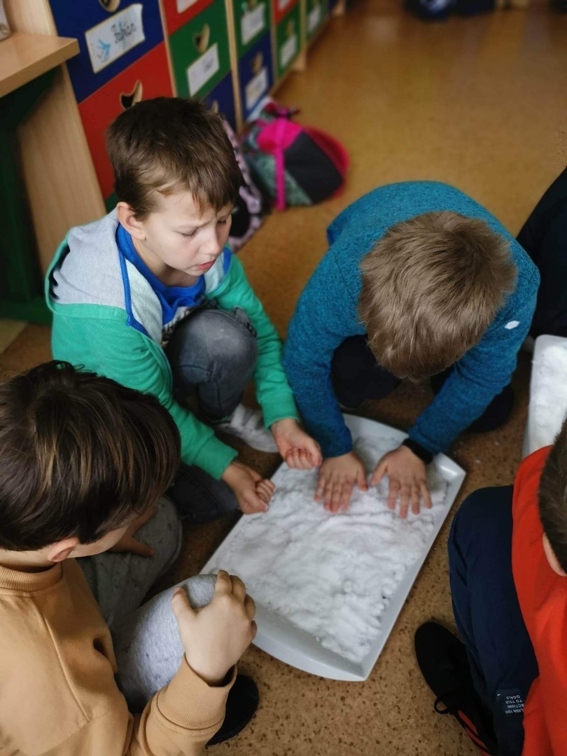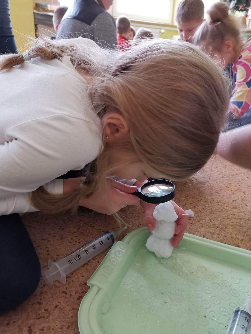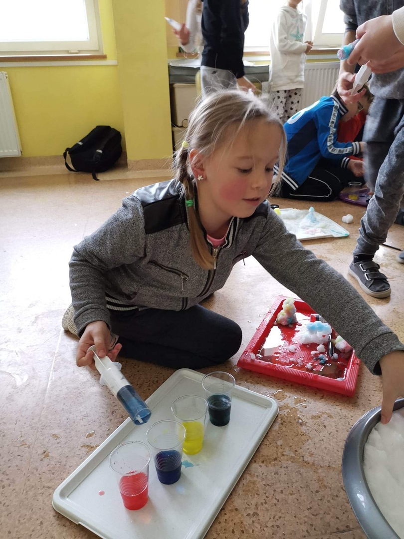 W pojemnikach zabrali ze sobą śnieg, na którym przeprowadzali kolorowe eksperymenty, lepili małe bałwany oraz śniegowe tory dla szklanych kulek.