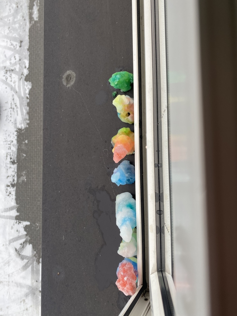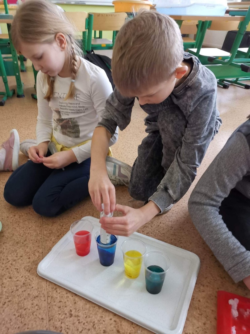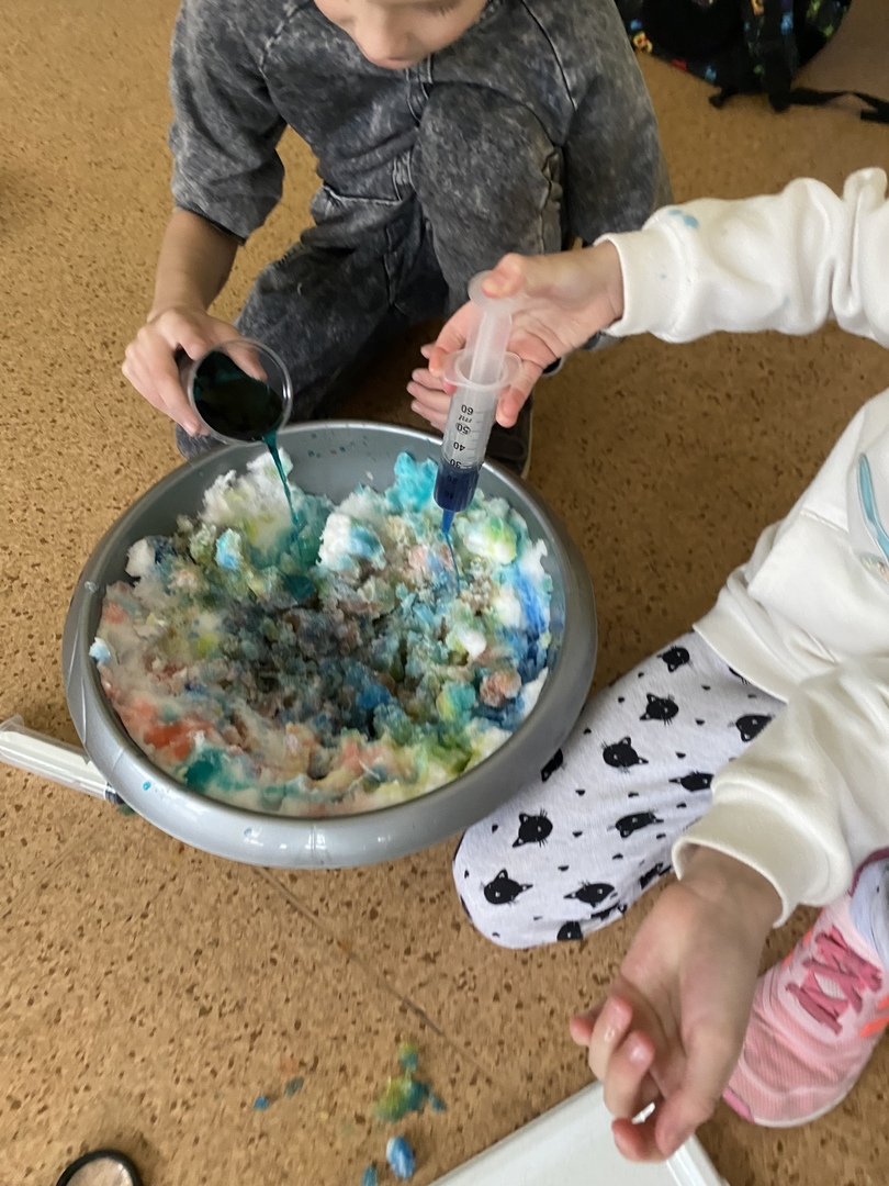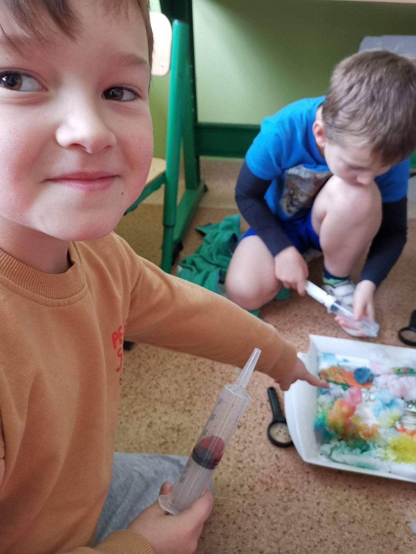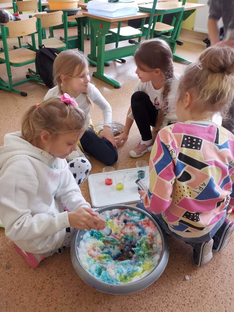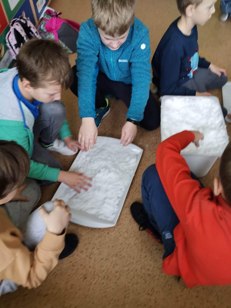 W pojemnikach zabrali ze sobą śnieg, na którym przeprowadzali kolorowe eksperymenty, lepili małe bałwany oraz śniegowe tory dla szklanych kulek.