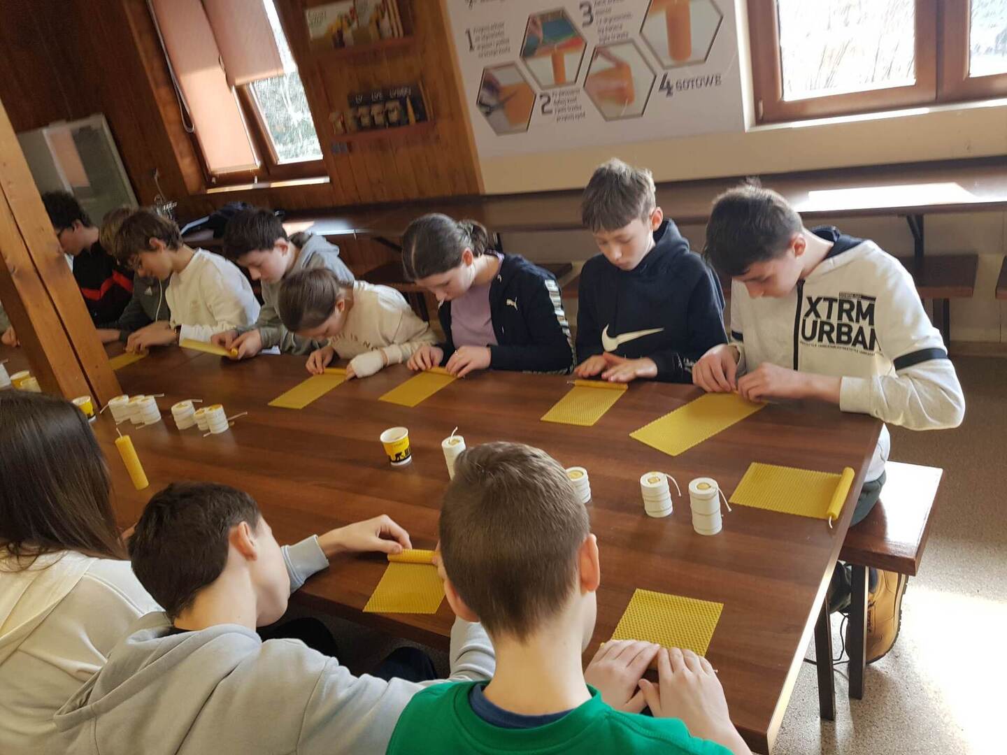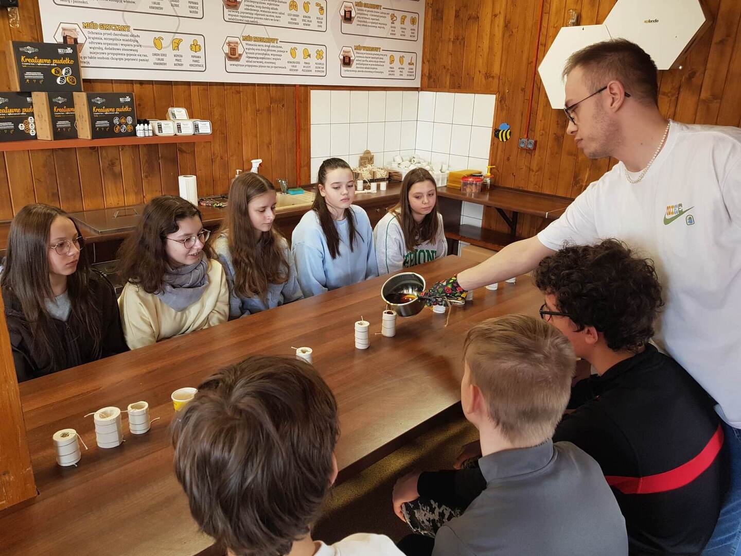 Drugą część stanowiły warsztaty, podczas których wykonywaliśmy świece, próbowaliśmy pyłku pszczelego i miodu. Mieliśmy też okazję z bliska obserwować pszczoły.