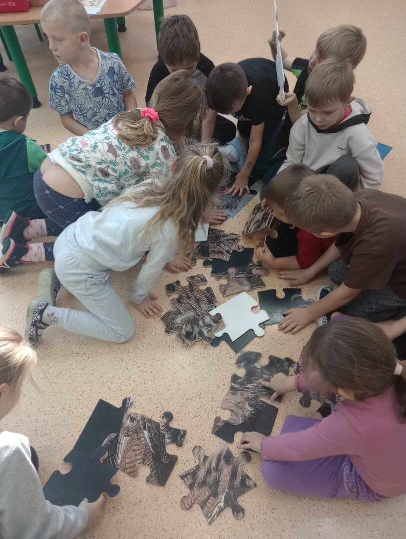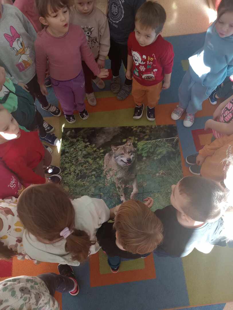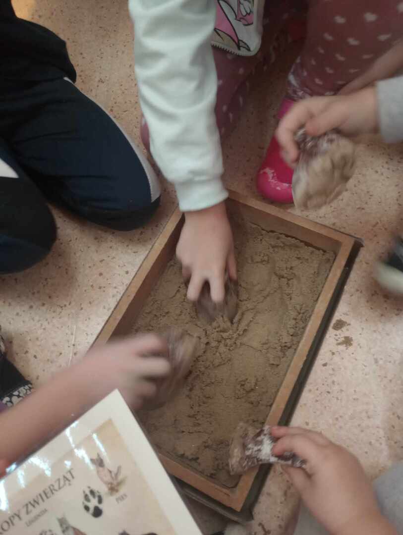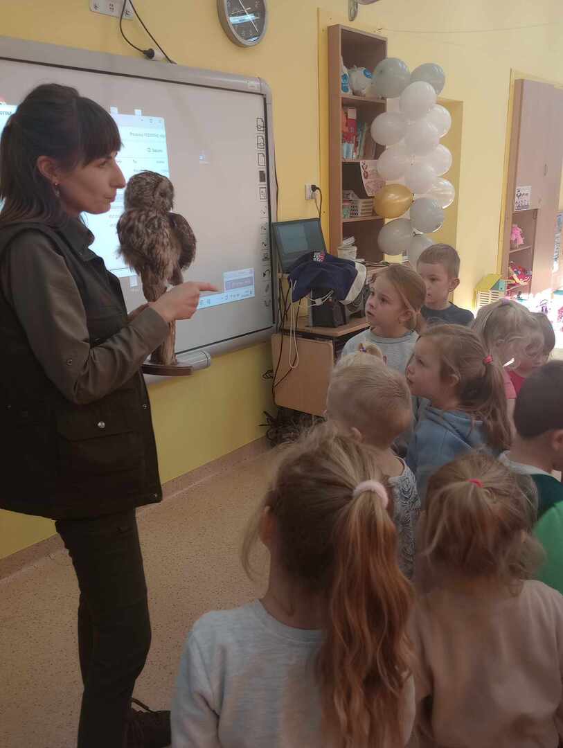 Po wizycie w klasach 1-3, przedstawicielka udała się do oddziałów przedszkolnych. Na początku spotkania Pani leśniczy zaprezentowała dzieciom swój mundur, następnie opowiedziała Biedronkom i Jeżykom o swojej pracy, o lesie i mieszkających w nim zwierzętach. Podkreśliła, że człowiek jest gościem w lesie i musi szanować zwyczaje gospodarzy, czyli zwierząt w nim mieszkających. Podczas spotkania dzieci miały okazję poznać zwyczaje wybranych zwierząt (sarny, dzika, lisa) zamieszkujących lasy naszej okolicy oraz ich tropy – dzieci odbijały ślady zwierząt w piasku. Uczestnicy spotkania mogli ułożyć wieloformatowe puzzle oraz zobaczyć sowę.