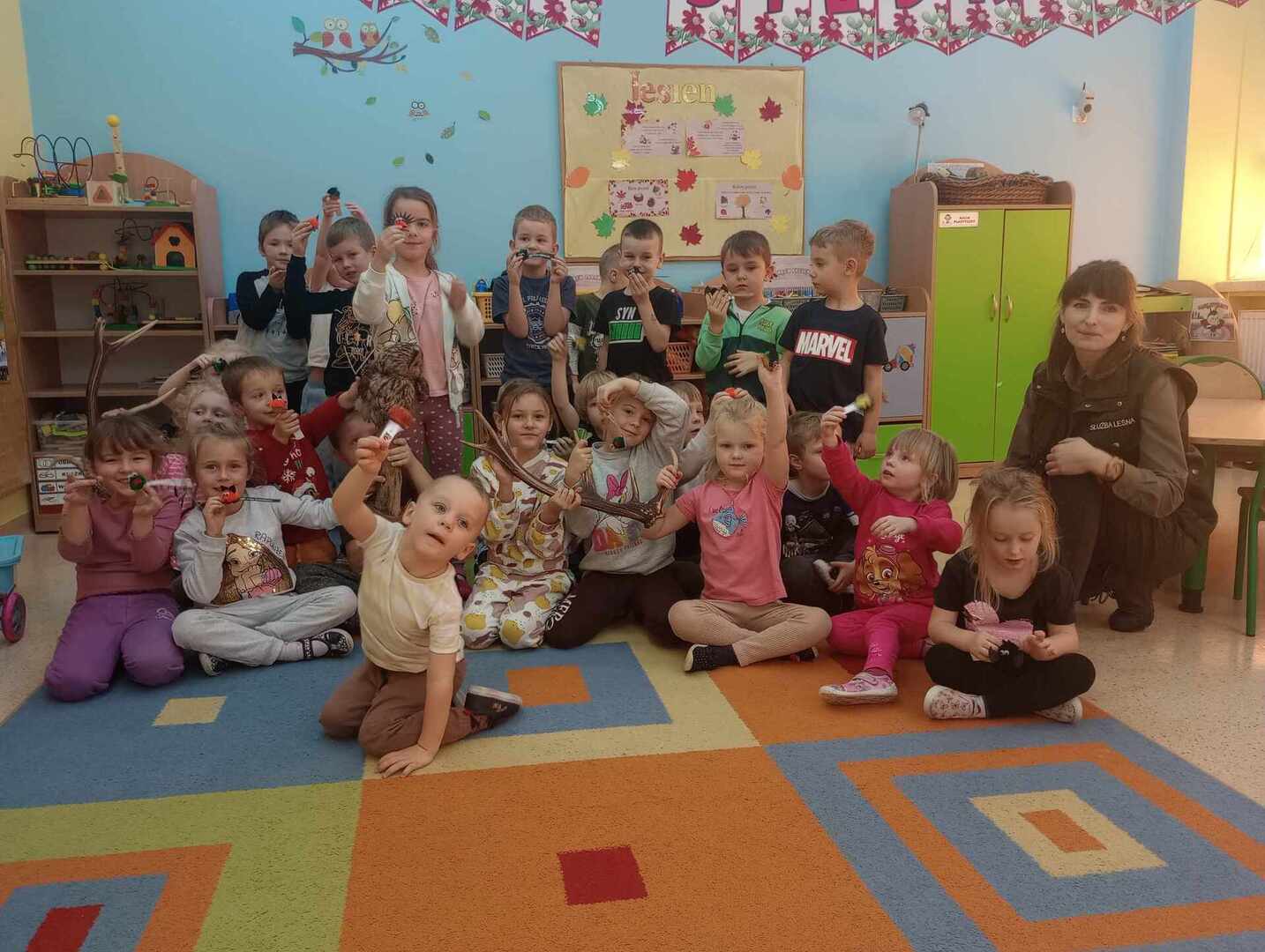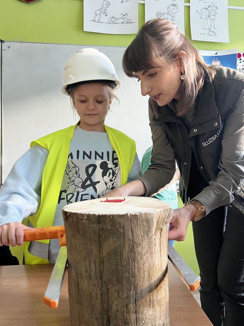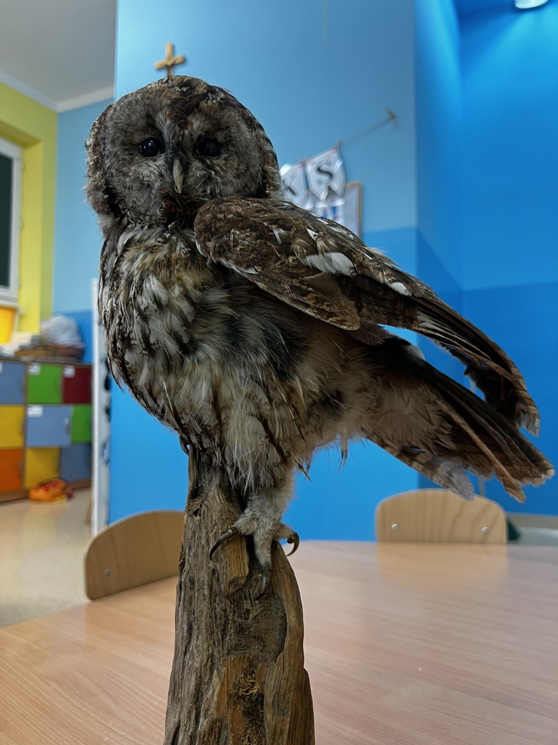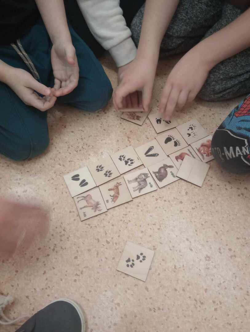 Po wizycie w klasach 1-3, przedstawicielka udała się do oddziałów przedszkolnych. Na początku spotkania Pani leśniczy zaprezentowała dzieciom swój mundur, następnie opowiedziała Biedronkom i Jeżykom o swojej pracy, o lesie i mieszkających w nim zwierzętach. Podkreśliła, że człowiek jest gościem w lesie i musi szanować zwyczaje gospodarzy, czyli zwierząt w nim mieszkających. Podczas spotkania dzieci miały okazję poznać zwyczaje wybranych zwierząt (sarny, dzika, lisa) zamieszkujących lasy naszej okolicy oraz ich tropy – dzieci odbijały ślady zwierząt w piasku. Uczestnicy spotkania mogli ułożyć wieloformatowe puzzle oraz zobaczyć sowę.