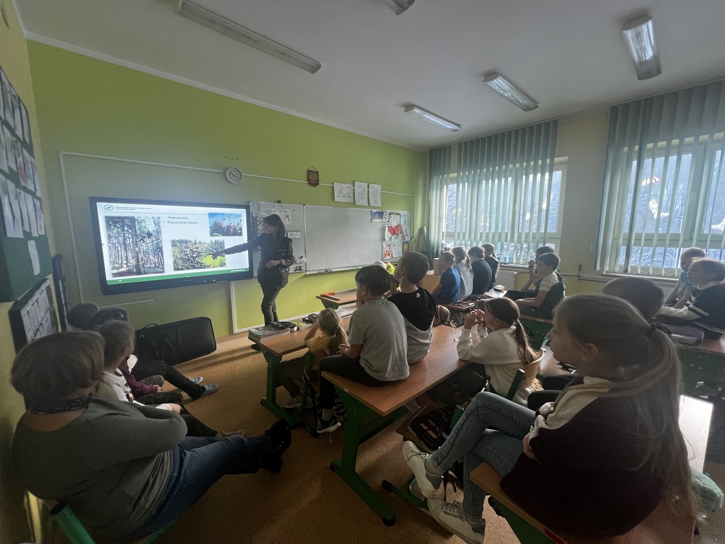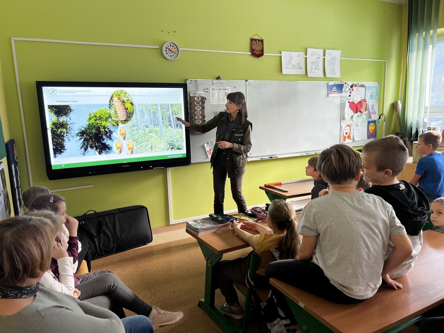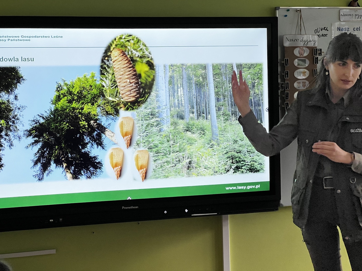Przedstawicielka Nadleśnictwa rozpoczęła swoją prezentację multimedialną, zabierając nas w podróż przez tajemnicze lasy. Wizualne opowieści o różnorodności flory i fauny zachwycały każdego. Uczniowie mieli szansę poznać fascynujące fakty o życiu leśnych mieszkańców i zrozumieć, dlaczego lasy są tak niezwykłym ekosystemem.