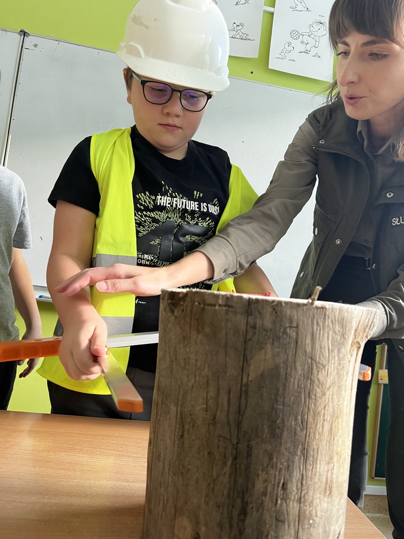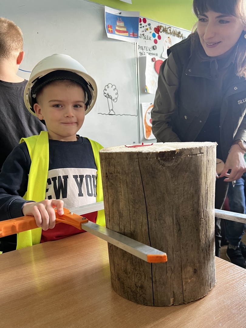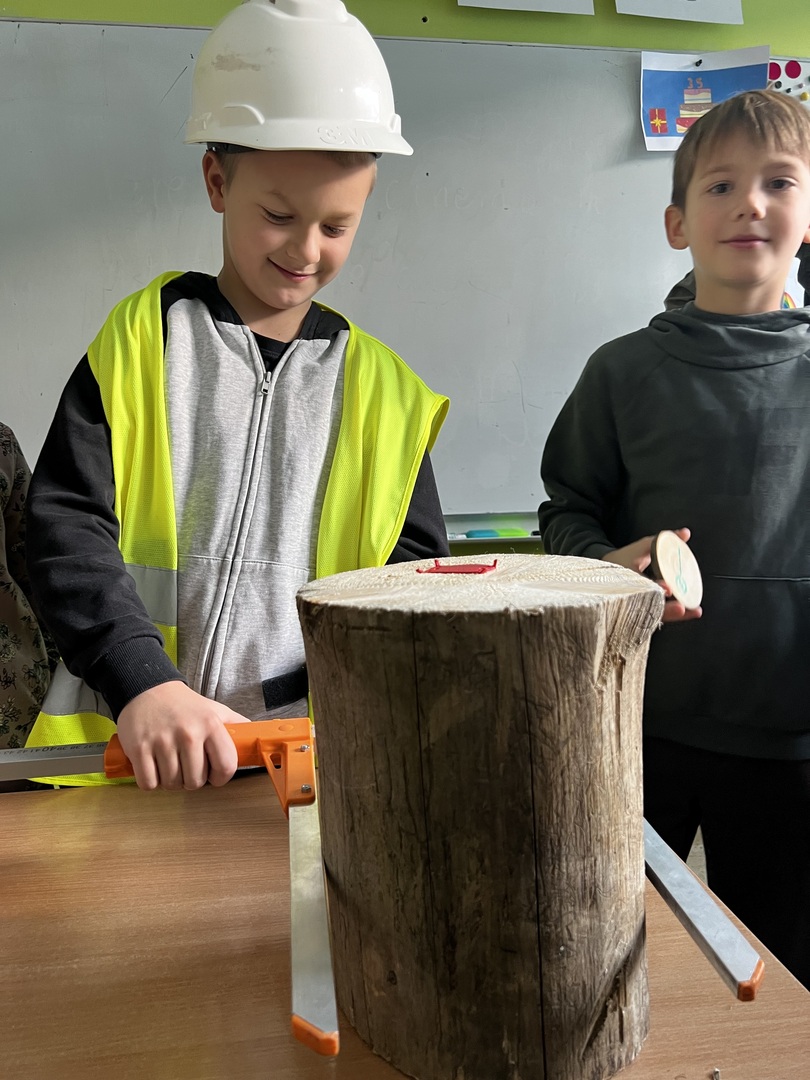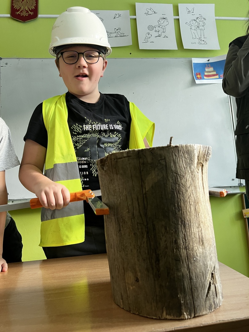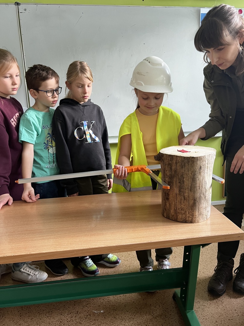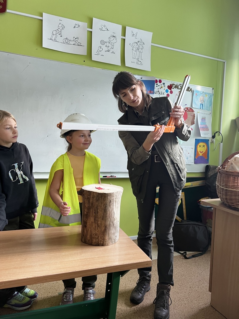 Jednak to nie wszystko! Była też praktyczna część spotkania. Dzieci miały okazję poznać tajniki pomiaru drzewa. To było niezwykłe doświadczenie, gdyż każdy mógł spróbować swoich sił w tej leśnej sztuce. Atmosfera była pełna radości i entuzjazmu, gdy uczniowie mierzyli i porównywali wielkość drzew.