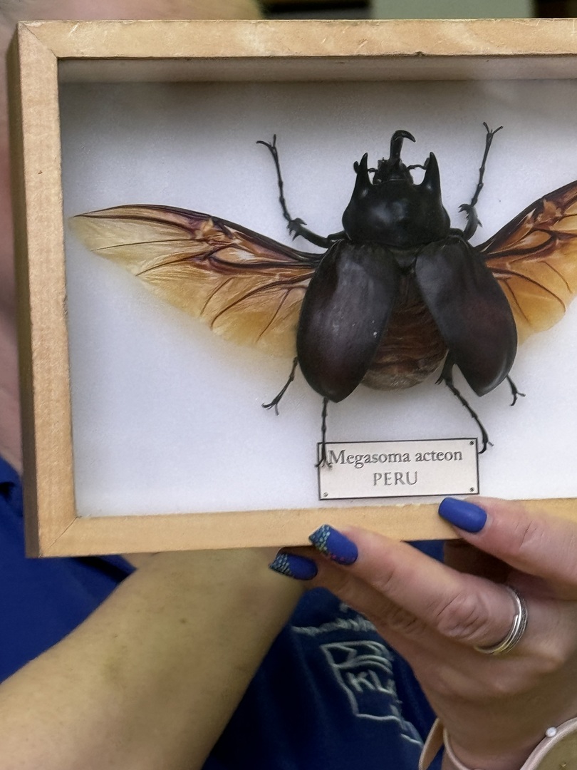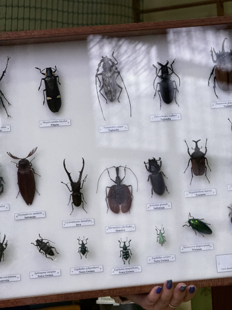 Po części praktycznej przyszedł czas na oglądanie gablot z wystawionymi okazami. Piękne ćmy, motyle oraz chrabąszcze zachwycały nas swoją różnorodnością kształtów, kolorów i rozmiarów. Niektóre z nich były ogromne, co jeszcze bardziej podkreśliło bogactwo świata owadów.