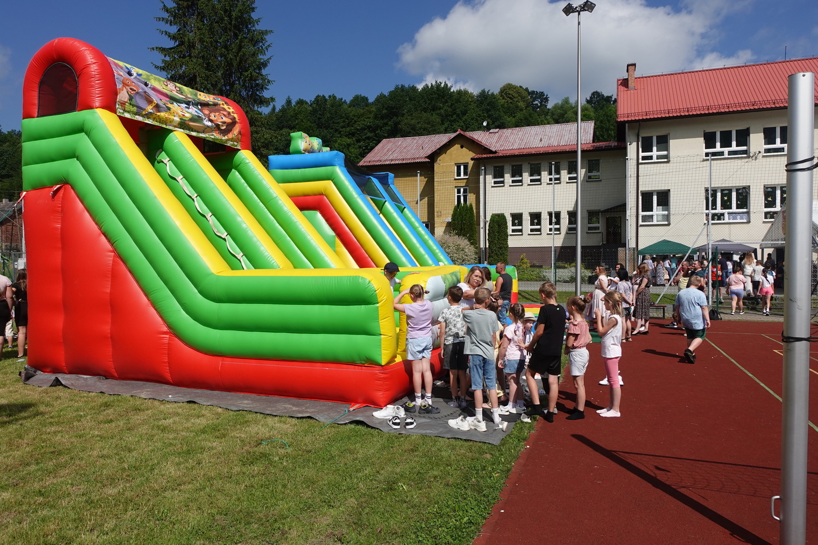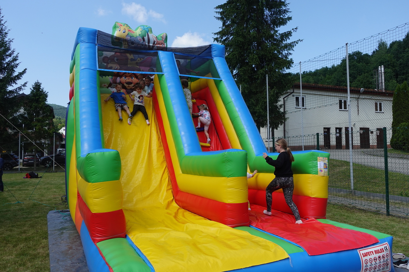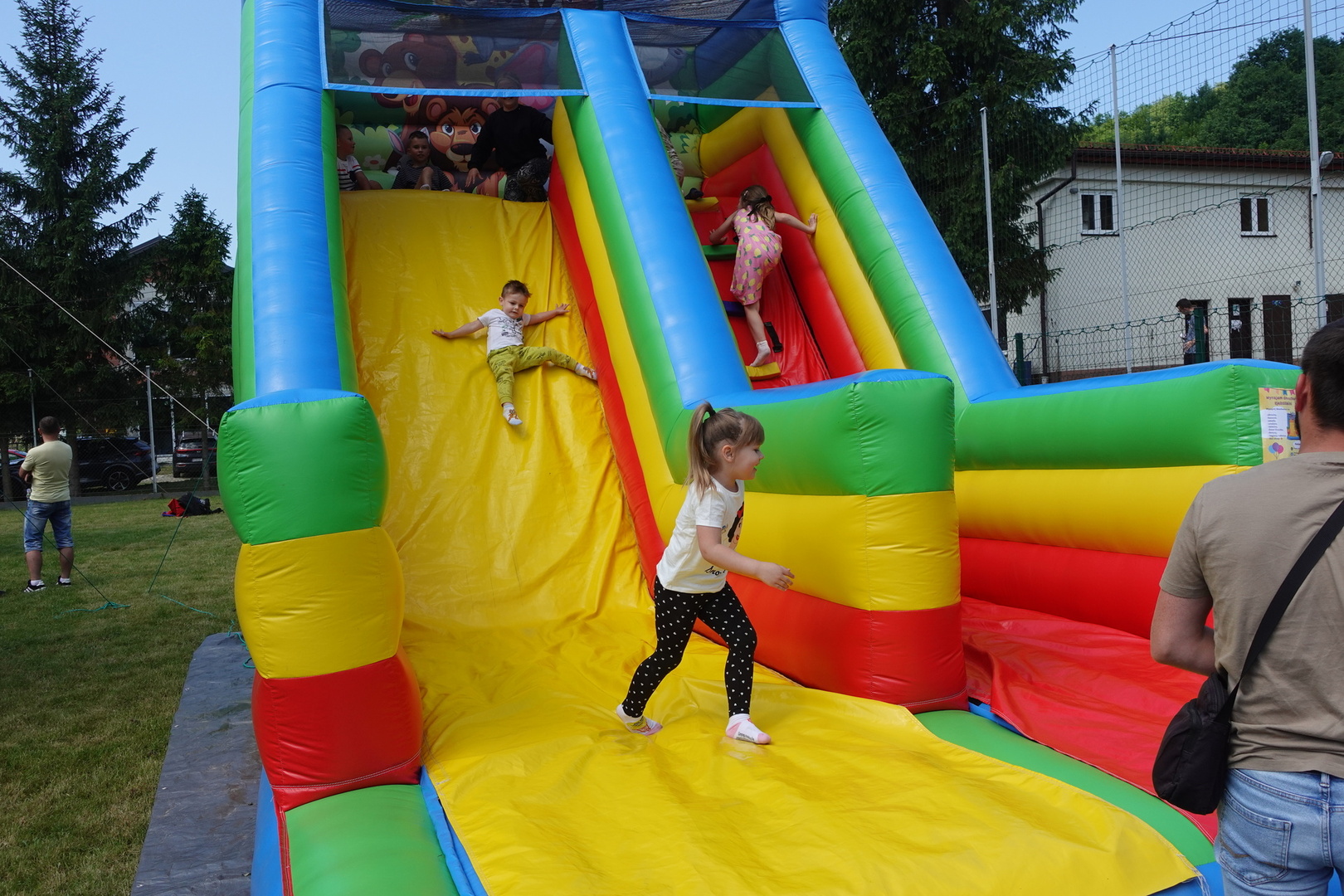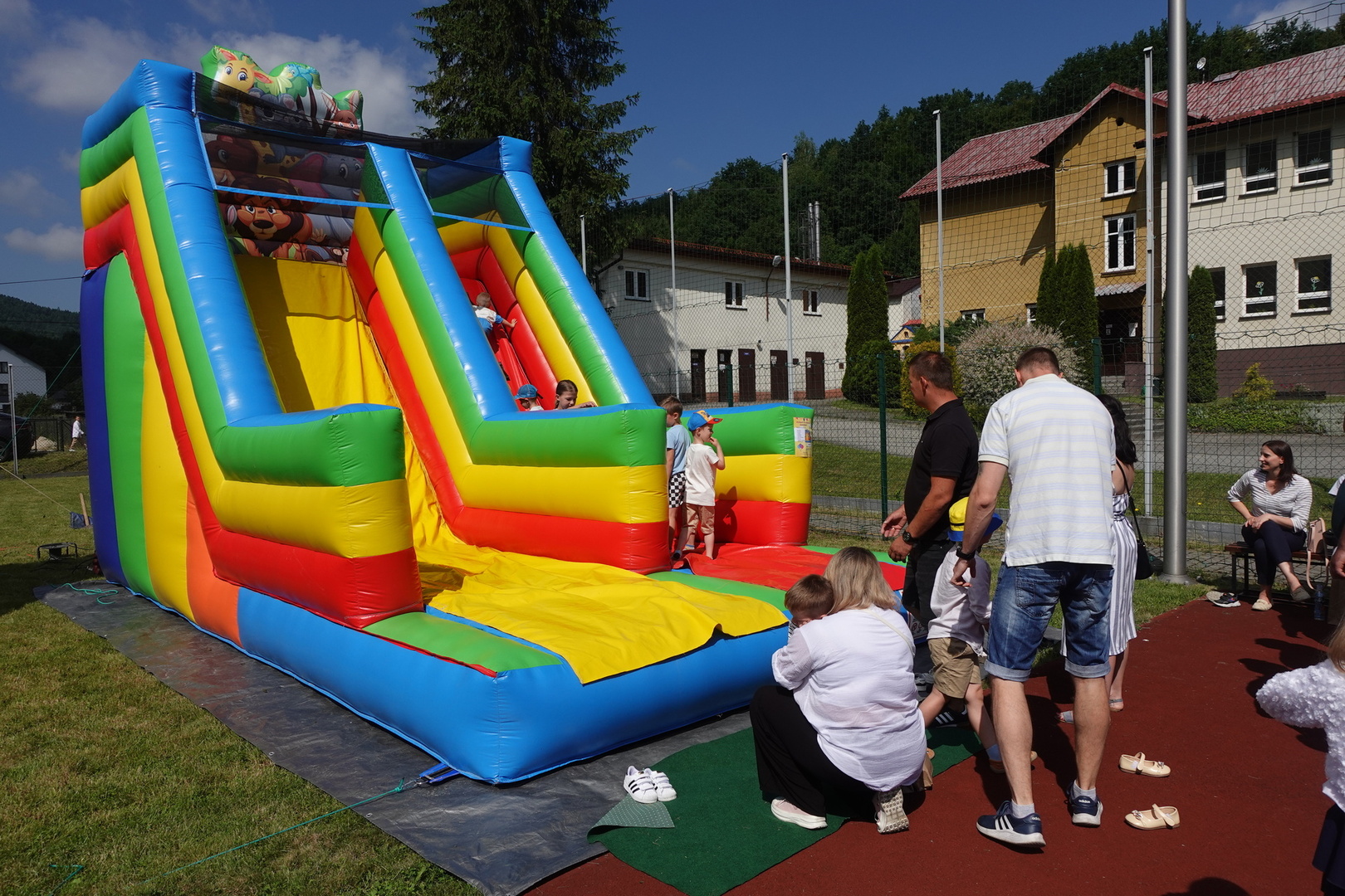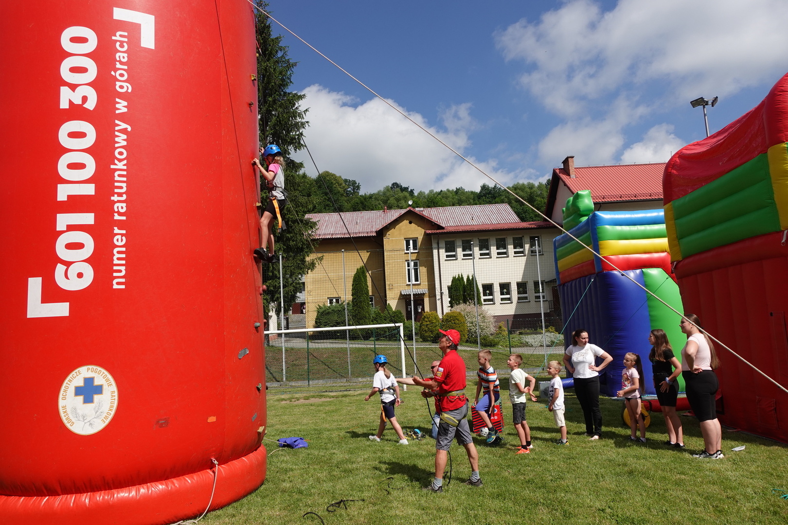 Po części oficjalnej nadszedł czas na zabawę. Dzięki wsparciu Rady Rodziców dzieci miały okazję korzystać z dmuchańców, które zapewniały mnóstwo śmiechu i radości. Lokalny oddział GOPR przygotował ściankę wspinaczkową, gdzie mali i duzi mogli sprawdzić swoje umiejętności i poczuć dreszczyk emocji. Dużą popularnością cieszył się także pokaz strażaków z OSP Tarnawa Dolna - zdecydowanie wśród naszych uczniów rośnie nowy strażacki narybek :)