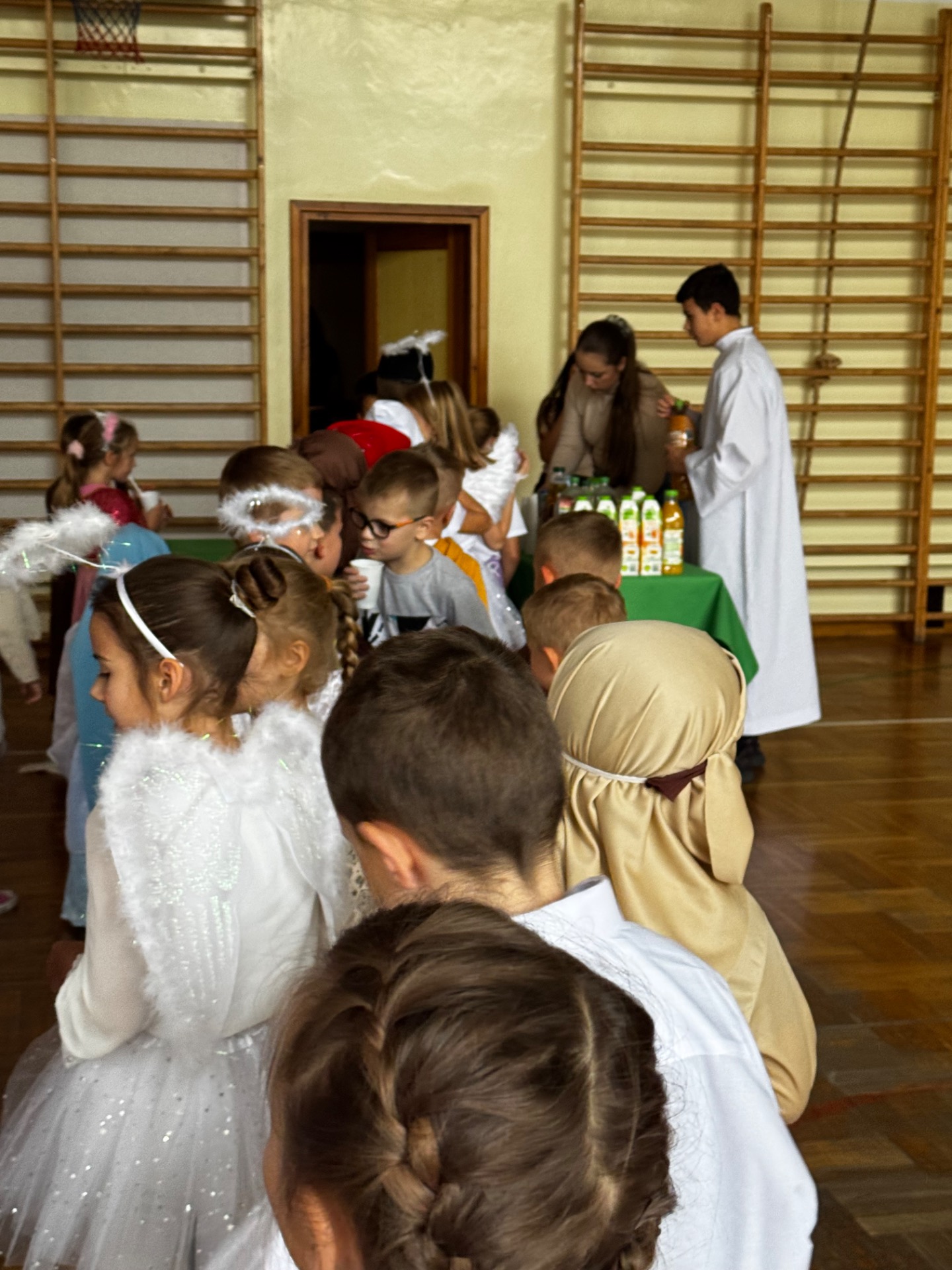 Dzieci miały okazję przebrać się za wybranych świętych, a te, które zdecydowały się na kostium, otrzymały małe, smaczne niespodzianki. W trakcie balu nie brakowało emocji, a prawdziwym hitem okazał się magiczny napój – sok z dodatkiem jadalnego brokatu. Jego niezwykły wygląd zachwycił dzieci i wywołał prawdziwy efekt wow!