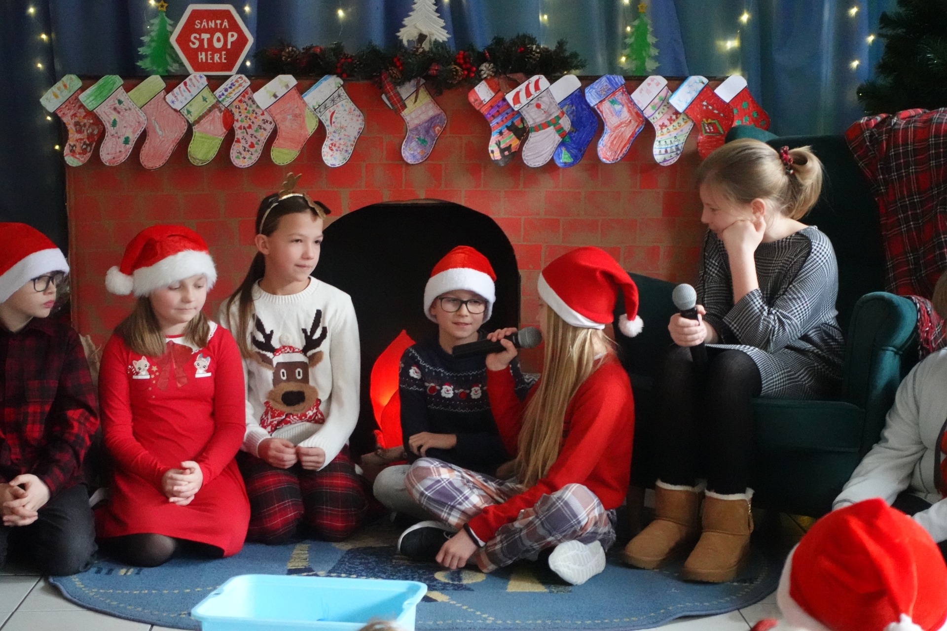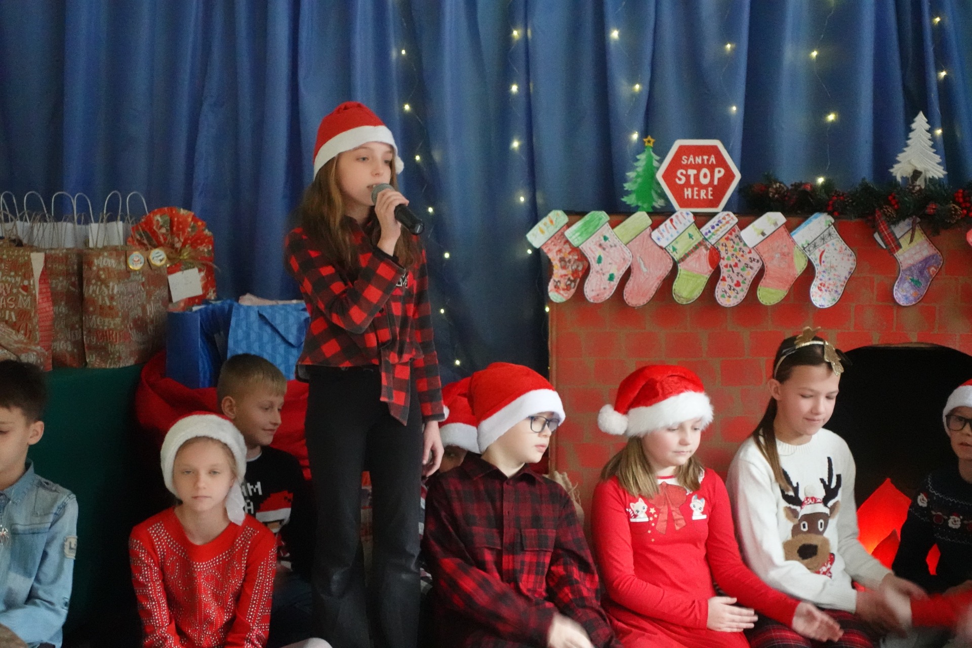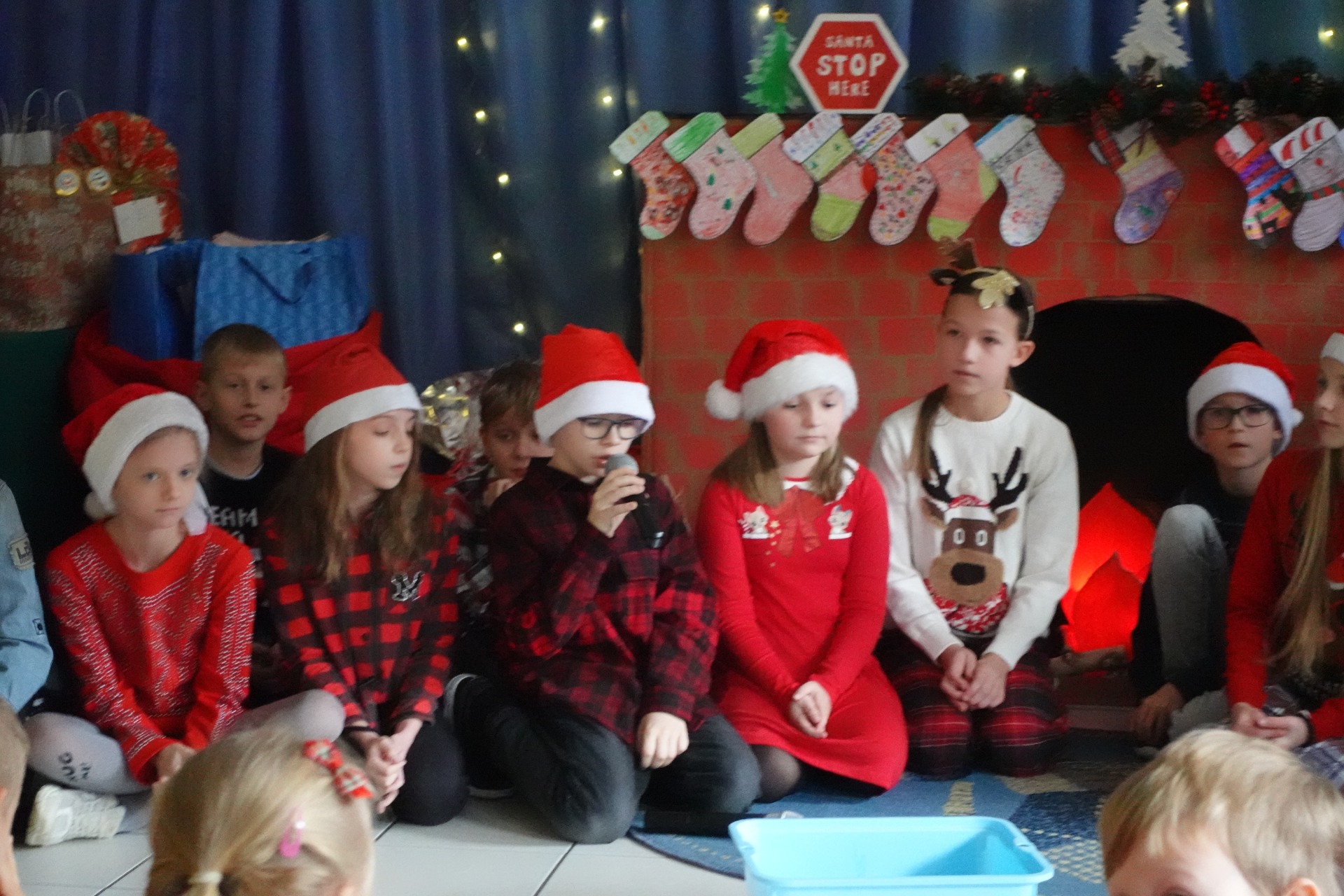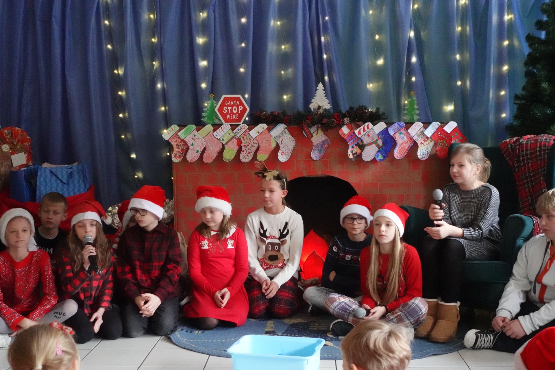 6 grudnia naszą szkołę odwiedził długo wyczekiwany gość - Święty Mikołaj! Wizyta rozpoczęła się częścią artystyczną przygotowaną przez uczniów klasy 4.Sala zmieniła się w magiczny, świąteczny pokój z klimatycznym kominkiem, tworzącym niezapomnianą atmosferę.