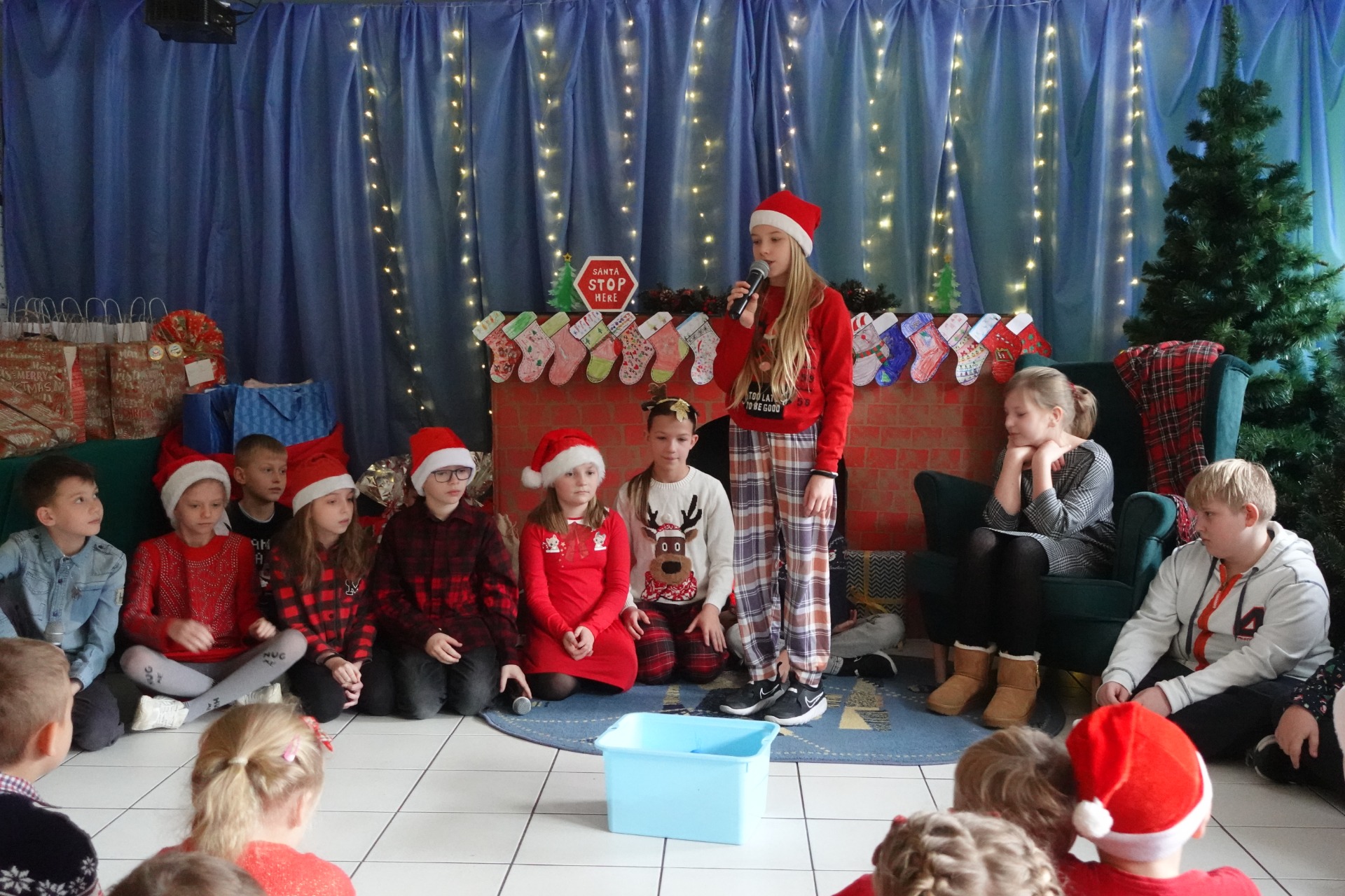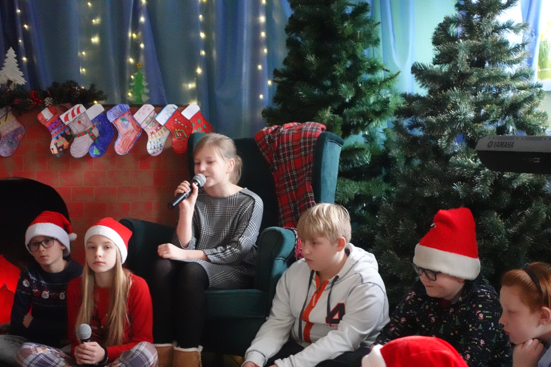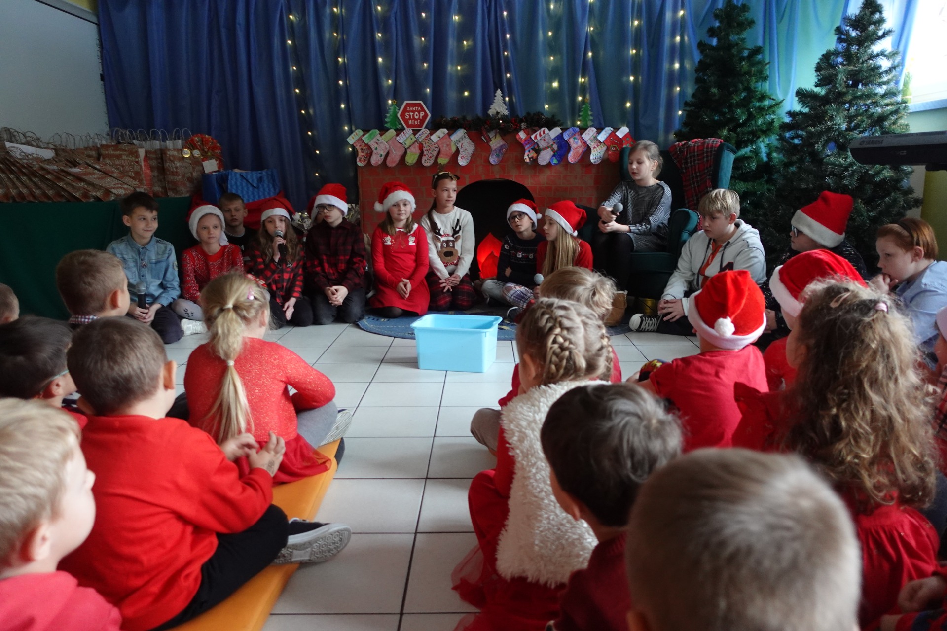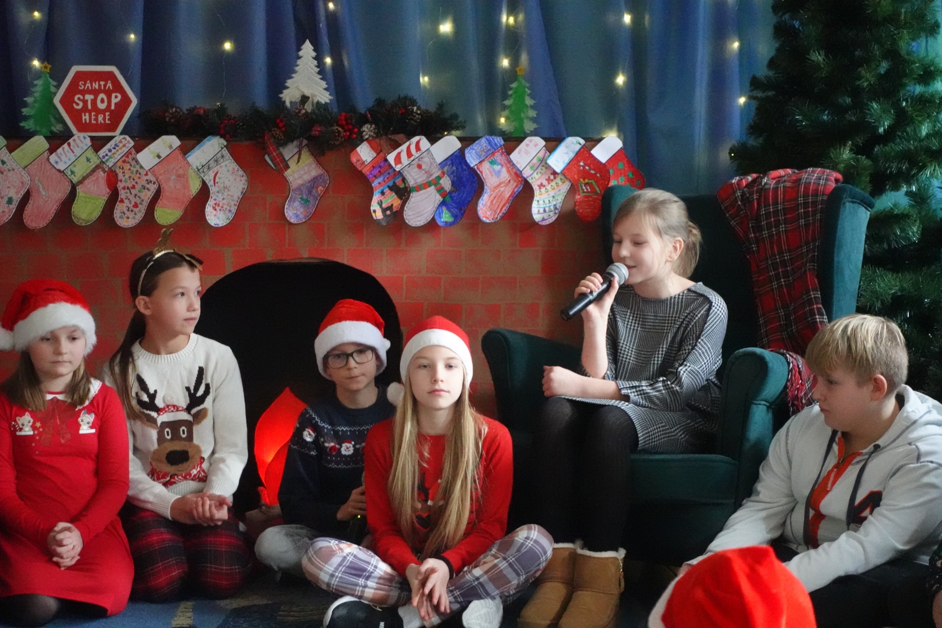 6 grudnia naszą szkołę odwiedził długo wyczekiwany gość - Święty Mikołaj! Wizyta rozpoczęła się częścią artystyczną przygotowaną przez uczniów klasy 4.Sala zmieniła się w magiczny, świąteczny pokój z klimatycznym kominkiem, tworzącym niezapomnianą atmosferę.