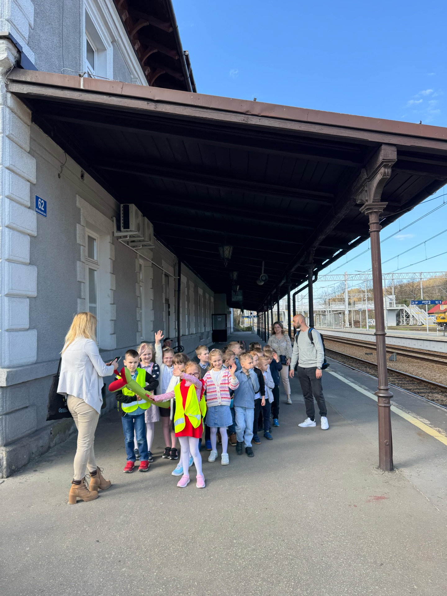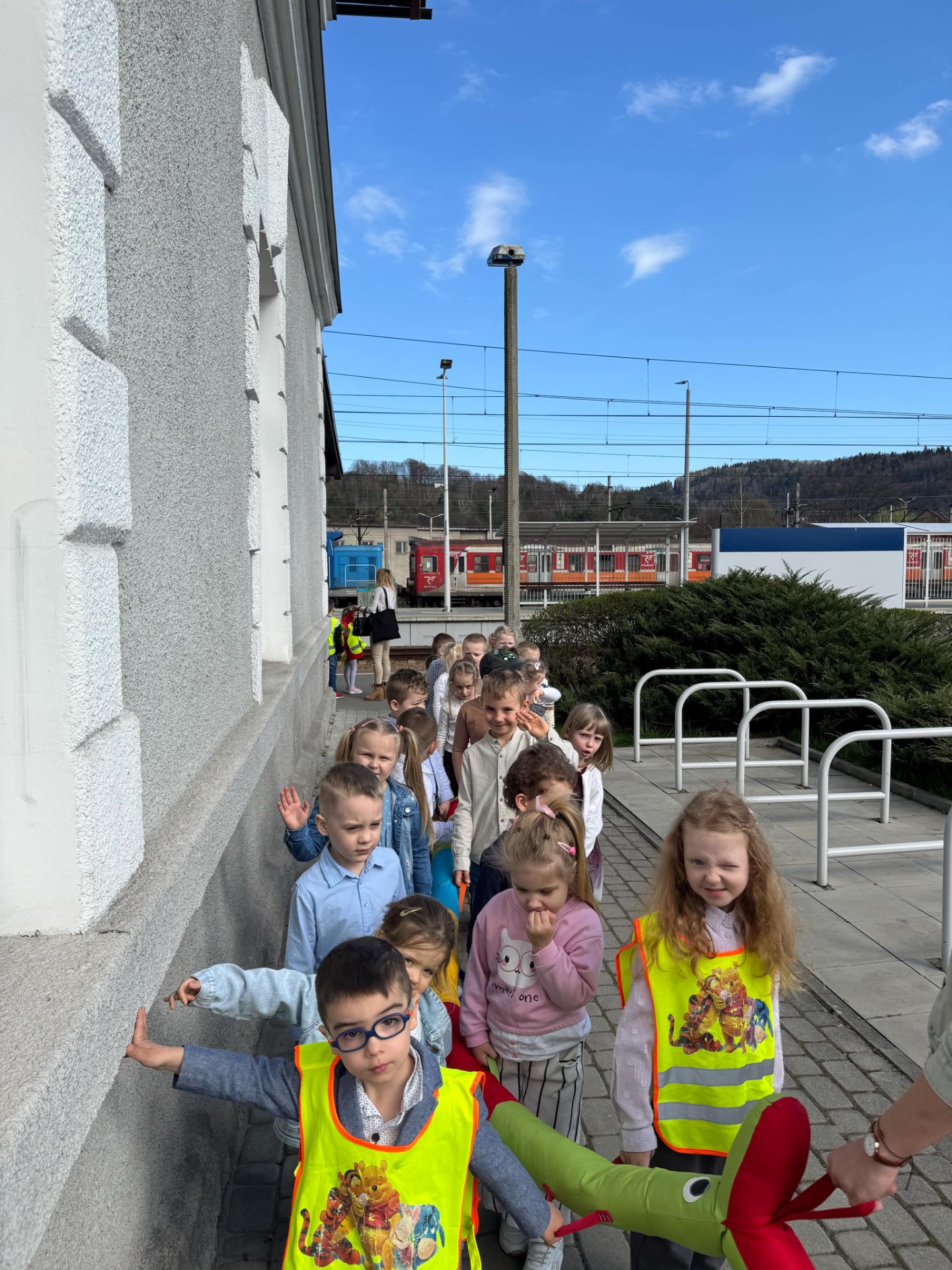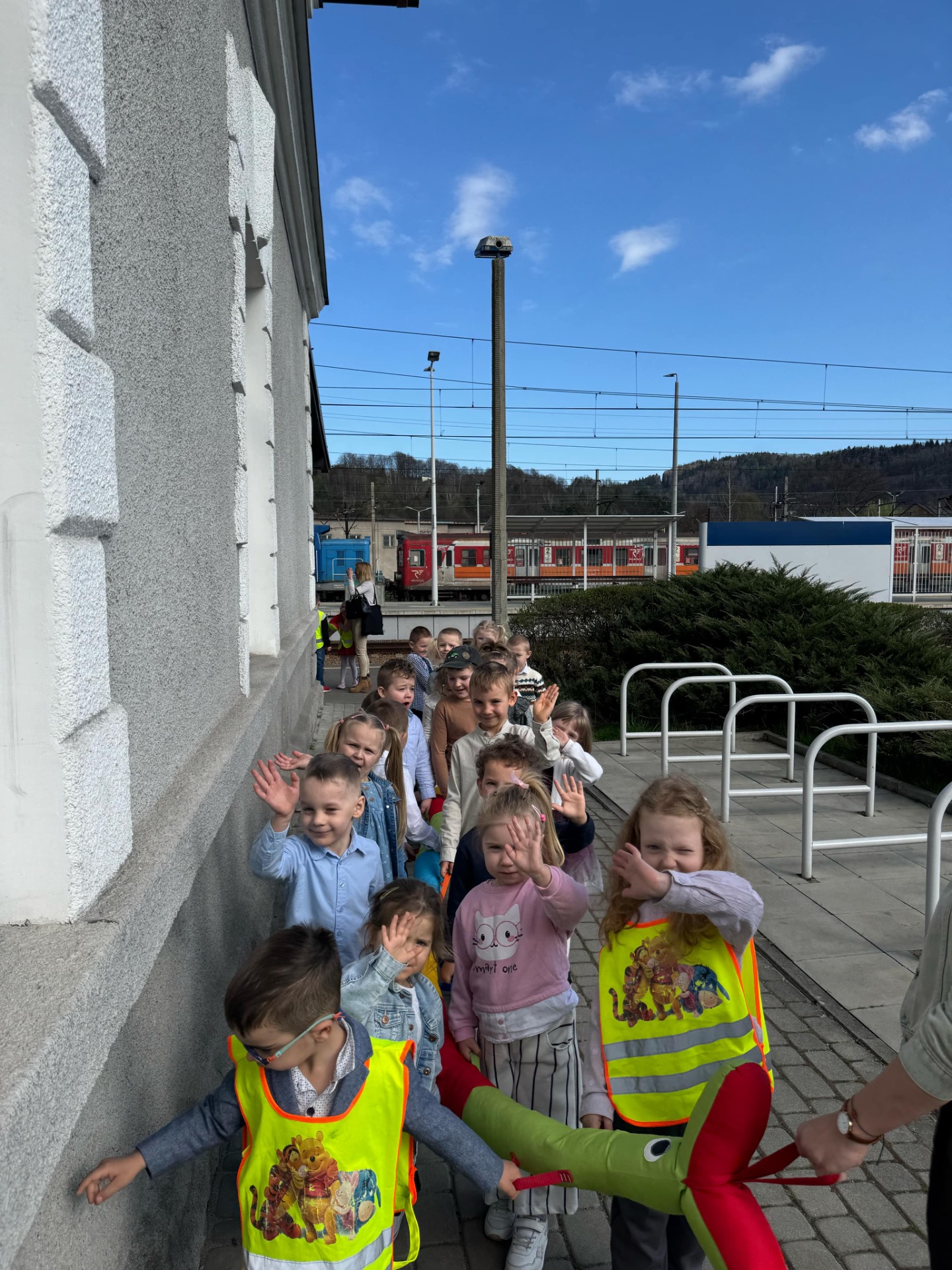 Pierwszym punktem programu była wizyta na stacji kolejowej w Suchej Beskidzkiej. Przedszkolaki z ogromnym zaciekawieniem przyglądały się pociągom, a także poznały podstawowe zasady bezpieczeństwa w pobliżu torów. Nie zabrakło też chwil na wspólne zdjęcia i podziwianie imponujących składów kolejowych.