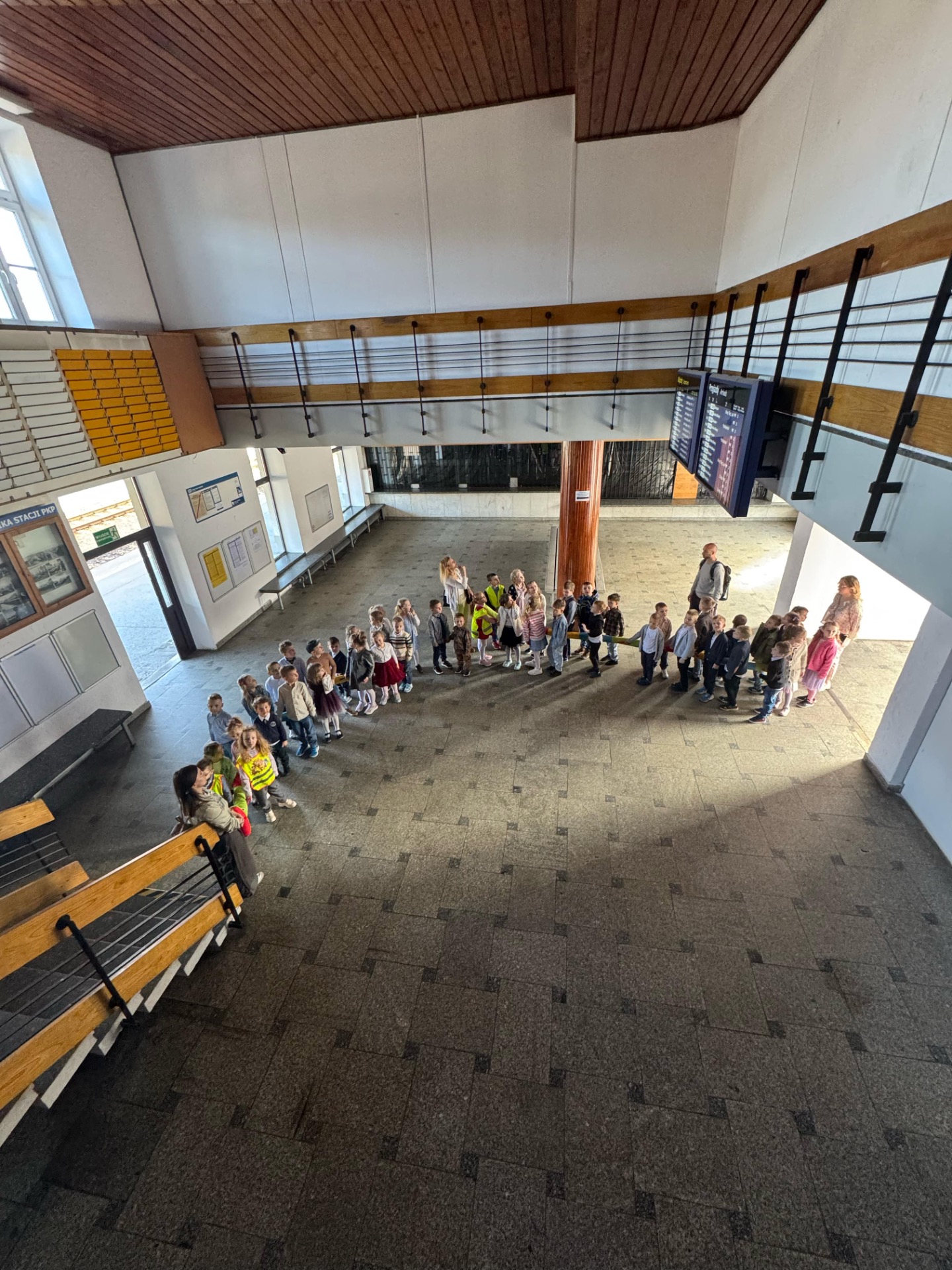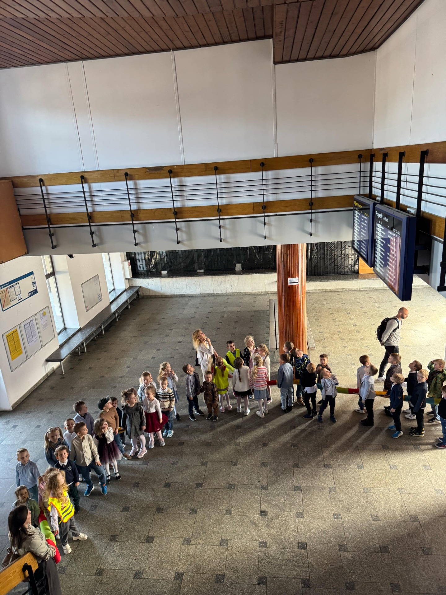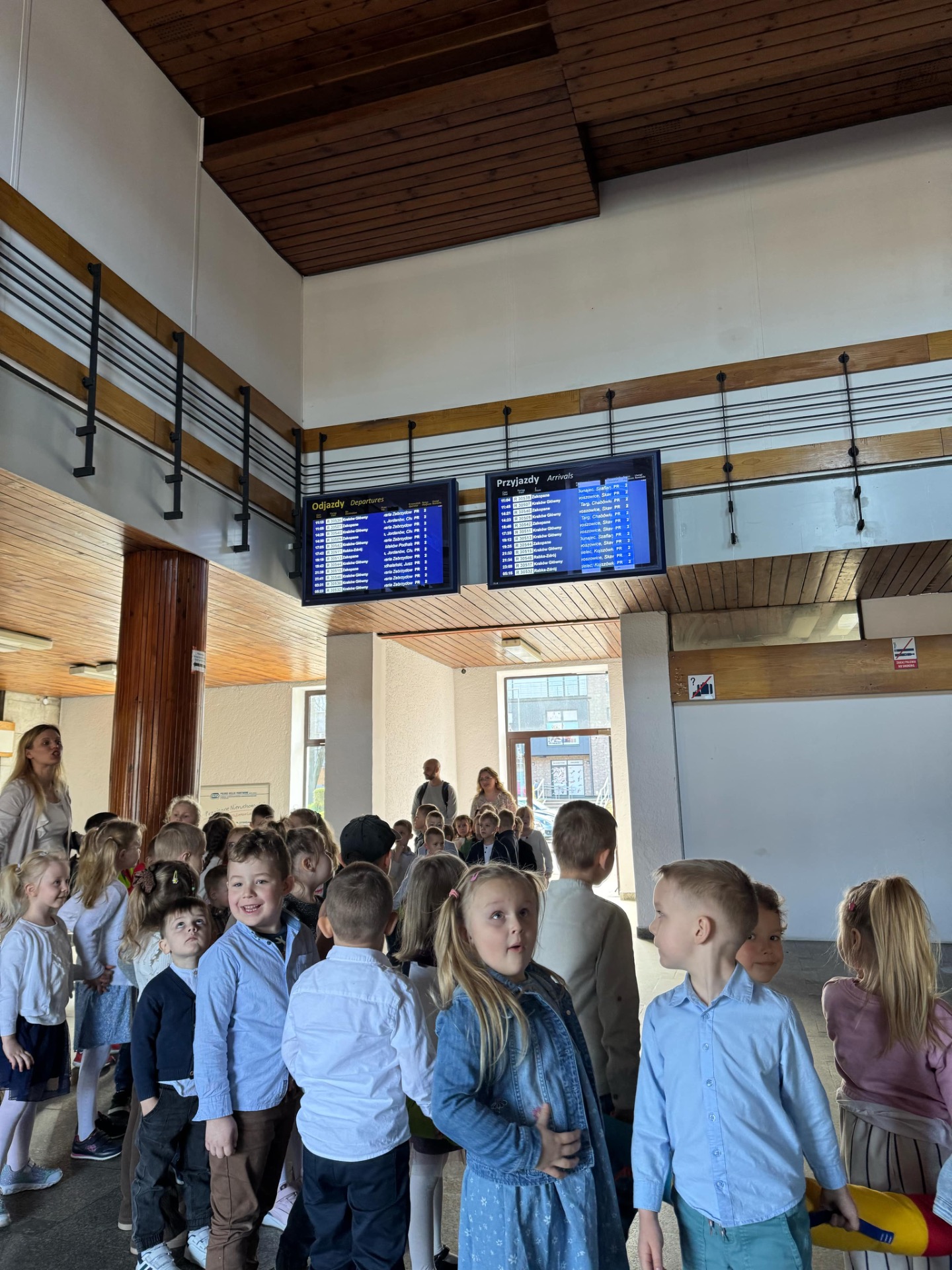 Pierwszym punktem programu była wizyta na stacji kolejowej w Suchej Beskidzkiej. Przedszkolaki z ogromnym zaciekawieniem przyglądały się pociągom, a także poznały podstawowe zasady bezpieczeństwa w pobliżu torów. Nie zabrakło też chwil na wspólne zdjęcia i podziwianie imponujących składów kolejowych.