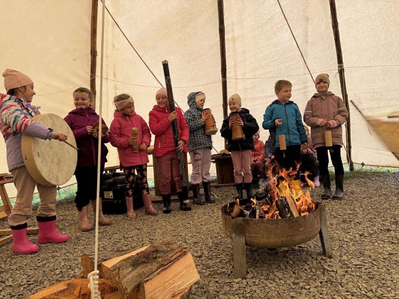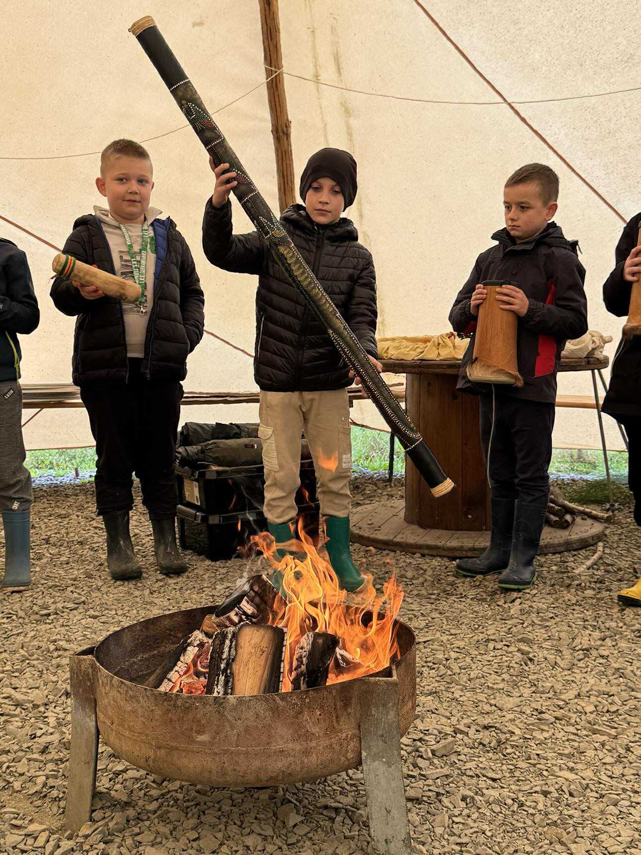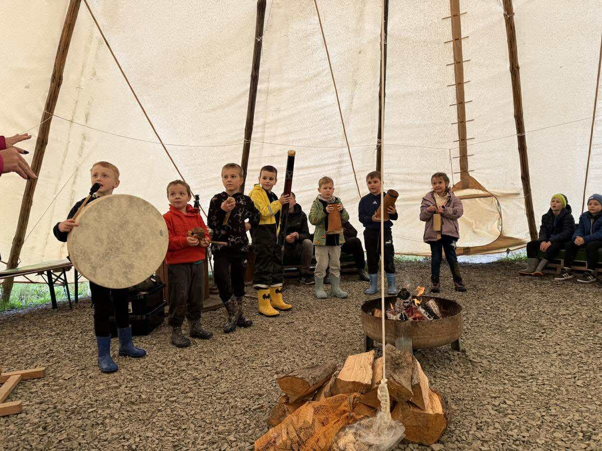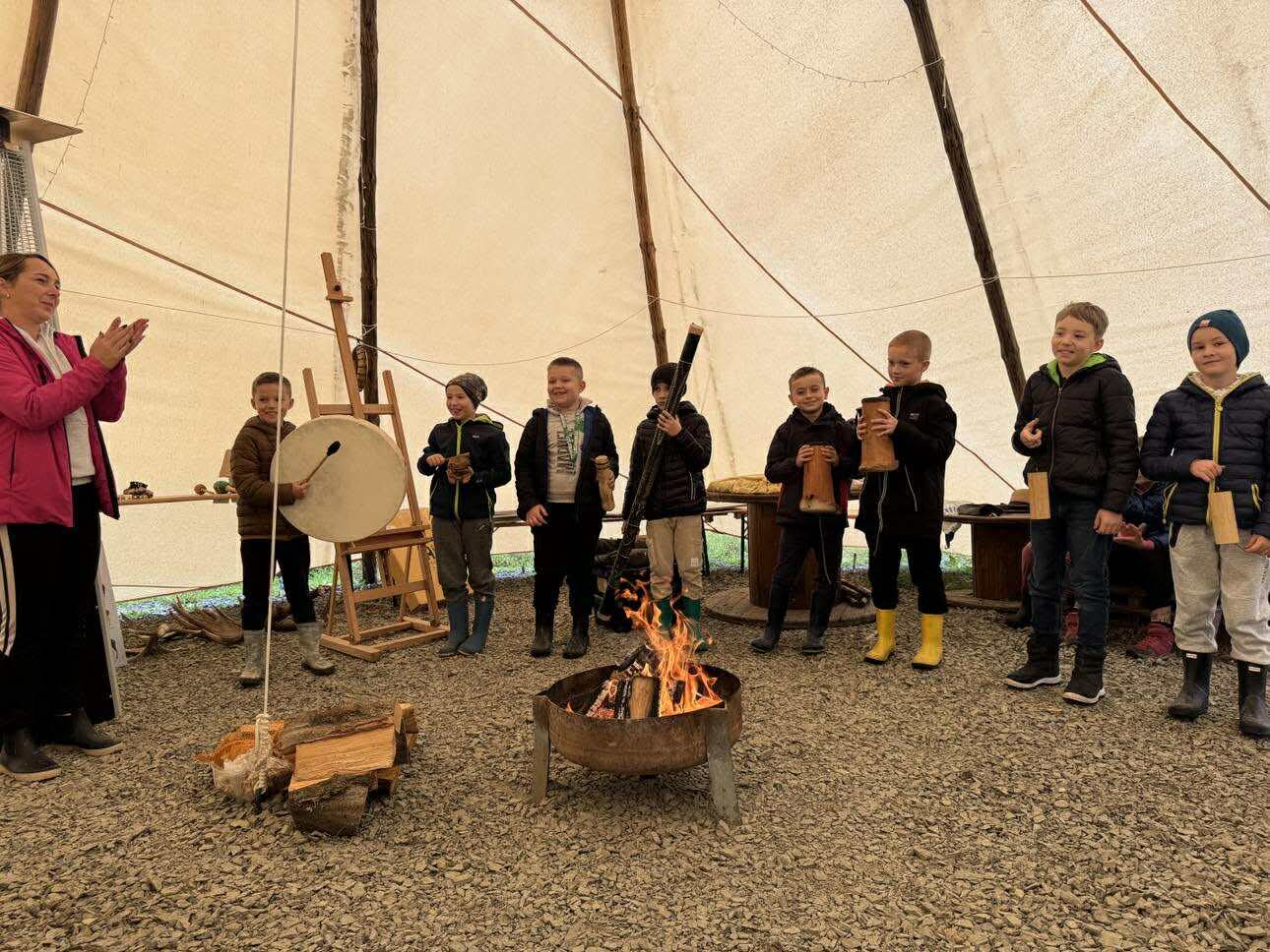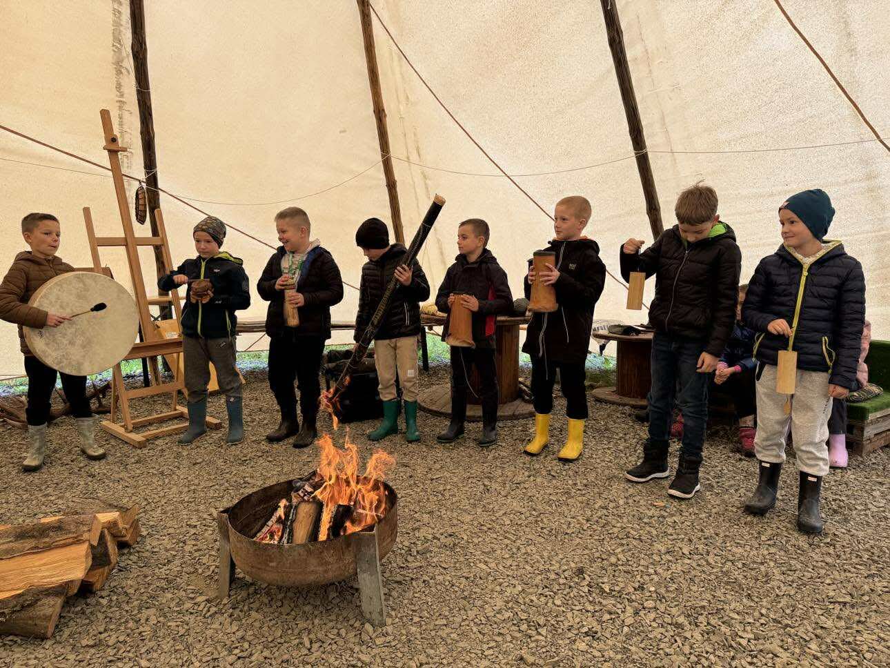 W indiańskich wigwamach uczniowie poznawali prawdziwe indiańskie instrumenty i każdy mógł spróbować na nich zagrać. Na zakończenie czekała pyszna niespodzianka – pieczone kiełbaski, które smakowały wyjątkowo po dniu pełnym wrażeń.