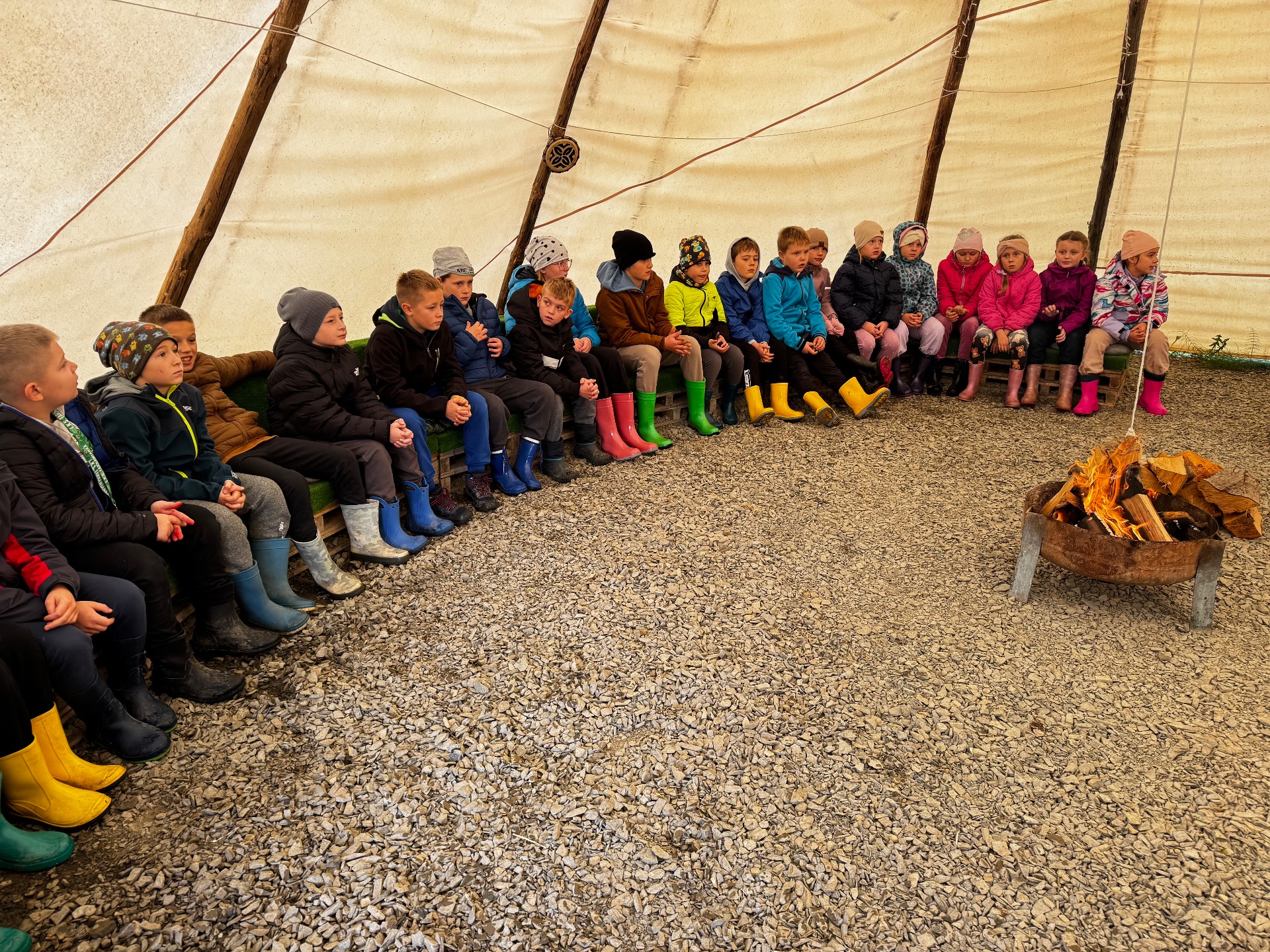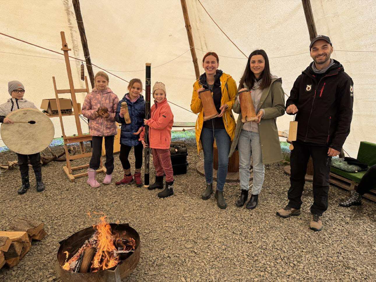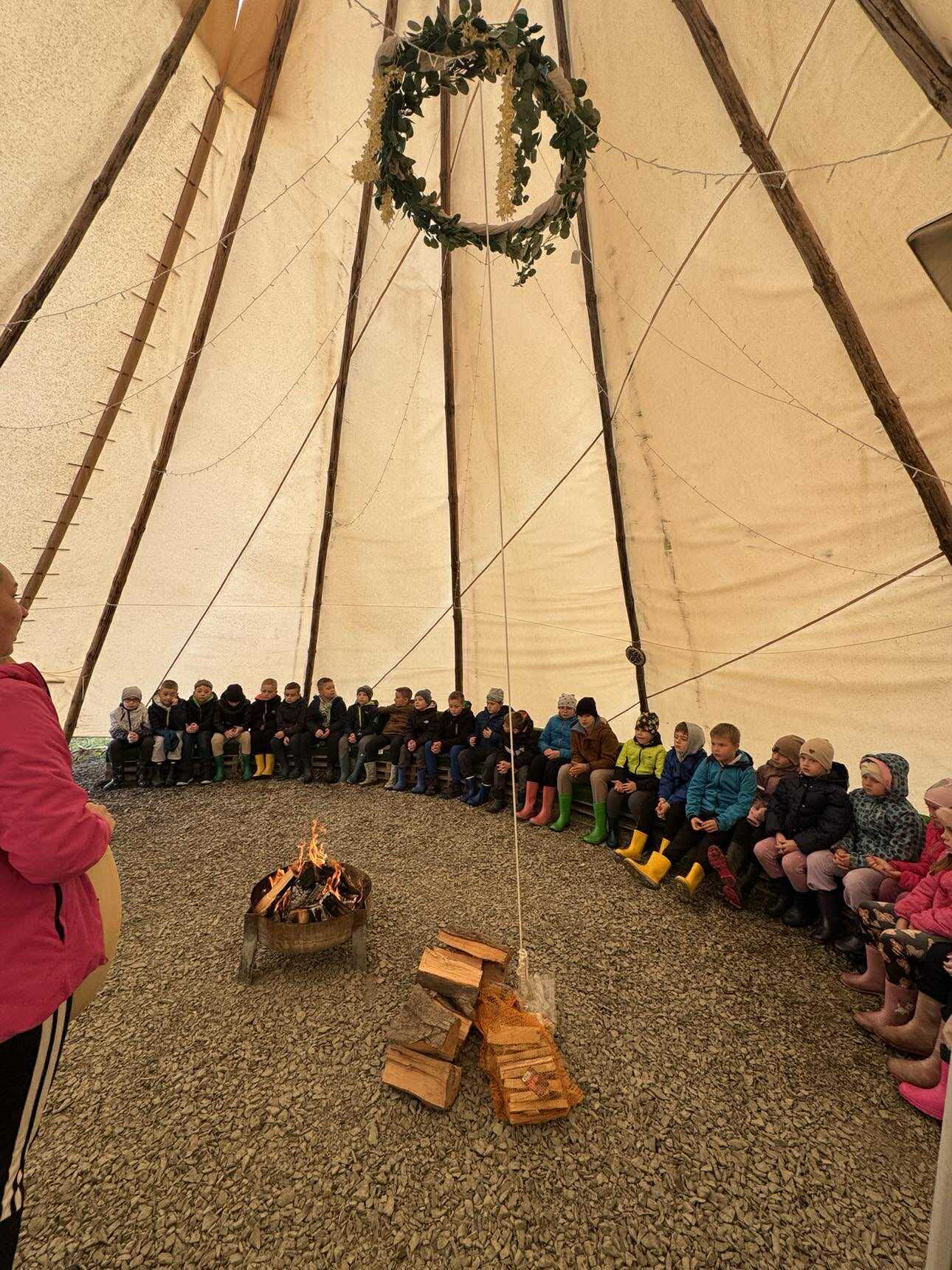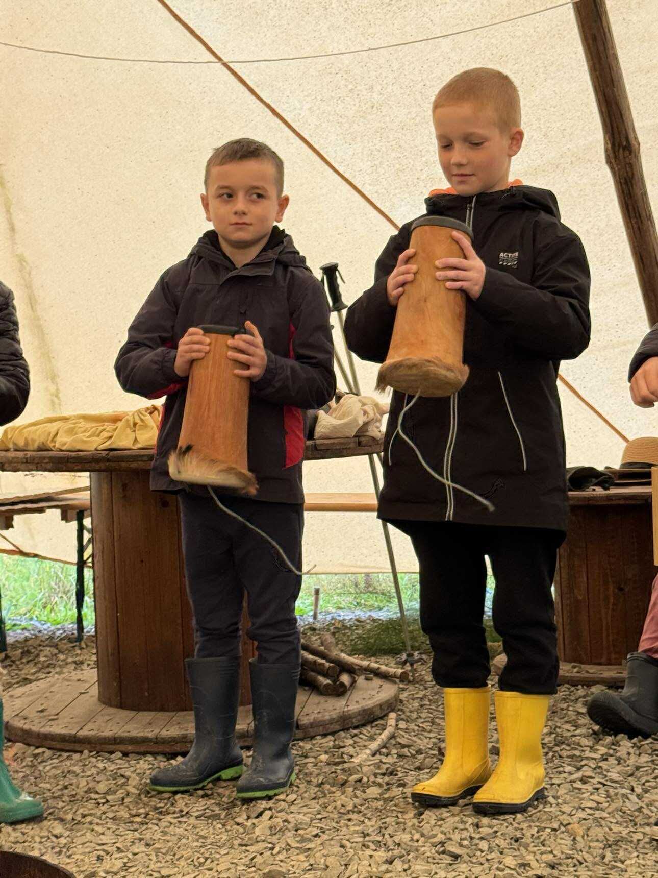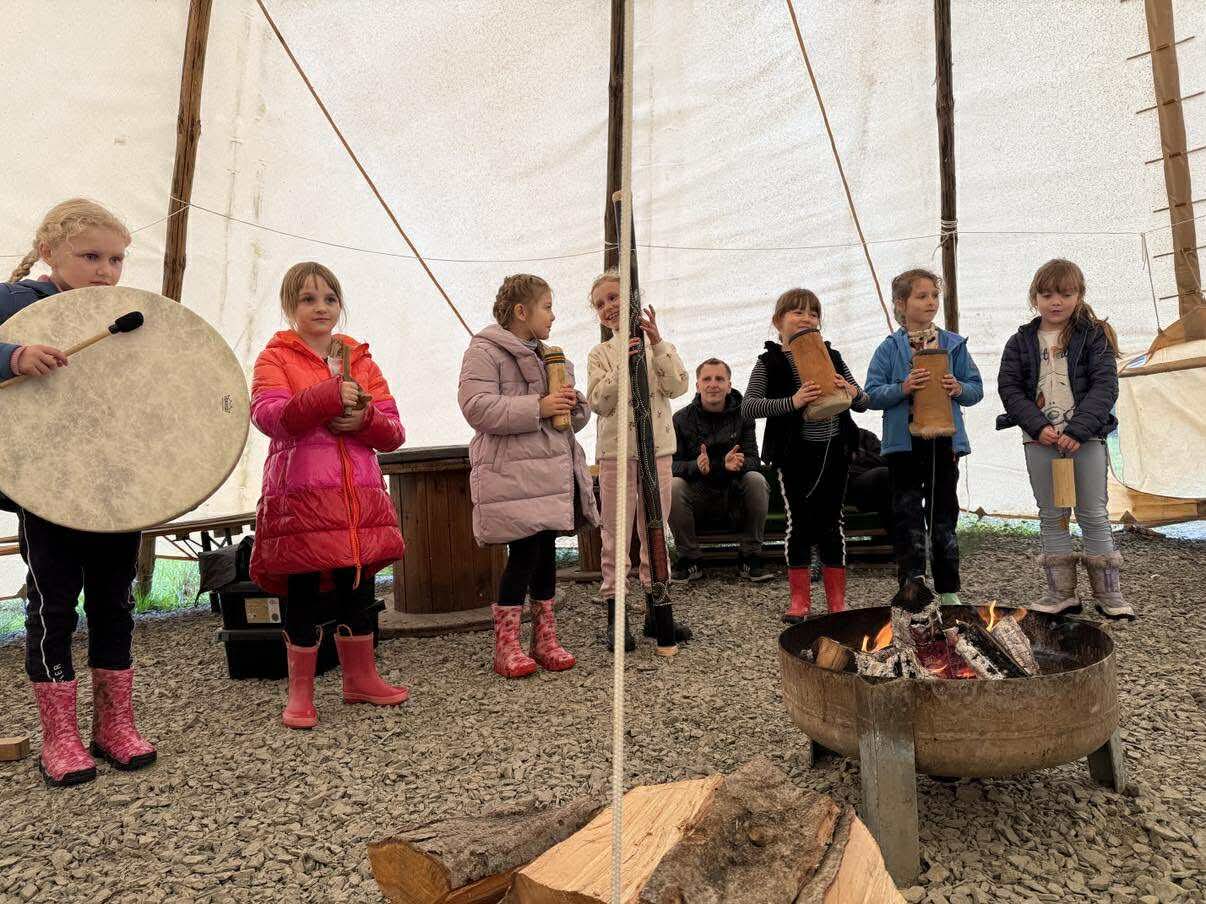 W indiańskich wigwamach uczniowie poznawali prawdziwe indiańskie instrumenty i każdy mógł spróbować na nich zagrać. Na zakończenie czekała pyszna niespodzianka – pieczone kiełbaski, które smakowały wyjątkowo po dniu pełnym wrażeń.
