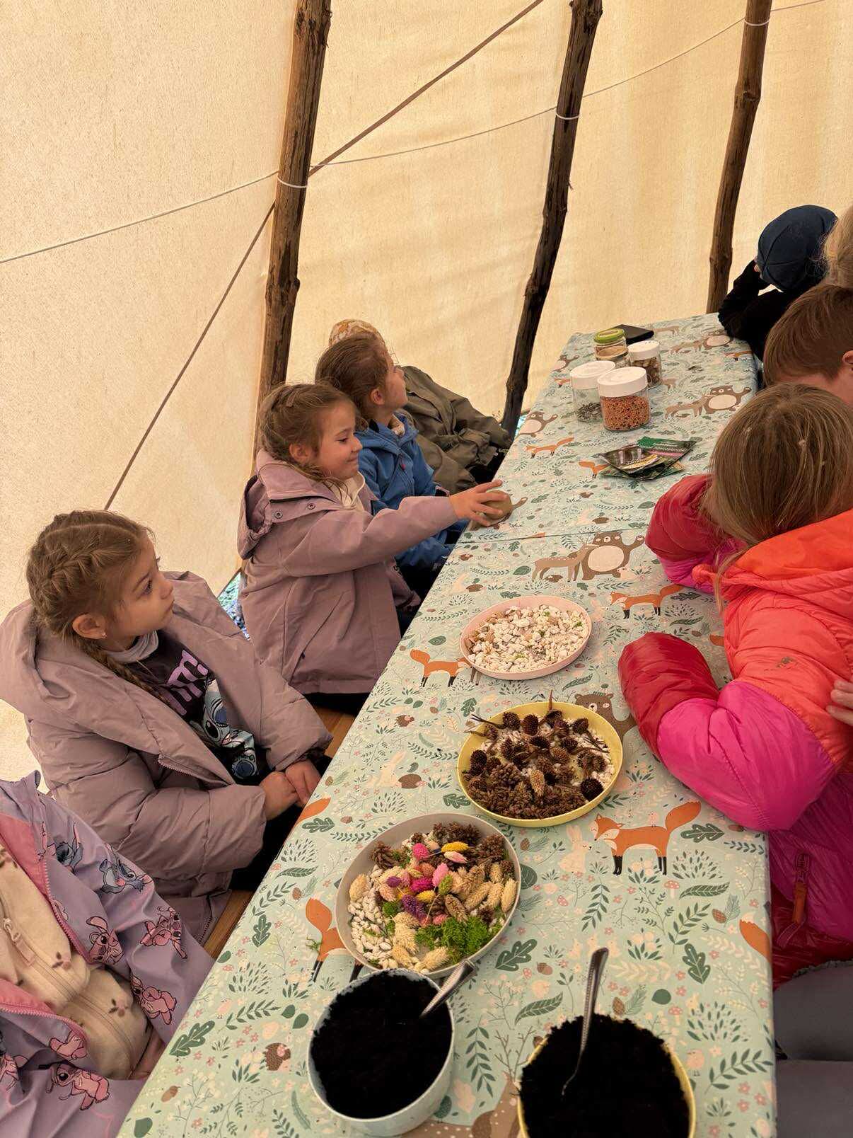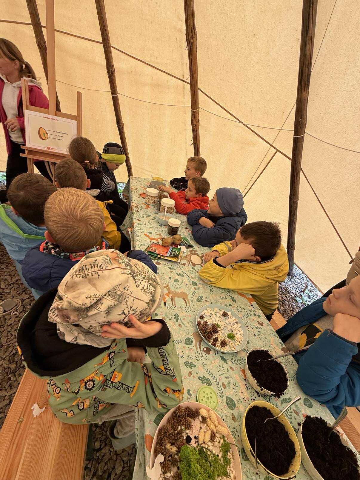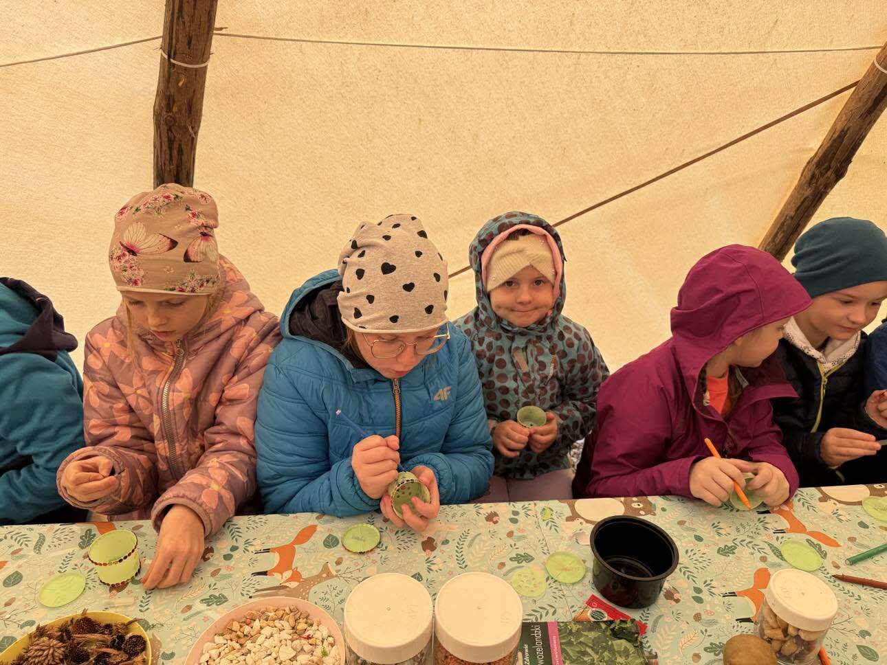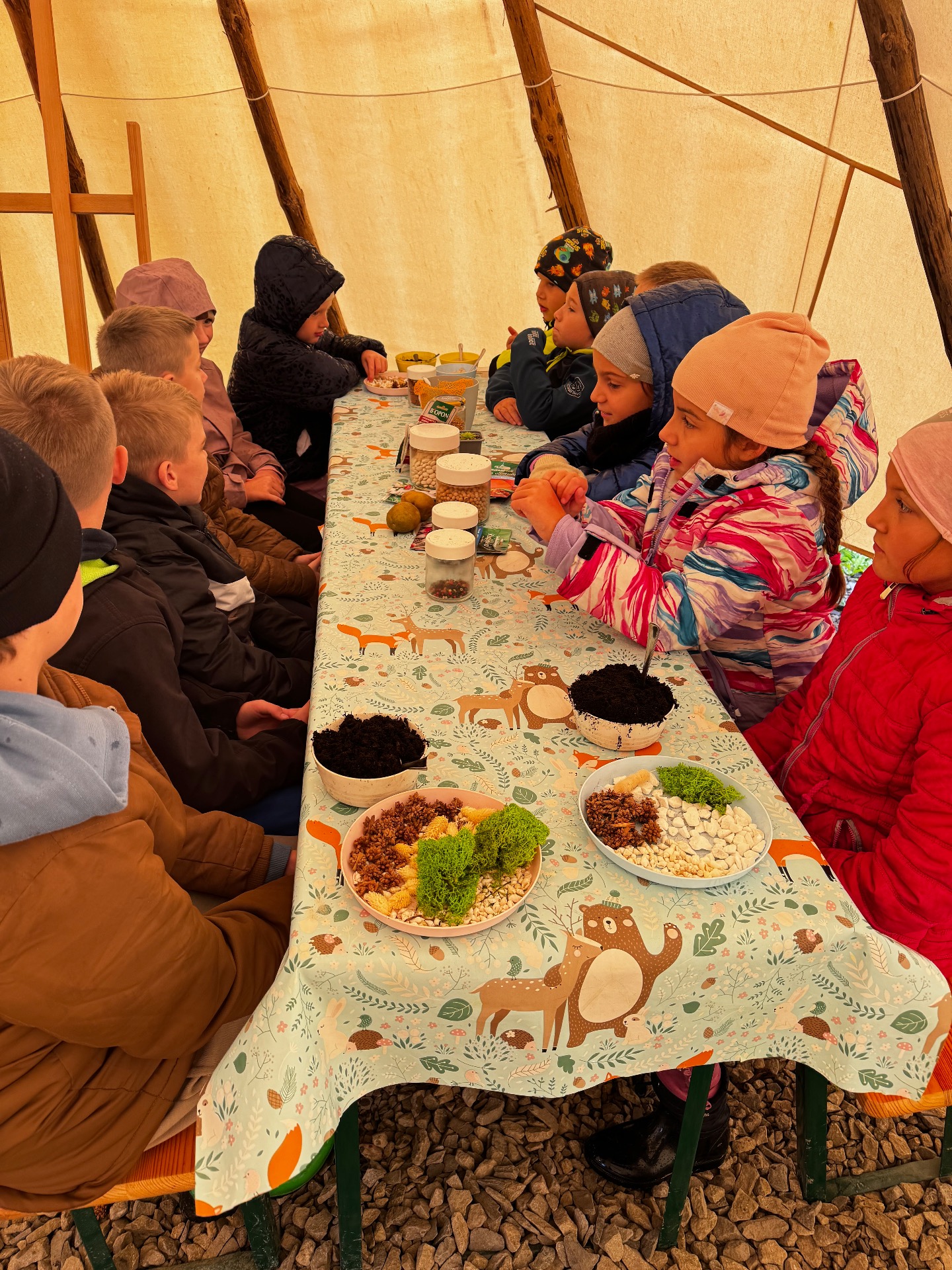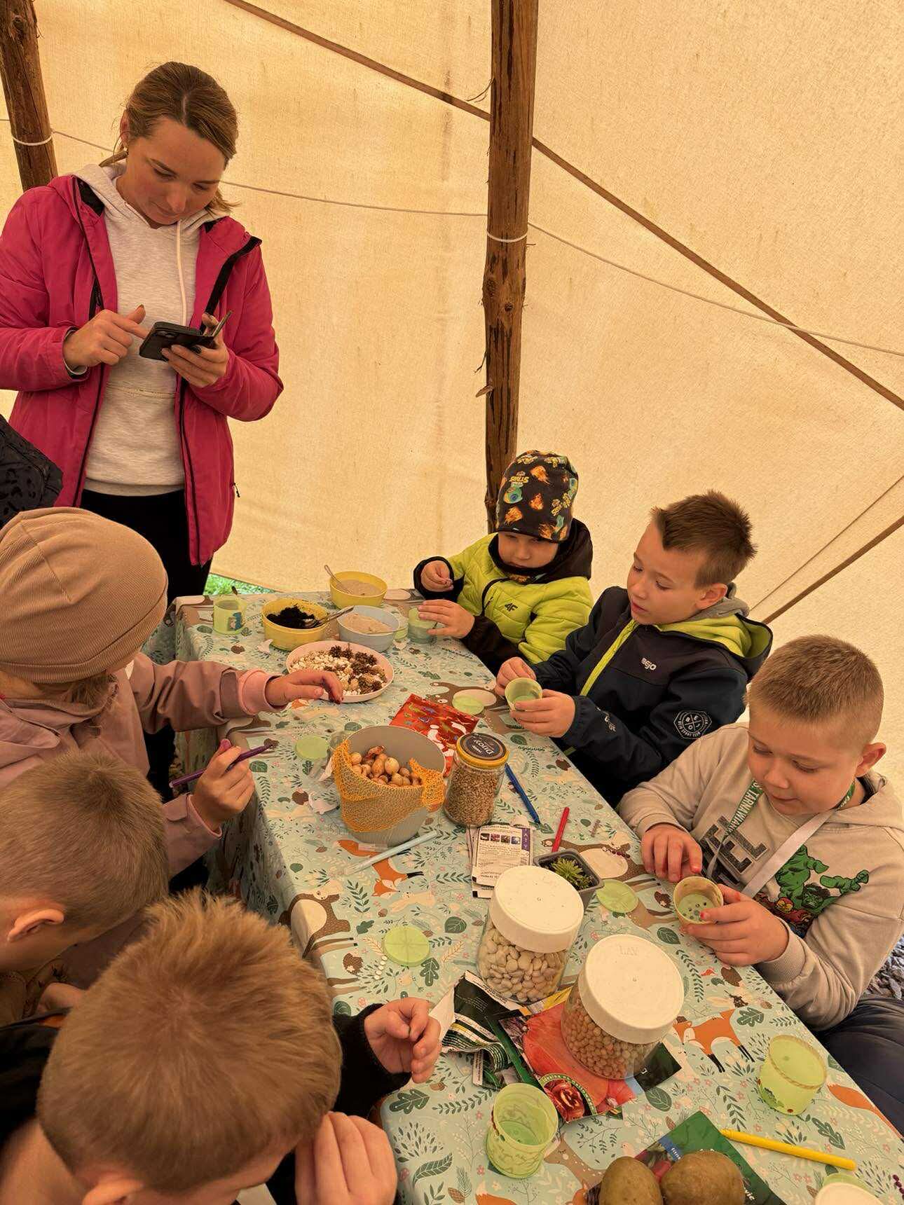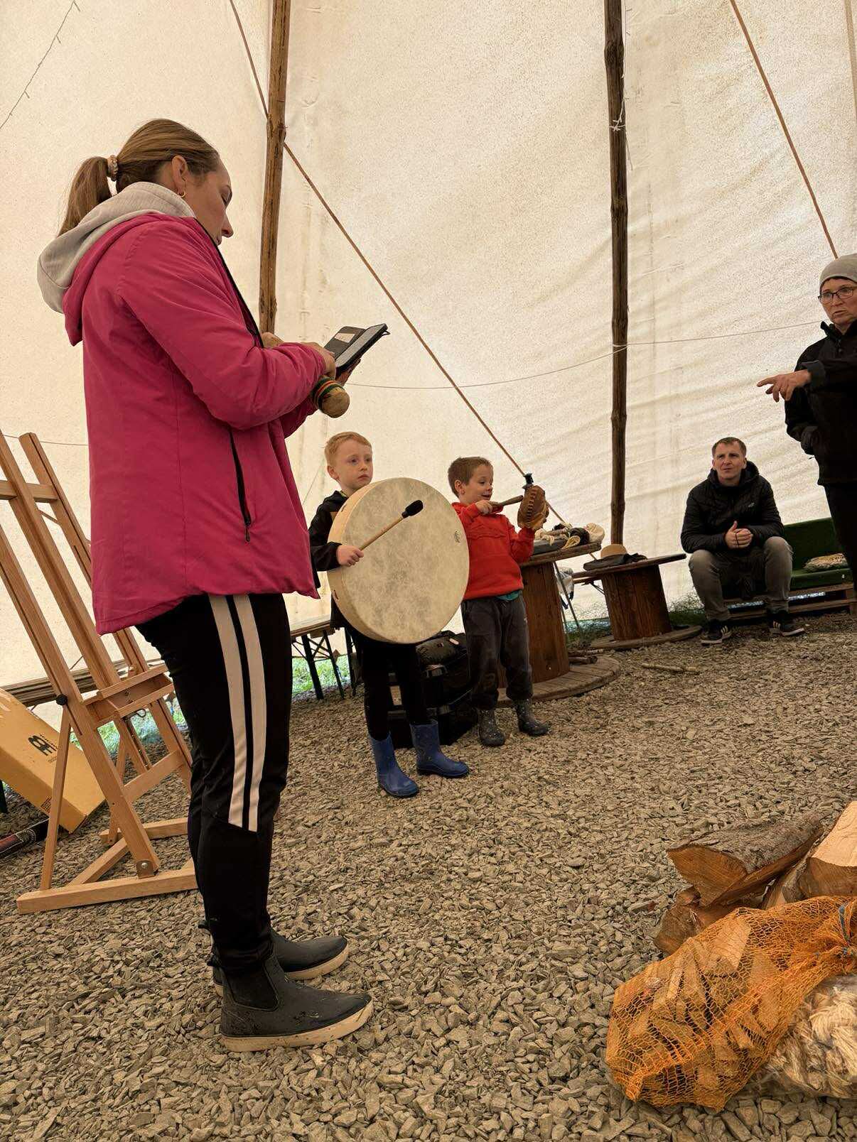W indiańskich wigwamach uczniowie poznawali prawdziwe indiańskie instrumenty i każdy mógł spróbować na nich zagrać. Na zakończenie czekała pyszna niespodzianka – pieczone kiełbaski, które smakowały wyjątkowo po dniu pełnym wrażeń.