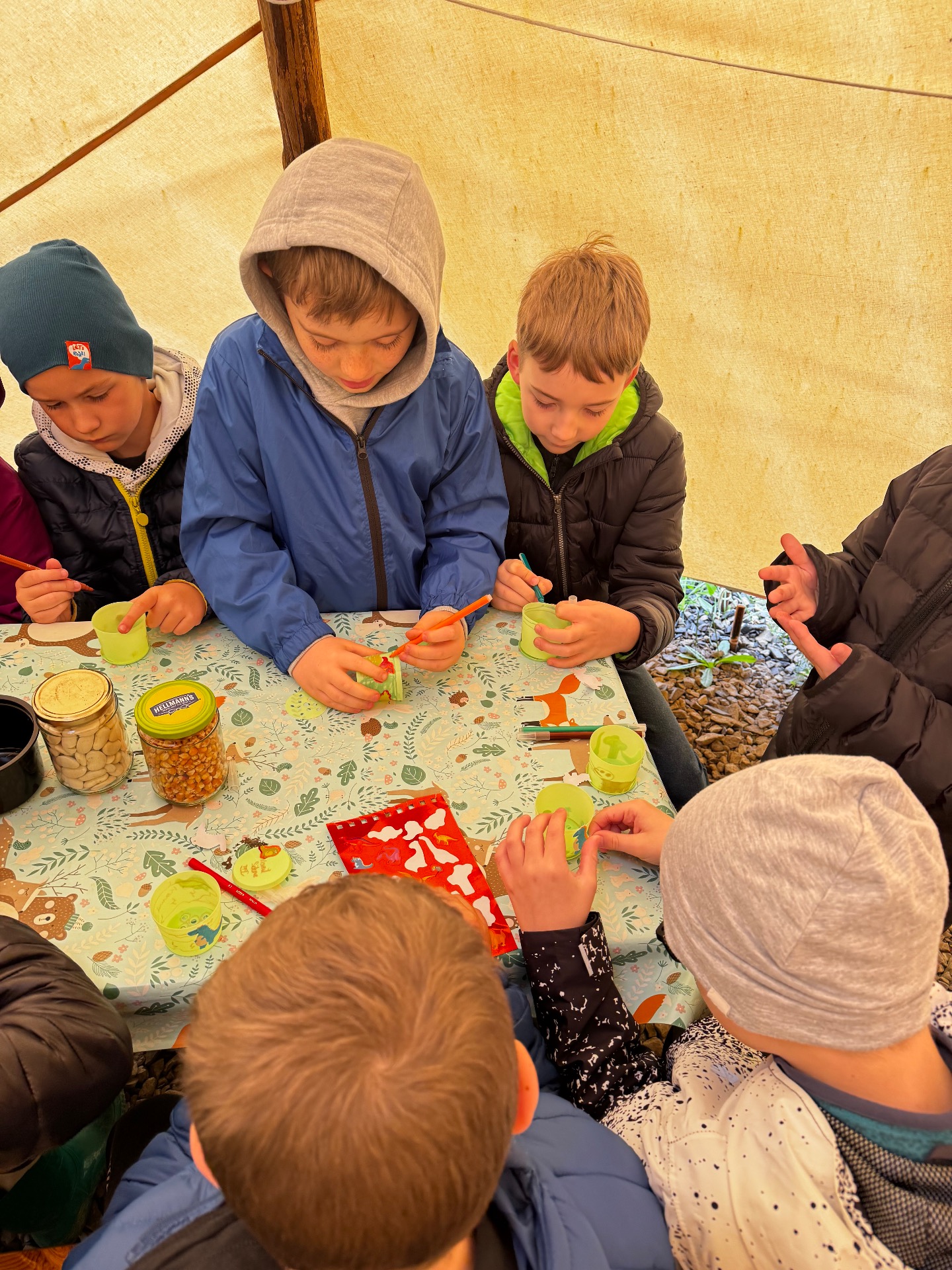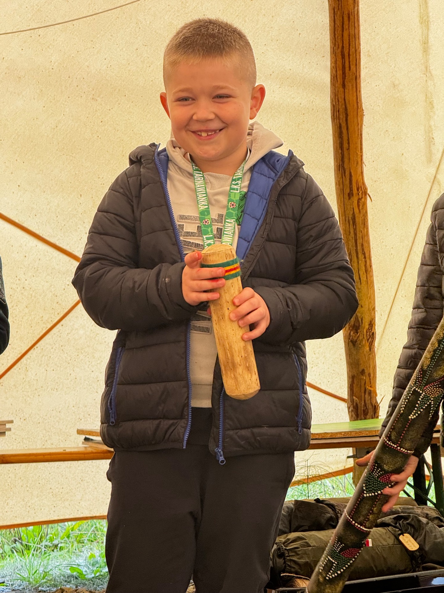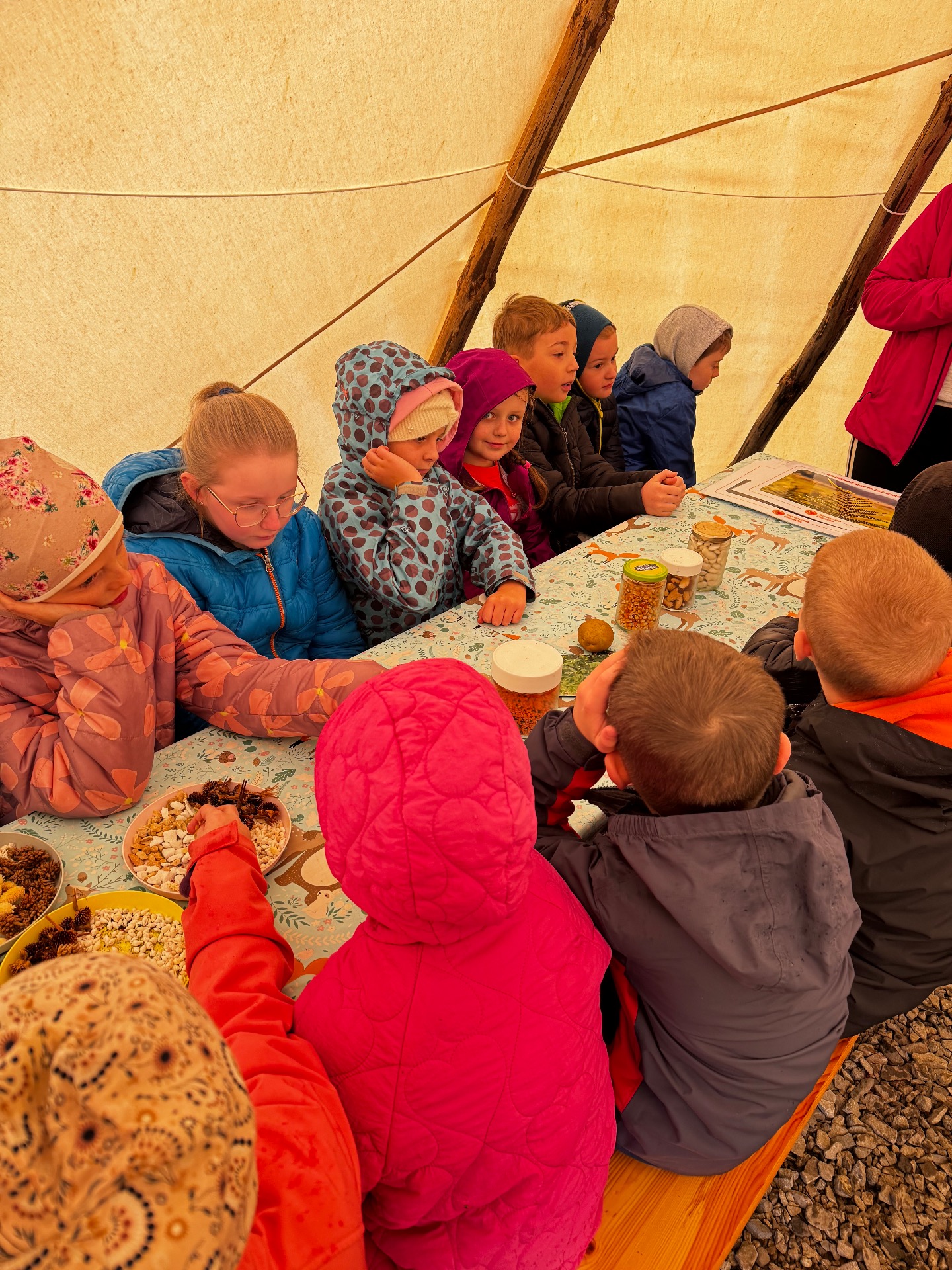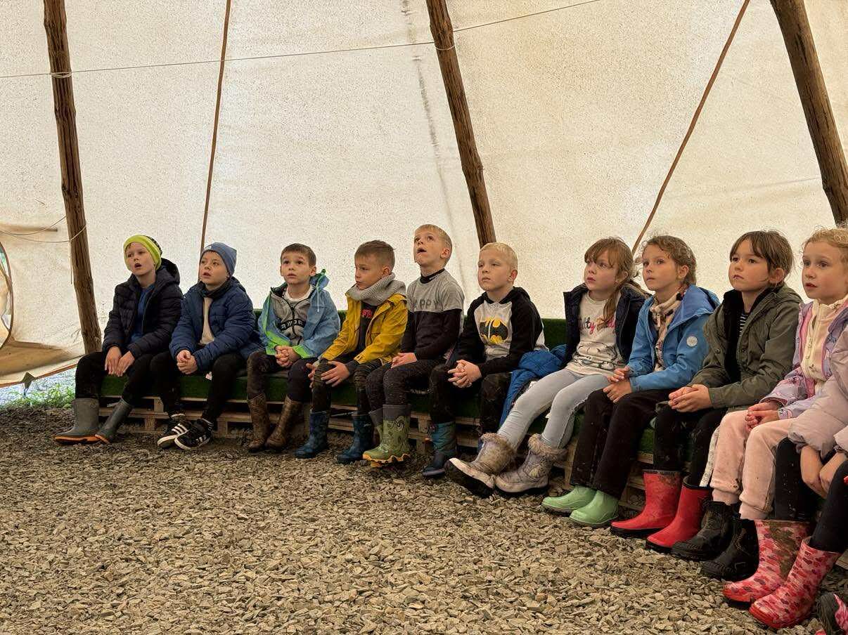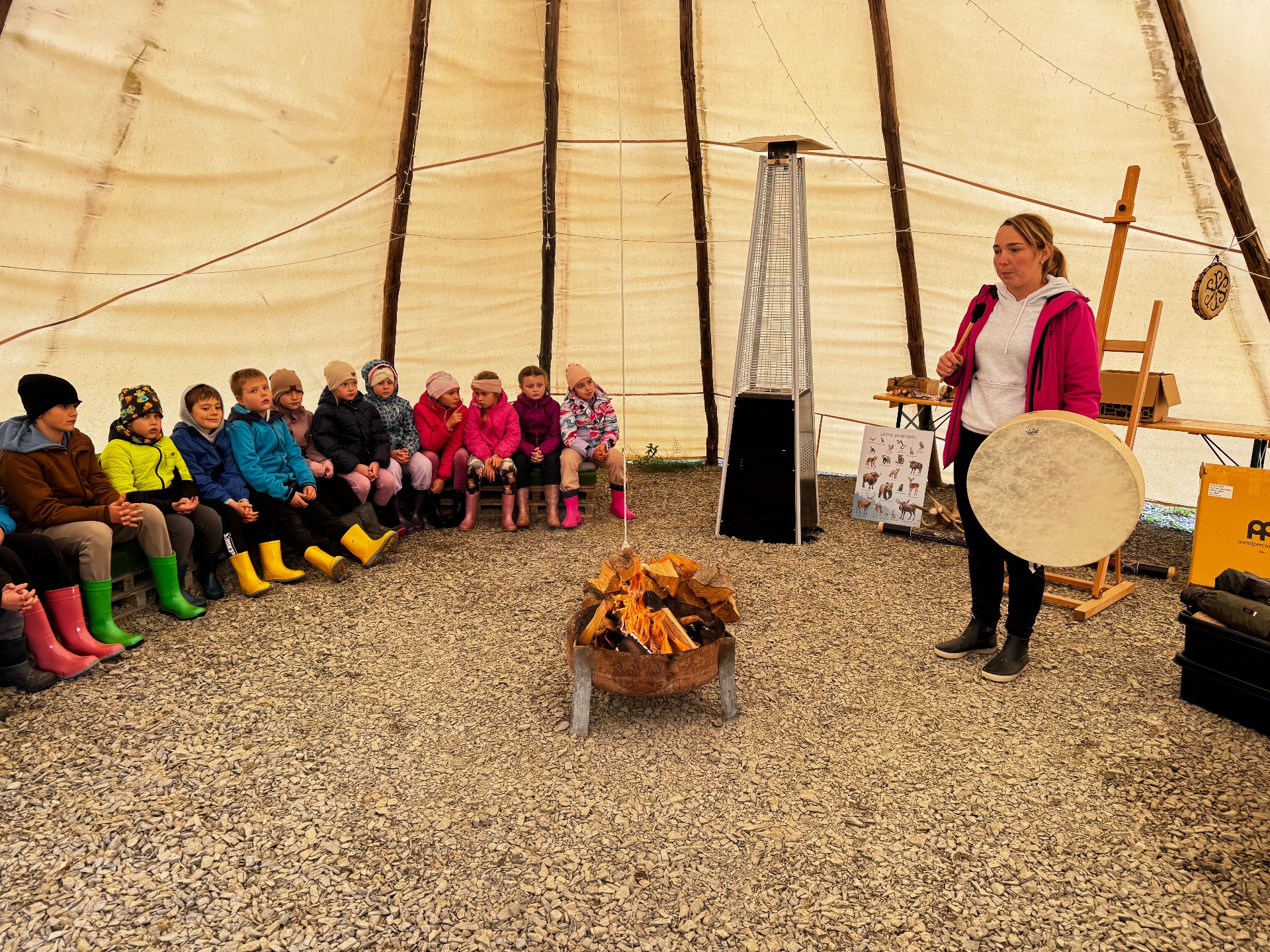 W indiańskich wigwamach uczniowie poznawali prawdziwe indiańskie instrumenty i każdy mógł spróbować na nich zagrać. Na zakończenie czekała pyszna niespodzianka – pieczone kiełbaski, które smakowały wyjątkowo po dniu pełnym wrażeń.