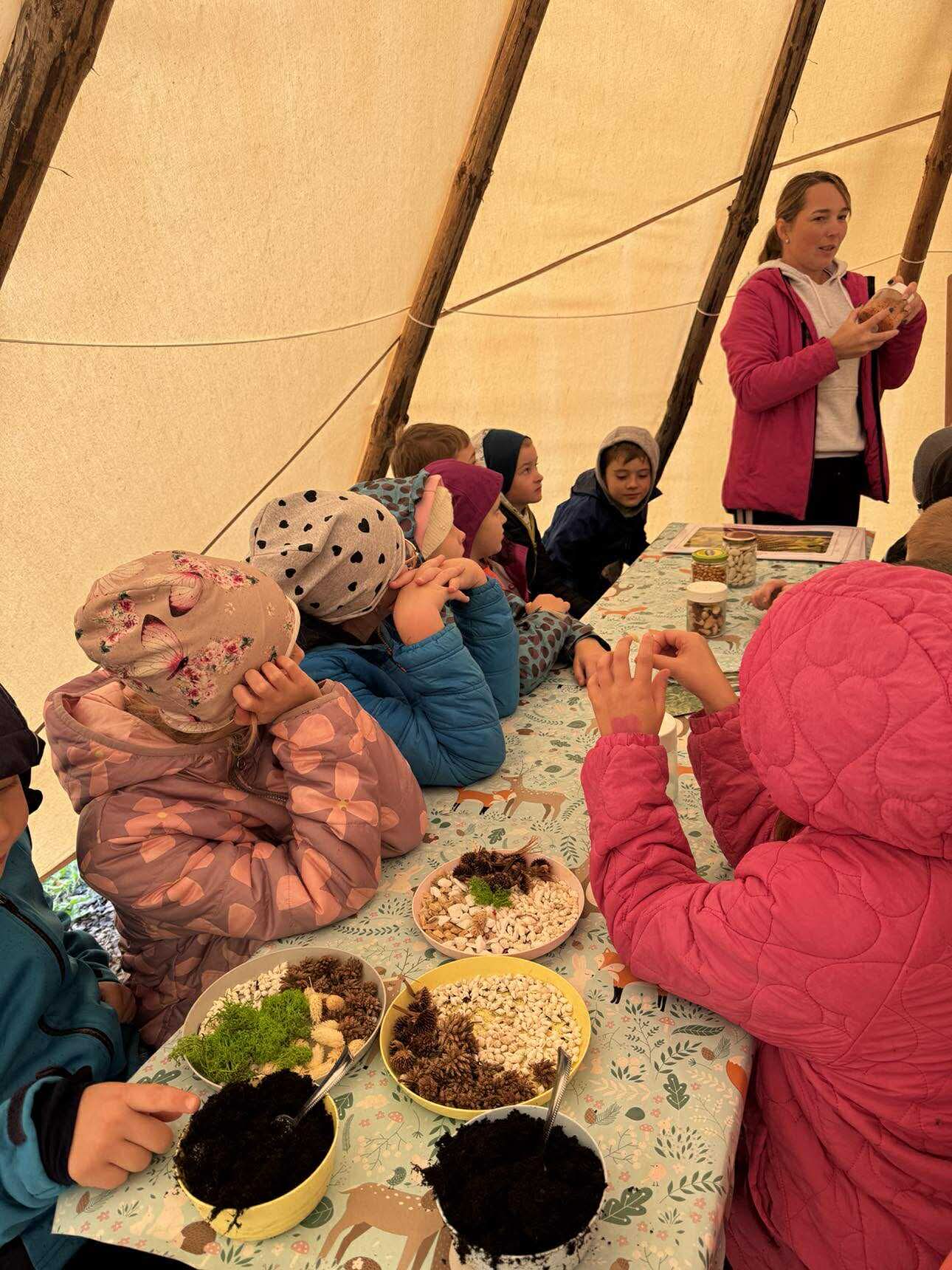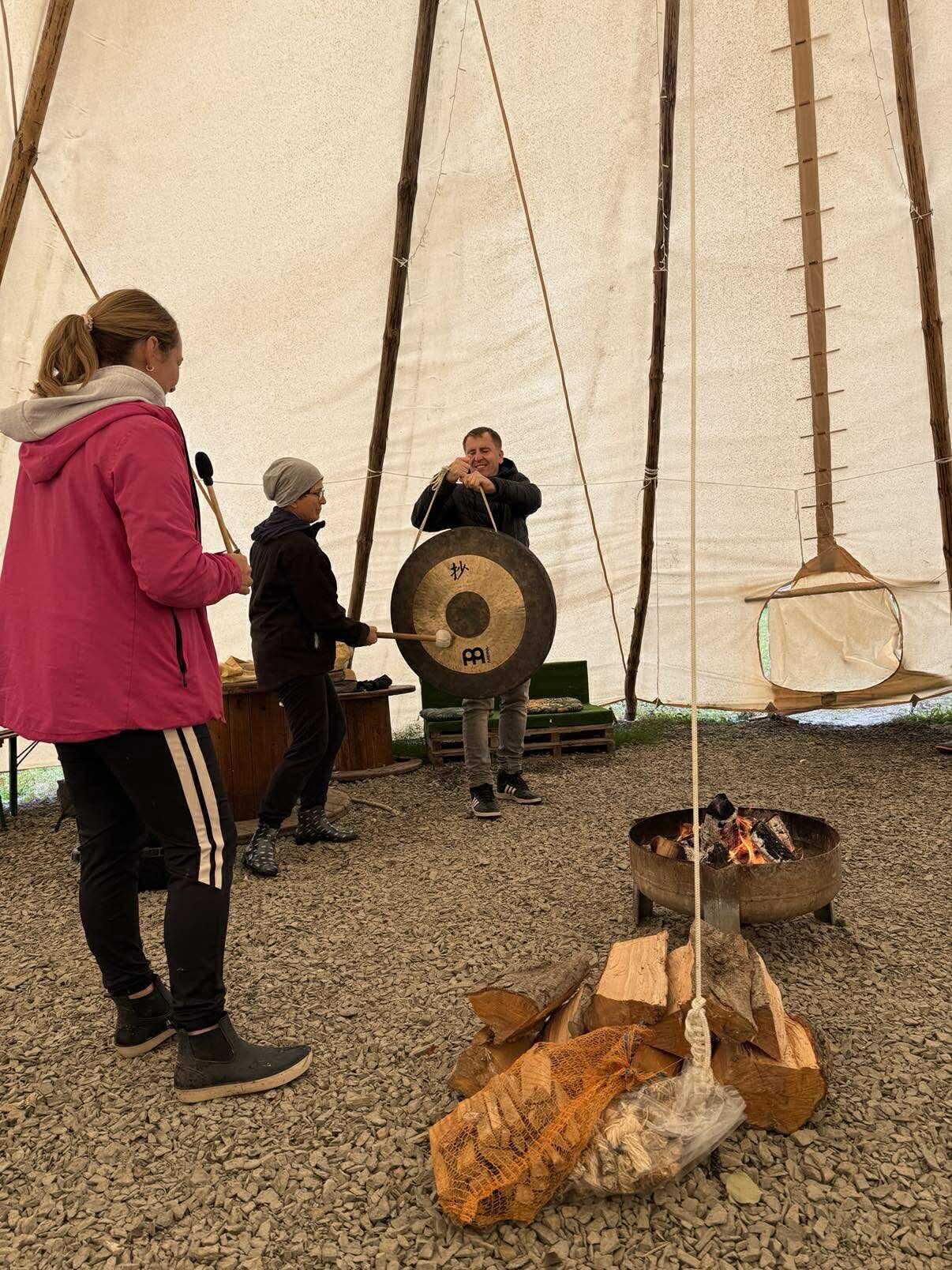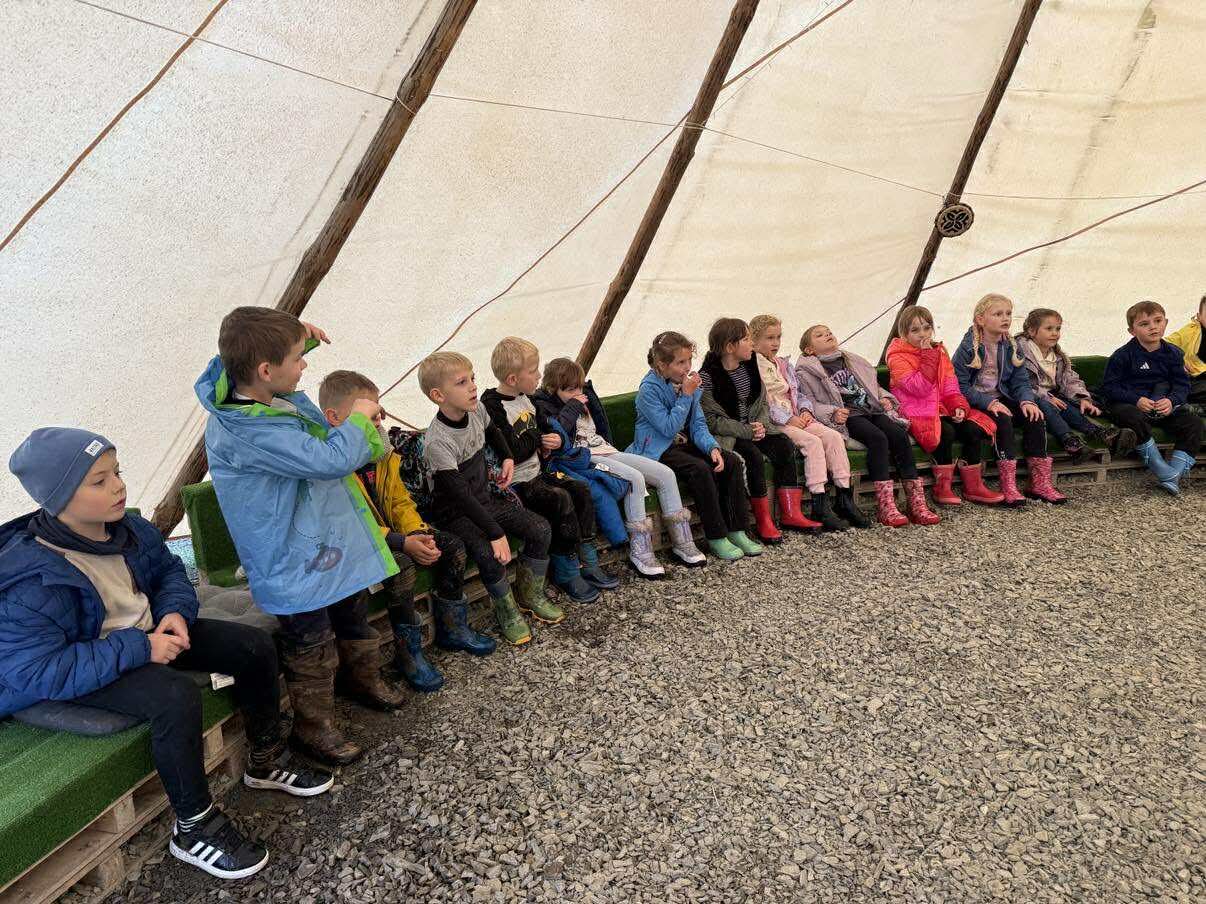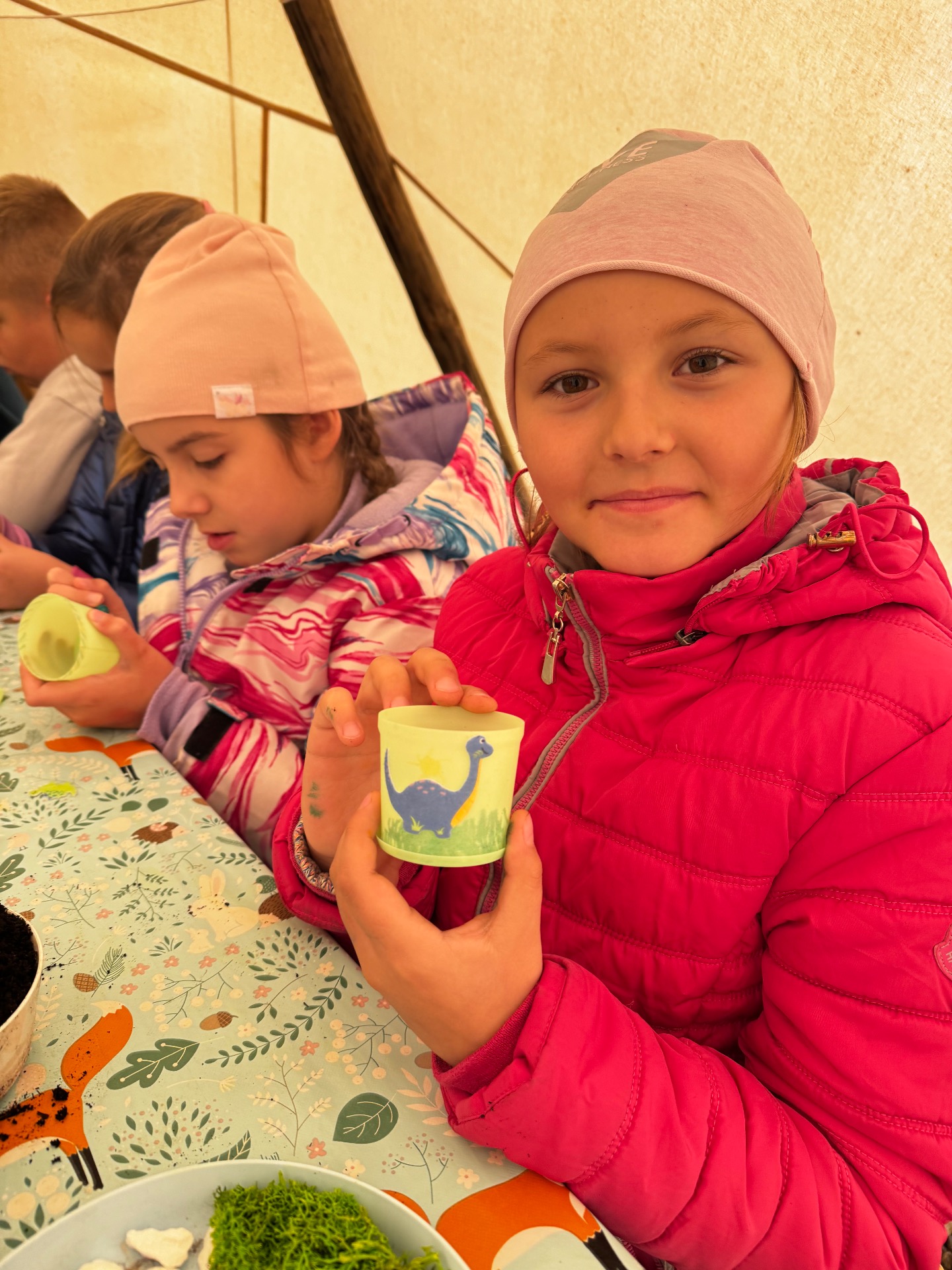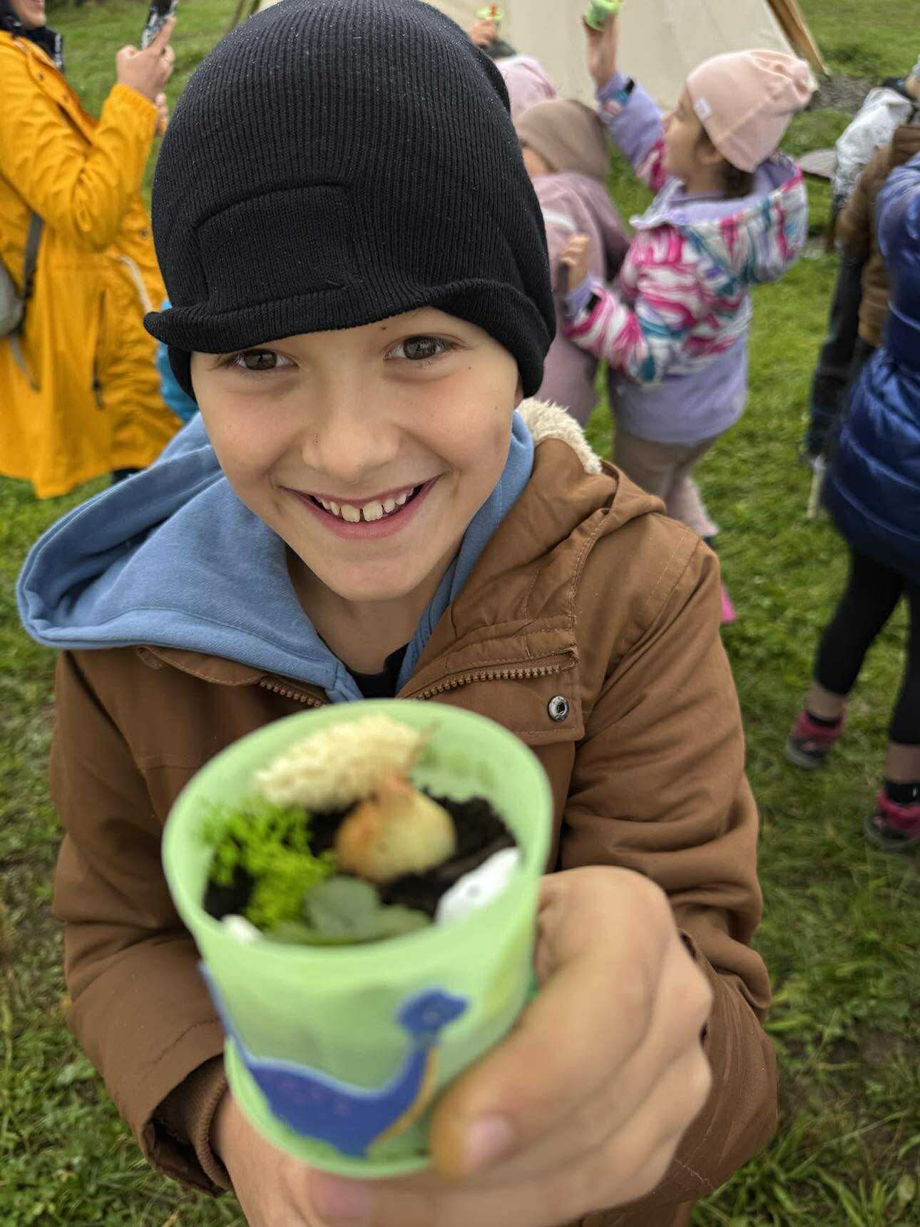W indiańskich wigwamach uczniowie poznawali prawdziwe indiańskie instrumenty i każdy mógł spróbować na nich zagrać. Na zakończenie czekała pyszna niespodzianka – pieczone kiełbaski, które smakowały wyjątkowo po dniu pełnym wrażeń.