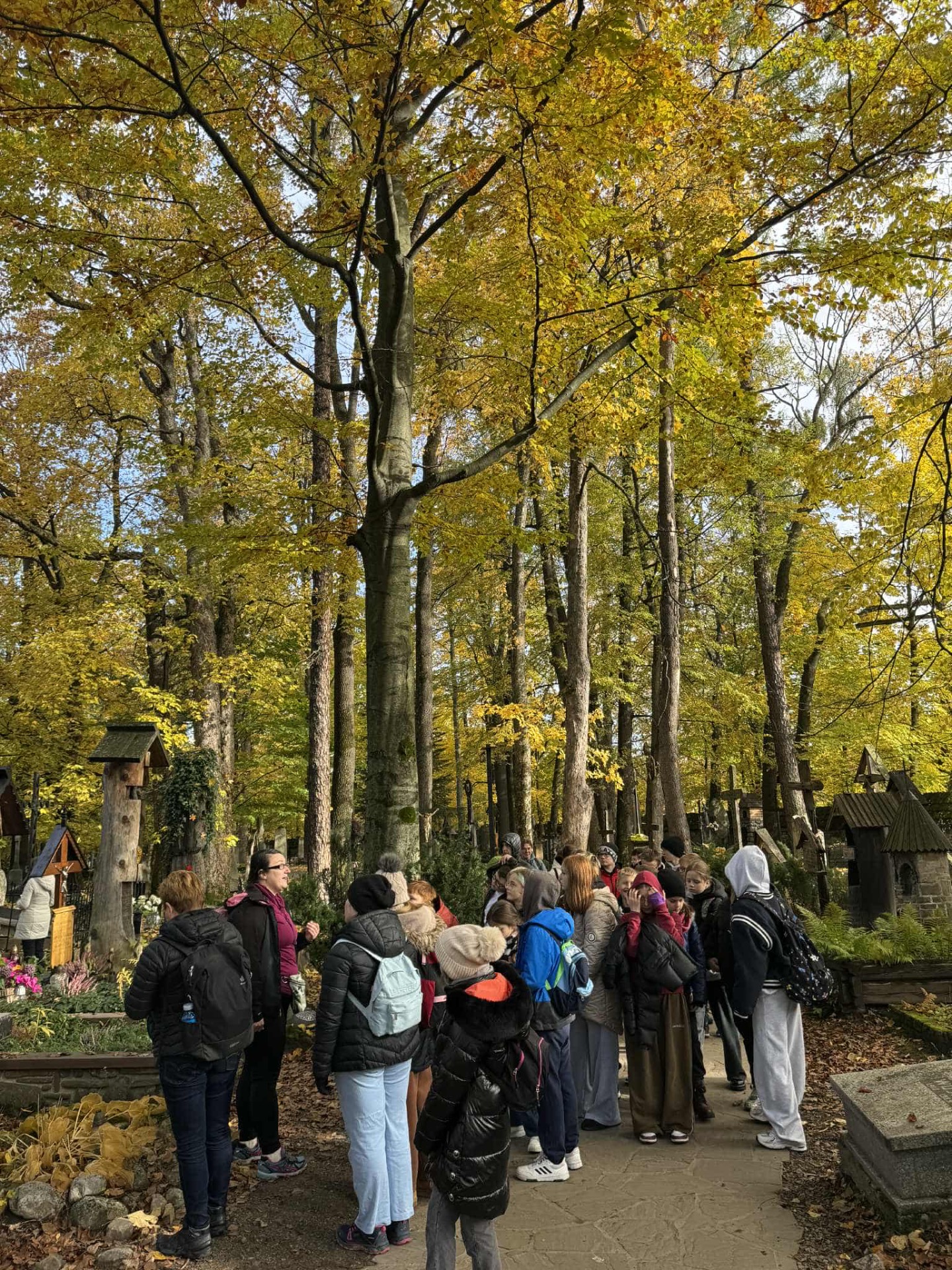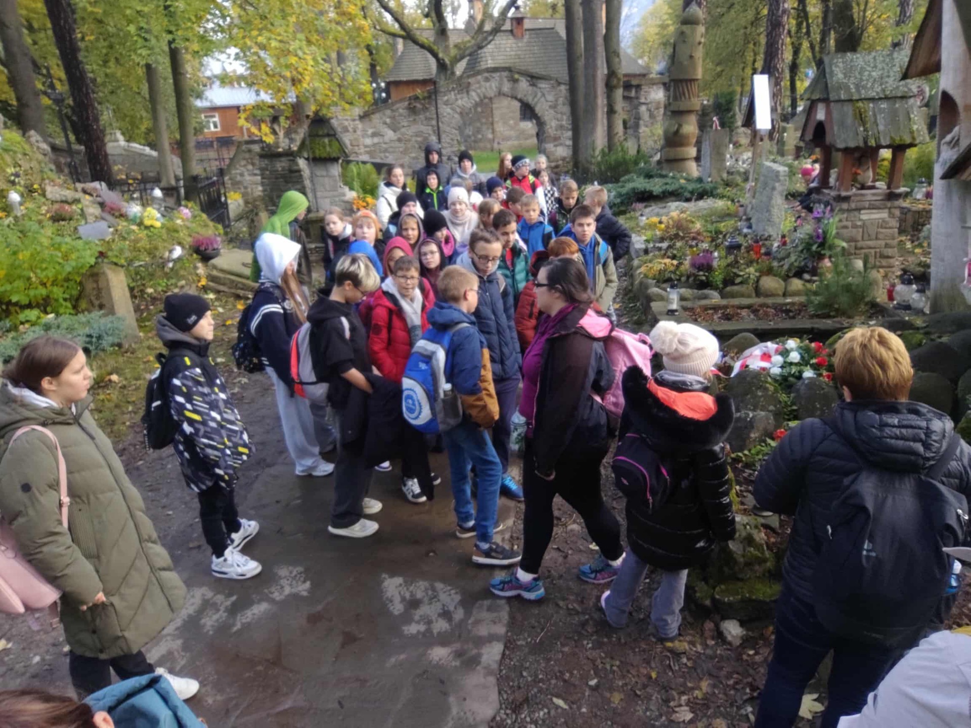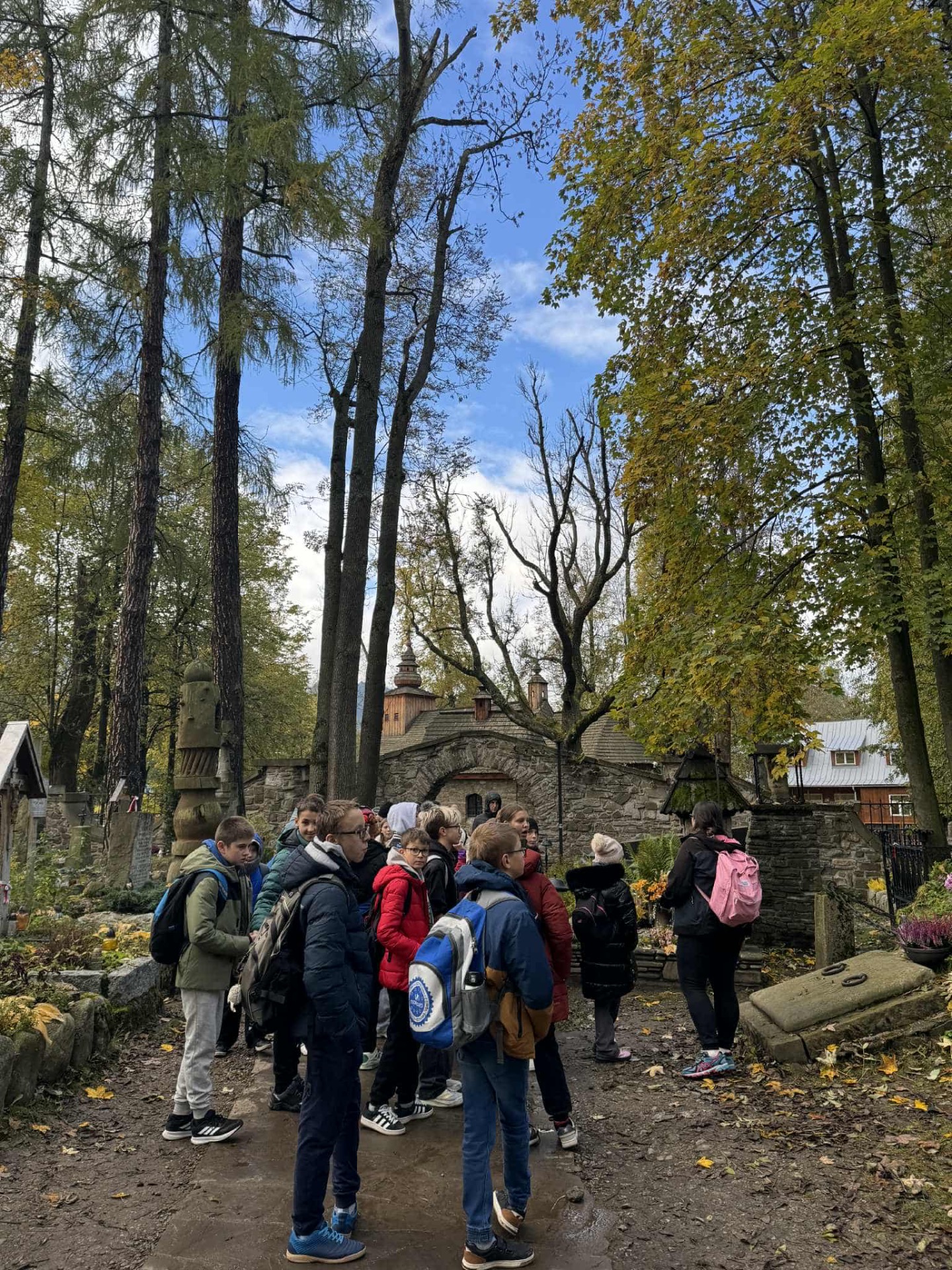 Pierwszym punktem programu był cmentarz na Pęksowym Brzyzku – niezwykłe miejsce pamięci położone w sercu Zakopanego. Wśród zabytkowych nagrobków, ozdobionych góralskimi motywami, uczniowie odwiedzili groby znanych osób związanych z Tatrami i kulturą Podhala, m.in. Stanisława Marusarza, Kornela Makuszyńskiego, Tytusa Chałubińskiego i Kazimierza Przerwy-Tetmajera. Spacer w jesiennej scenerii sprzyjał zadumie i refleksji nad historią regionu.